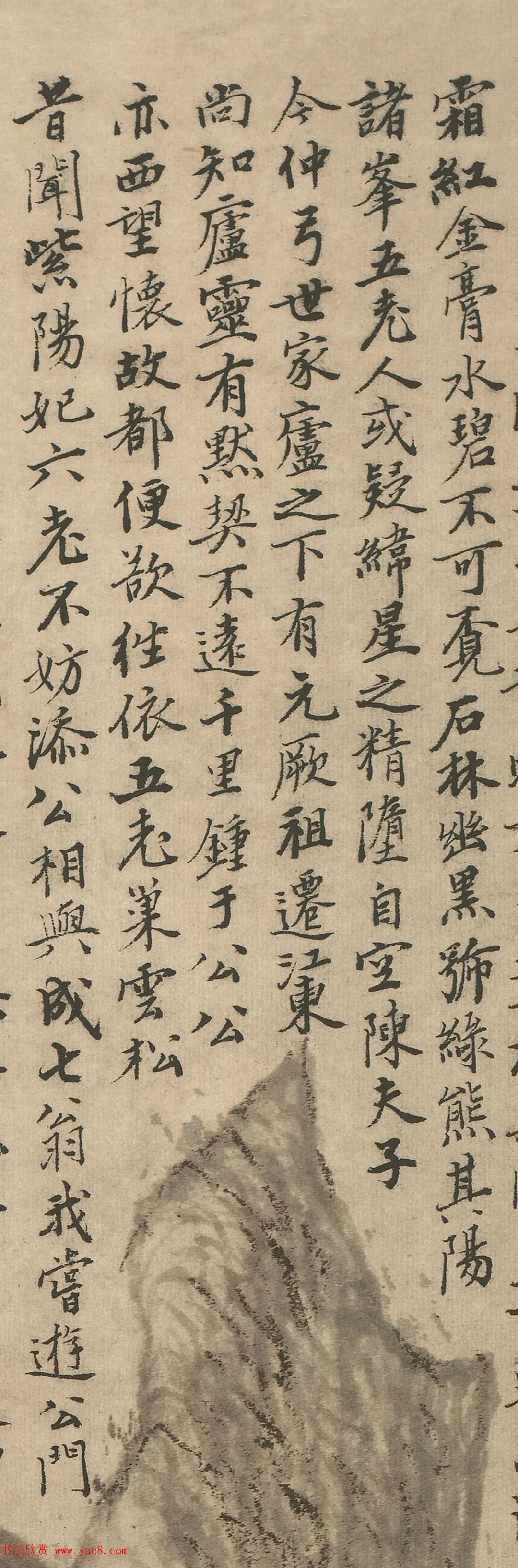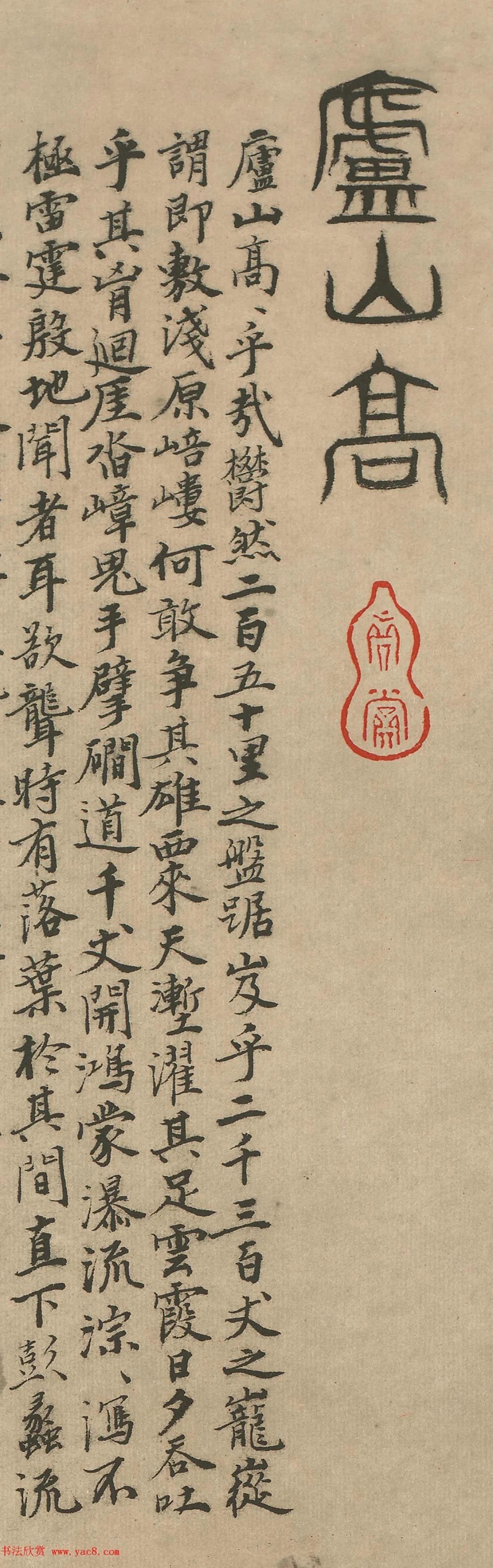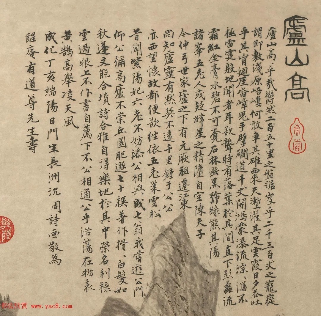 这是一幅沈周送给其老师陈宽(醒庵)70岁生日的祝寿画,以庐山的崇高博大赞誉其师。图绘庐山崇山峻岭,岩石层叠陡峭,山峰巍峨壮观,山腰奇松红树,一泓瀑布倾泻而下,山脚流水潺潺;画面刚中带柔,突出老师的博大胸怀。