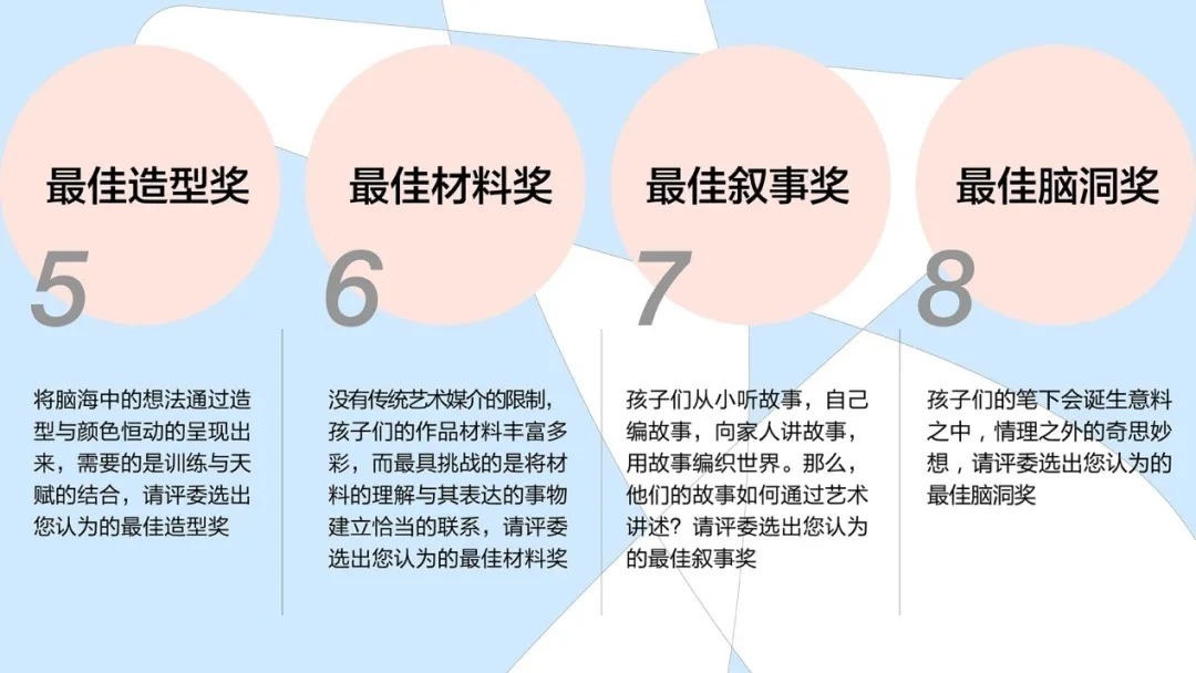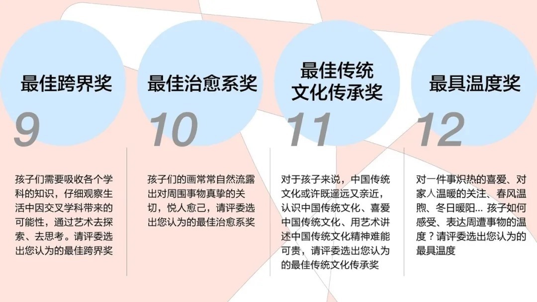此次大赛特别设立了16项主题大奖,冯海涛指出,儿童绘画不像成年人的绘画有很强的指向性,不同年龄段的孩子关注的视角是多样的。正因如此,通过与国内多位知名的儿童美育专家的数次交流与研讨,此次大赛根据不同年龄段儿童心理发展的特殊性,以及结合上一届参赛作品中体现出来的特点,制定了一系列特别的奖项。除了关注作品视觉语言的诸多奖项外,更多着眼于儿童创作心理与思维,如“最佳治愈奖”“最具温度奖”“最佳脑洞奖”等,而“鲁信公益奖”的设立也重点关注到了特殊儿童群体。