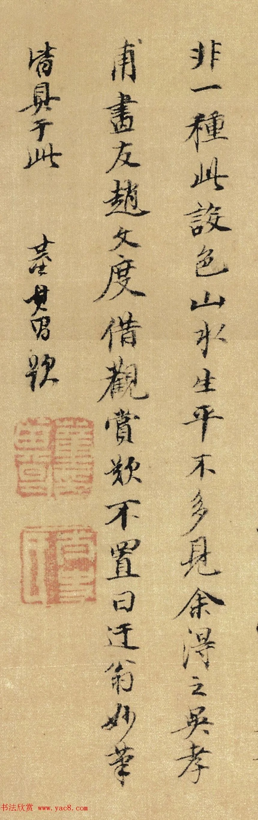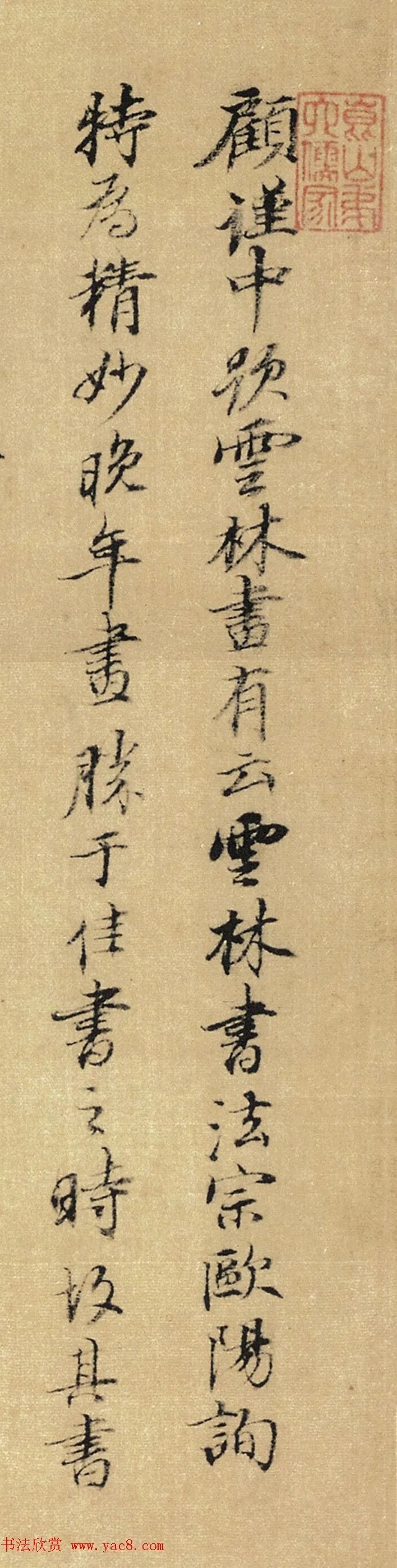 释文:顾谨中题云林书有云:‘云林书法宗欧阳询,特为精妙。晚年画胜,于佳书之时,故其书非一种。’此设色山水生平不多见,余得之吴孝甫画友赵文度,借观赏叹不置,曰:迂翁妙笔皆具于此!董其昌题。
