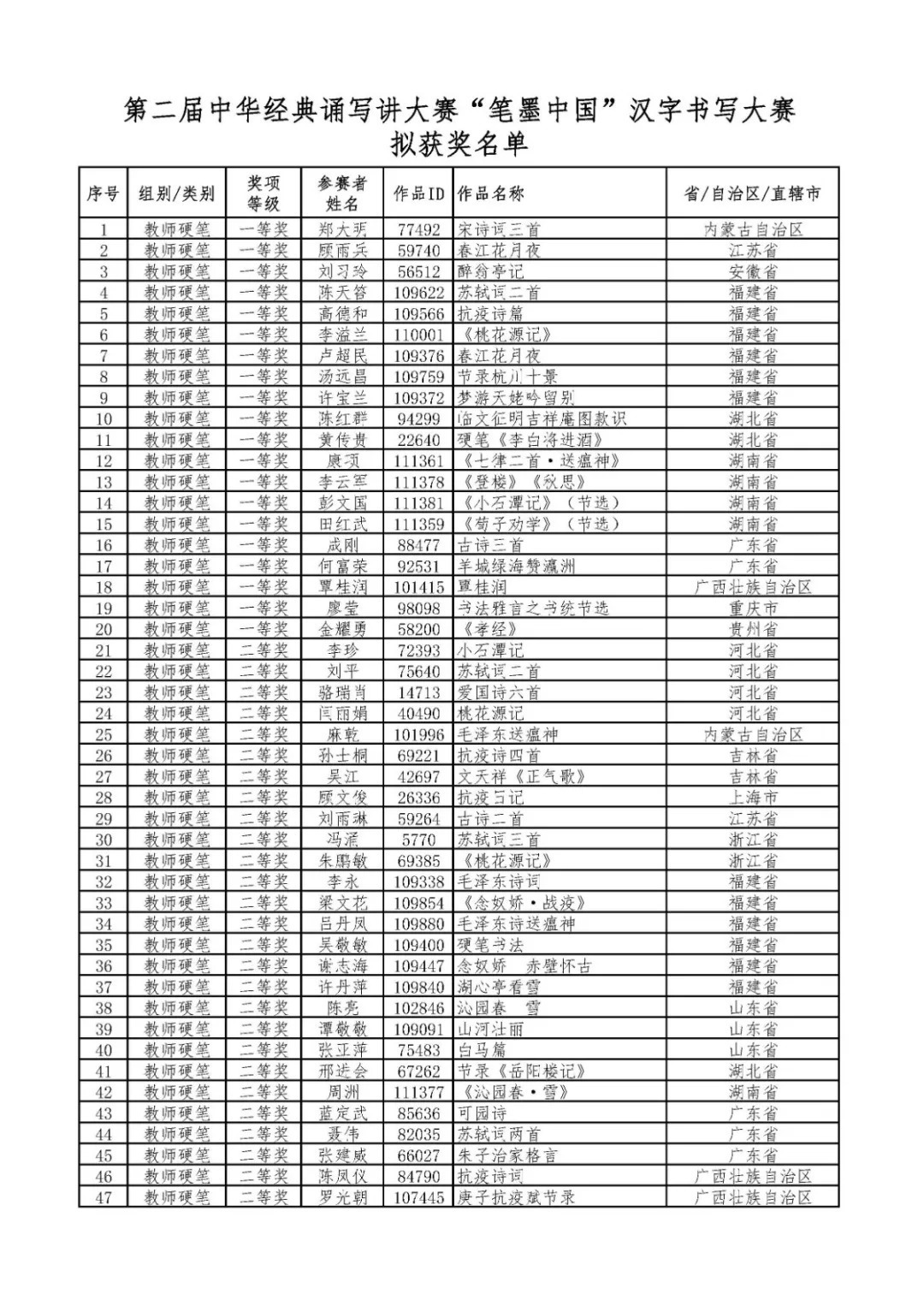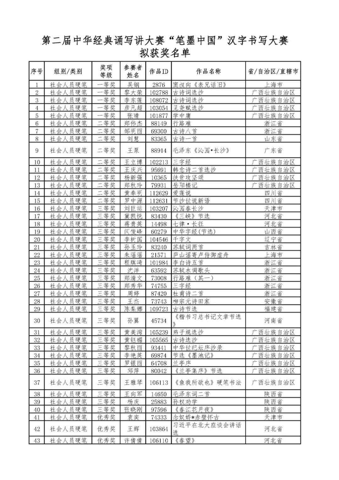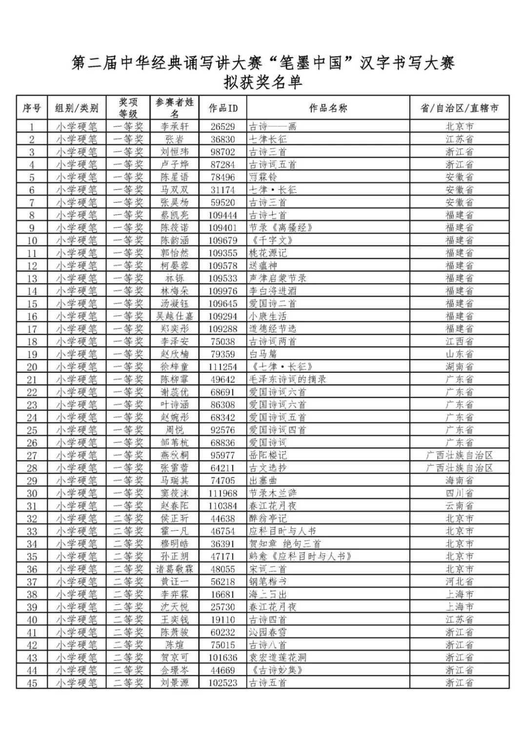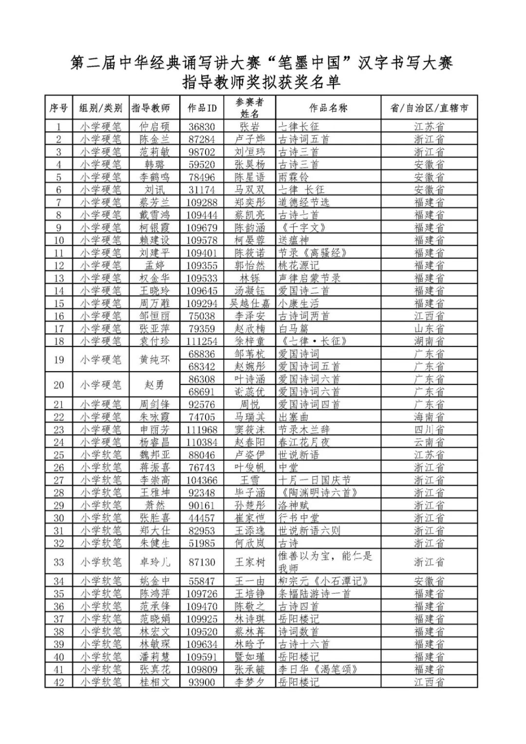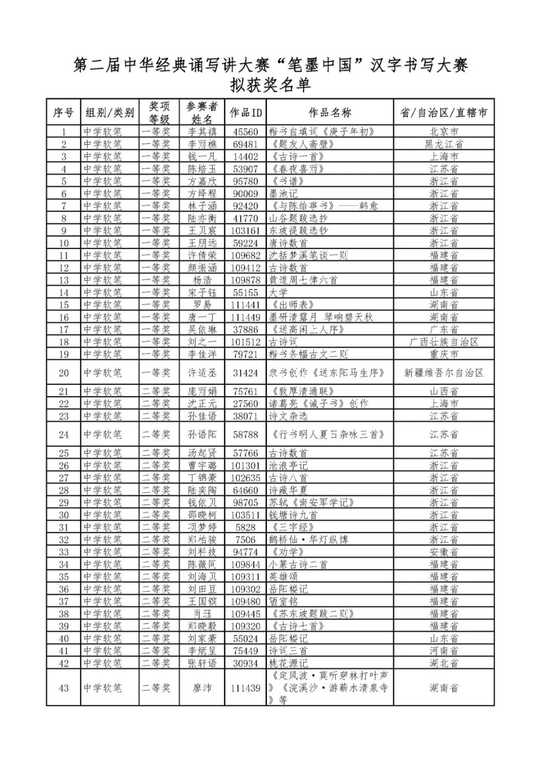 根据《教育部办公厅关于举办第二届中华经典诵写讲大赛的通知》(教语用厅函〔2020〕1号)精神,2020年5月10日至8月10日,“笔墨中国”汉字书写大赛完成了初赛作品征集,共收到参赛作品近12万件。9月-10月,经过初赛、决赛评审,共评选出硬笔类小学组、中学组、大学组、教师组、社会人员组;软笔类小学组、中学组、大学组、教师组、社会人员组共10个组别,总计3336件获奖作品,指导教师奖117名。现将获奖名单公示如下,公示期7天(11月6日—11月13日)。 公示期间接受举报,如经查实代笔或假借作品等问题的,将取消获奖资格。若对获奖名单有异议,请于11月13日16:30前,向赛事承办方实名反馈。反馈邮箱:bmzg@ywcbs.com。 特此公示。 第二届中华经典诵写讲大赛组委会 2020年11月6日