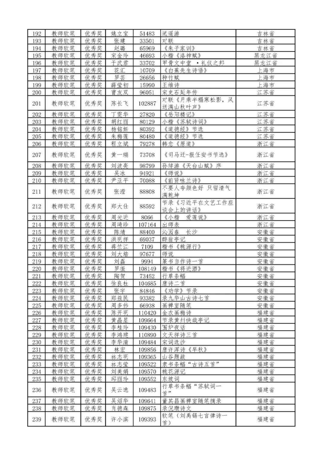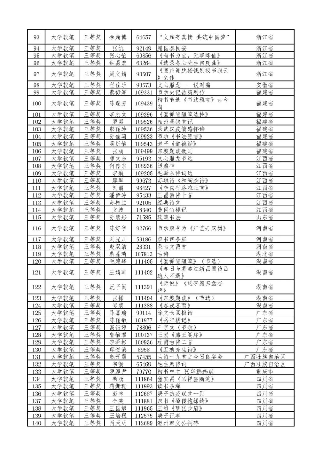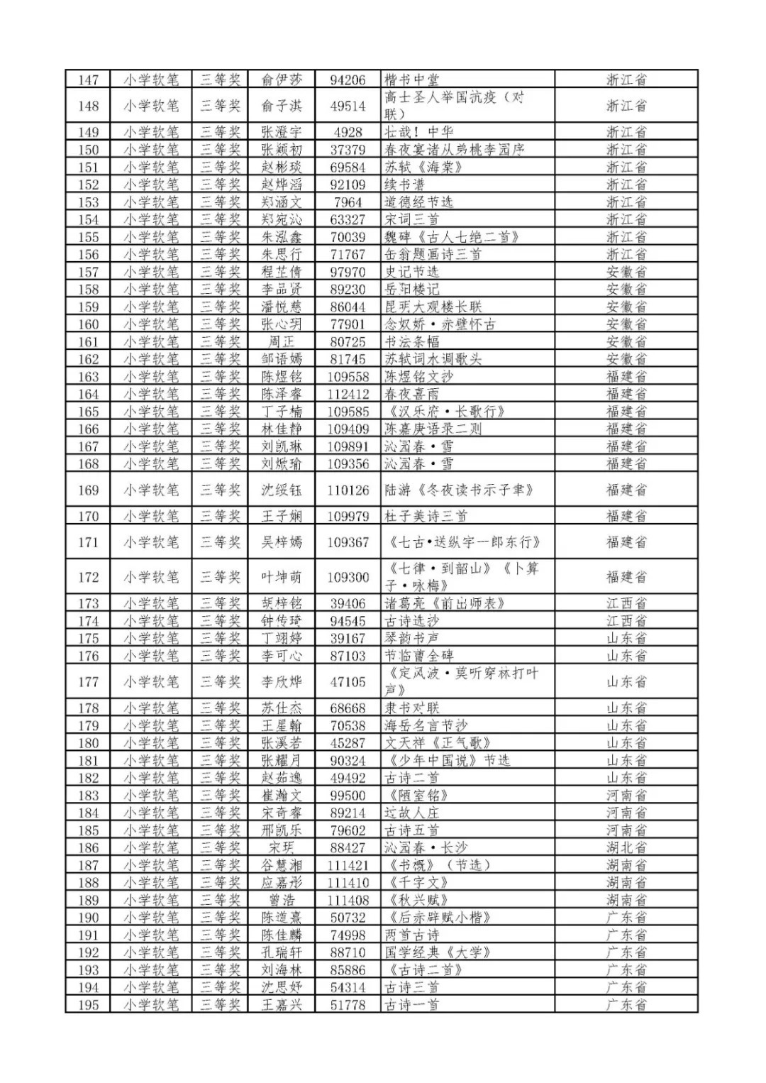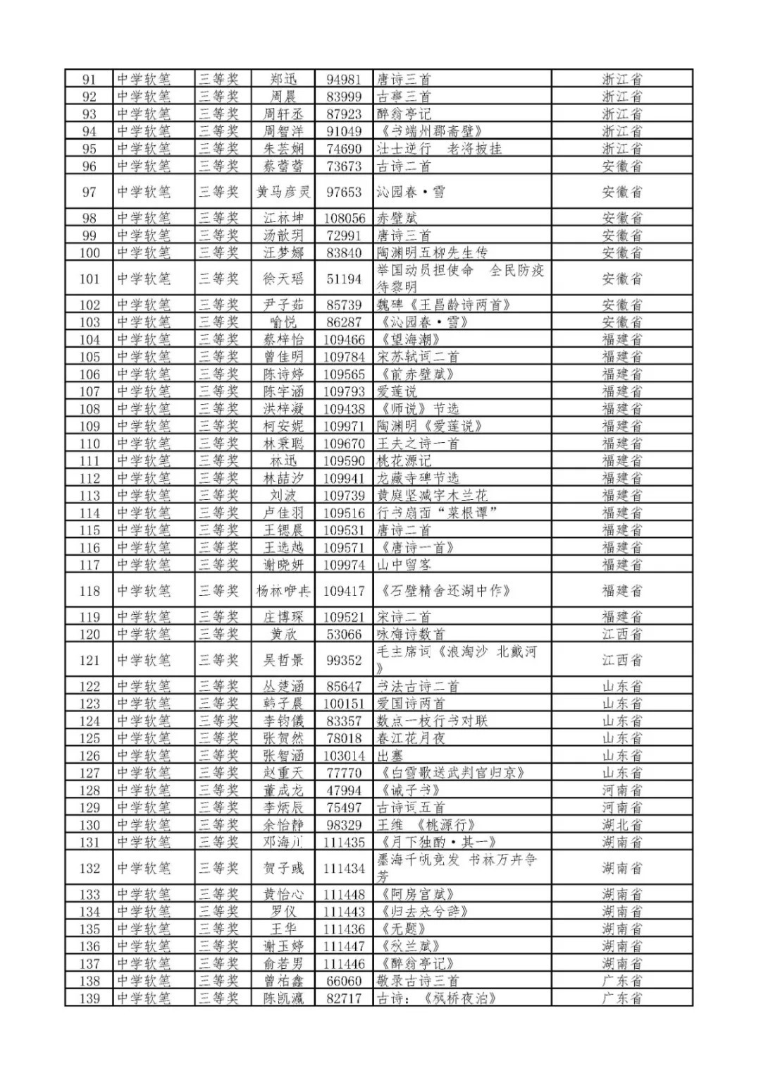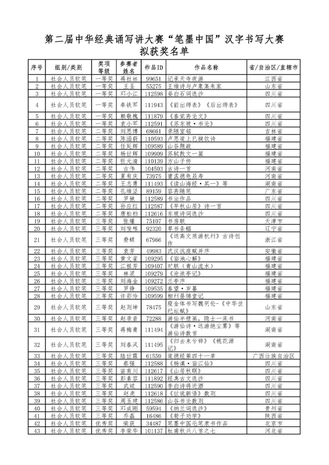 根据《教育部办公厅关于举办第二届中华经典诵写讲大赛的通知》(教语用厅函〔2020〕1号)精神,2020年5月10日至8月10日,“笔墨中国”汉字书写大赛完成了初赛作品征集,共收到参赛作品近12万件。9月-10月,经过初赛、决赛评审,共评选出硬笔类小学组、中学组、大学组、教师组、社会人员组;软笔类小学组、中学组、大学组、教师组、社会人员组共10个组别,总计3336件获奖作品,指导教师奖117名。现将获奖名单公示如下,公示期7天(11月6日—11月13日)。 公示期间接受举报,如经查实代笔或假借作品等问题的,将取消获奖资格。若对获奖名单有异议,请于11月13日16:30前,向赛事承办方实名反馈。反馈邮箱:bmzg@ywcbs.com。 特此公示。 第二届中华经典诵写讲大赛组委会 2020年11月6日