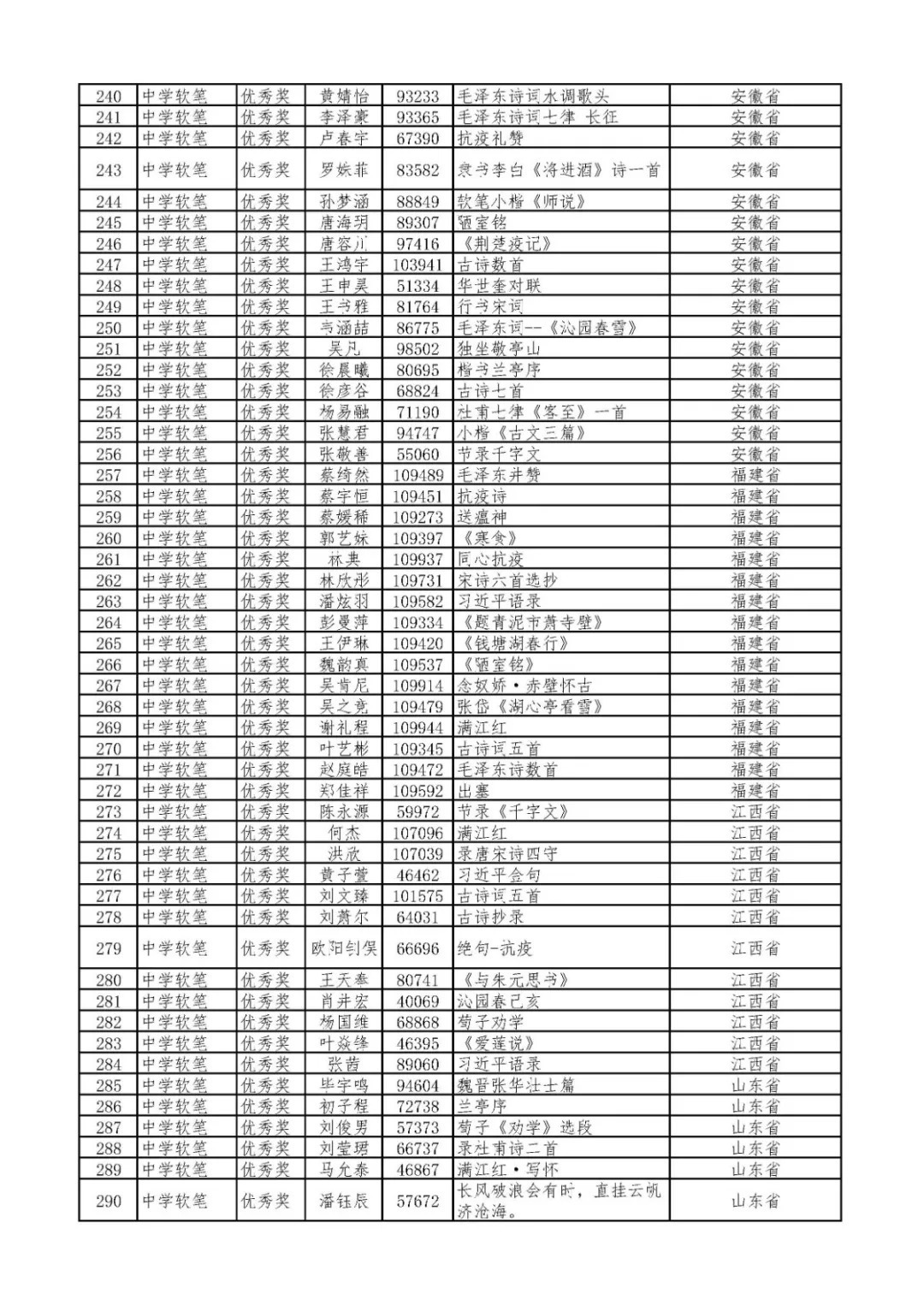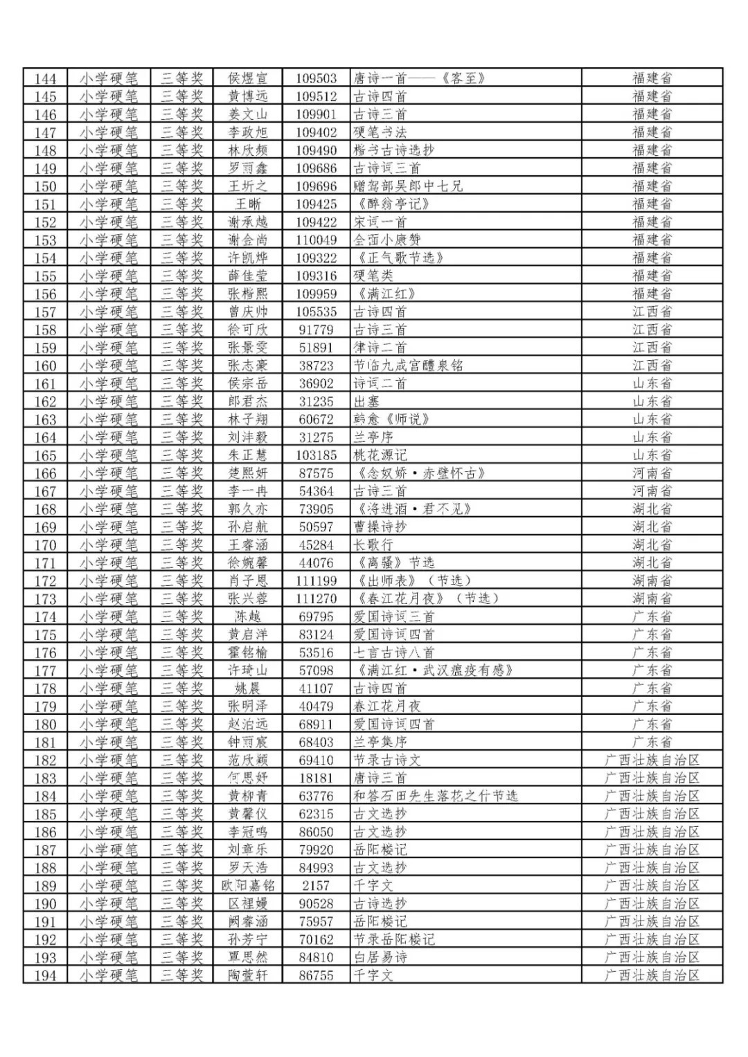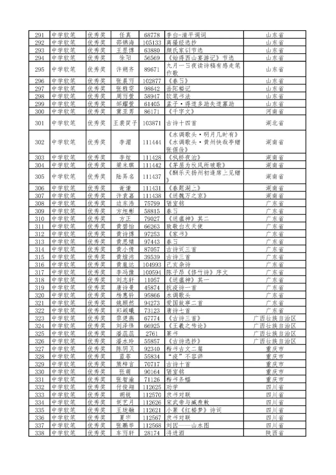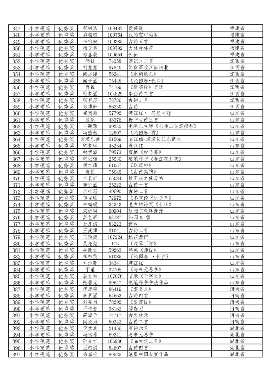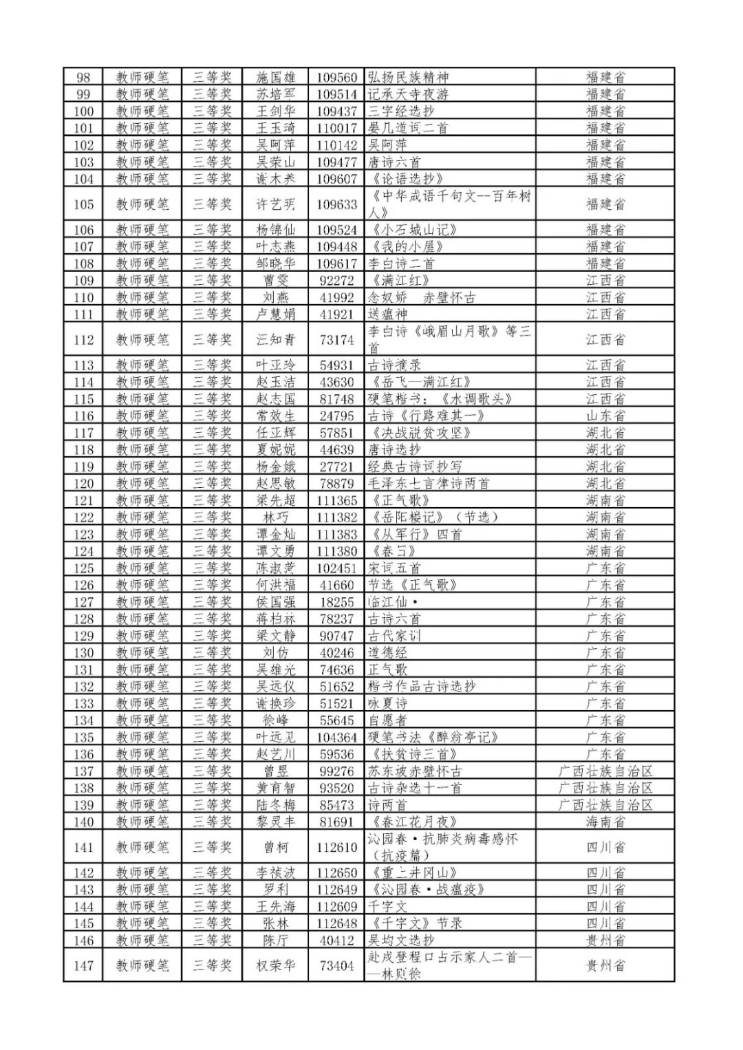 根据《教育部办公厅关于举办第二届中华经典诵写讲大赛的通知》(教语用厅函〔2020〕1号)精神,2020年5月10日至8月10日,“笔墨中国”汉字书写大赛完成了初赛作品征集,共收到参赛作品近12万件。9月-10月,经过初赛、决赛评审,共评选出硬笔类小学组、中学组、大学组、教师组、社会人员组;软笔类小学组、中学组、大学组、教师组、社会人员组共10个组别,总计3336件获奖作品,指导教师奖117名。现将获奖名单公示如下,公示期7天(11月6日—11月13日)。 公示期间接受举报,如经查实代笔或假借作品等问题的,将取消获奖资格。若对获奖名单有异议,请于11月13日16:30前,向赛事承办方实名反馈。反馈邮箱:bmzg@ywcbs.com。 特此公示。 第二届中华经典诵写讲大赛组委会 2020年11月6日