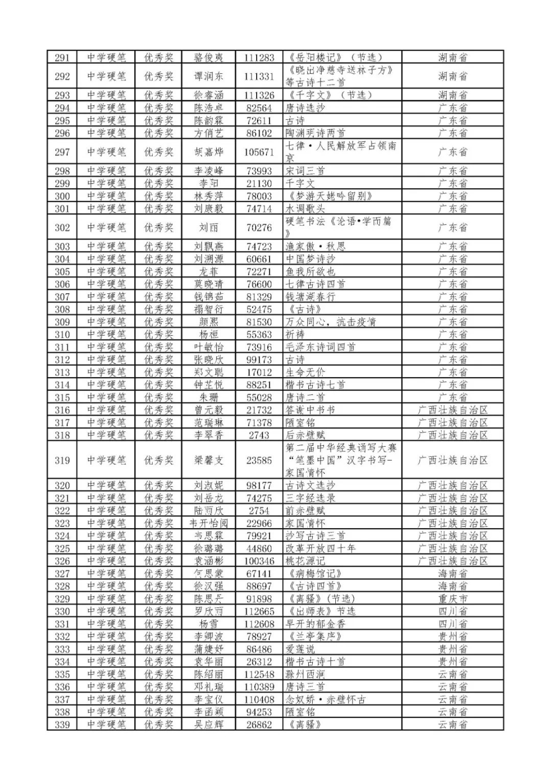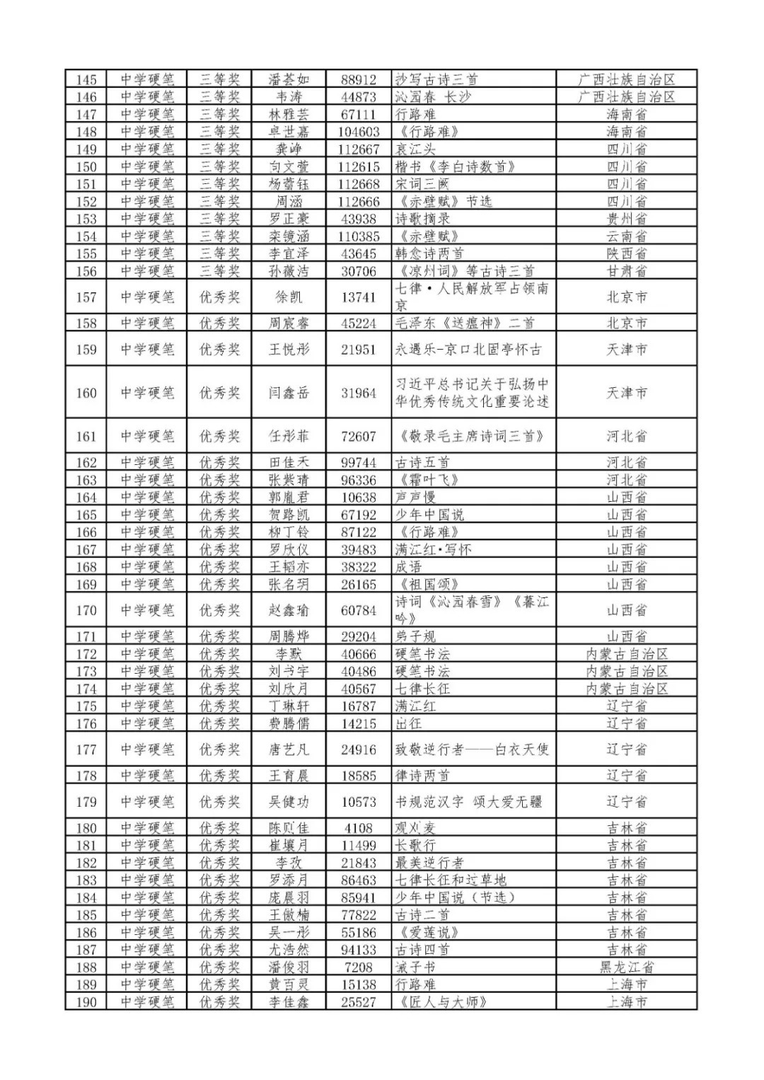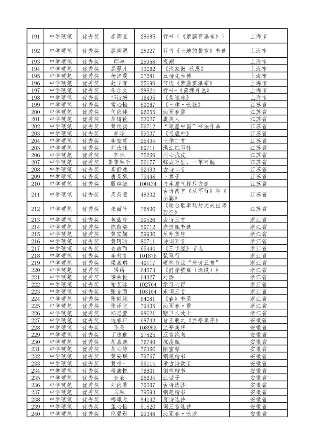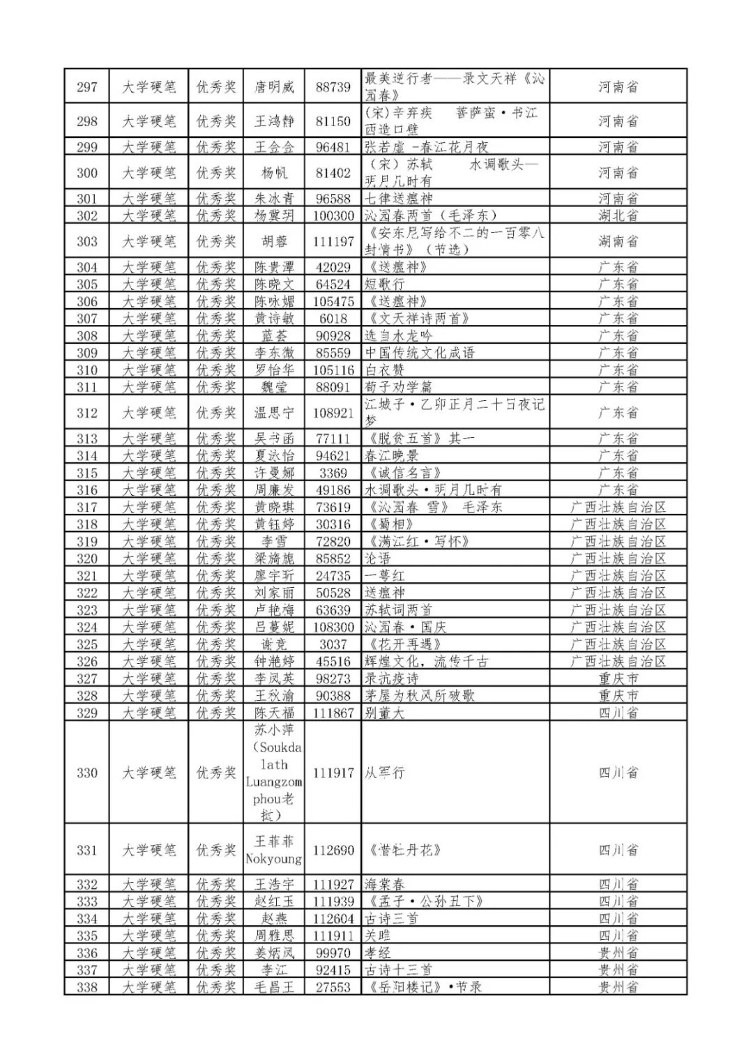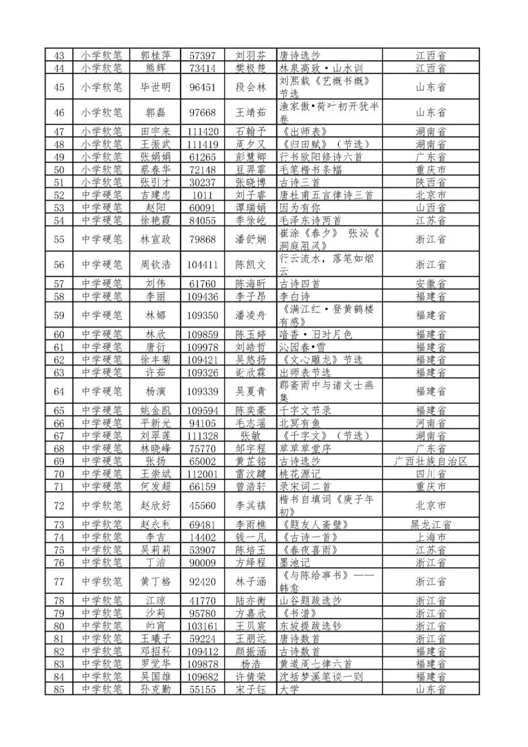 根据《教育部办公厅关于举办第二届中华经典诵写讲大赛的通知》(教语用厅函〔2020〕1号)精神,2020年5月10日至8月10日,“笔墨中国”汉字书写大赛完成了初赛作品征集,共收到参赛作品近12万件。9月-10月,经过初赛、决赛评审,共评选出硬笔类小学组、中学组、大学组、教师组、社会人员组;软笔类小学组、中学组、大学组、教师组、社会人员组共10个组别,总计3336件获奖作品,指导教师奖117名。现将获奖名单公示如下,公示期7天(11月6日—11月13日)。 公示期间接受举报,如经查实代笔或假借作品等问题的,将取消获奖资格。若对获奖名单有异议,请于11月13日16:30前,向赛事承办方实名反馈。反馈邮箱:bmzg@ywcbs.com。 特此公示。 第二届中华经典诵写讲大赛组委会 2020年11月6日