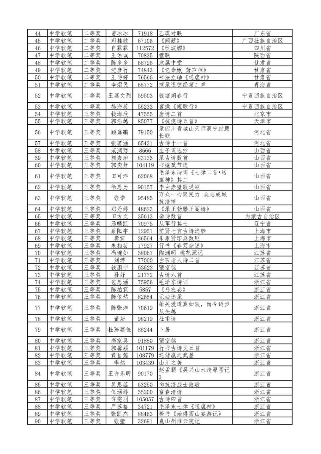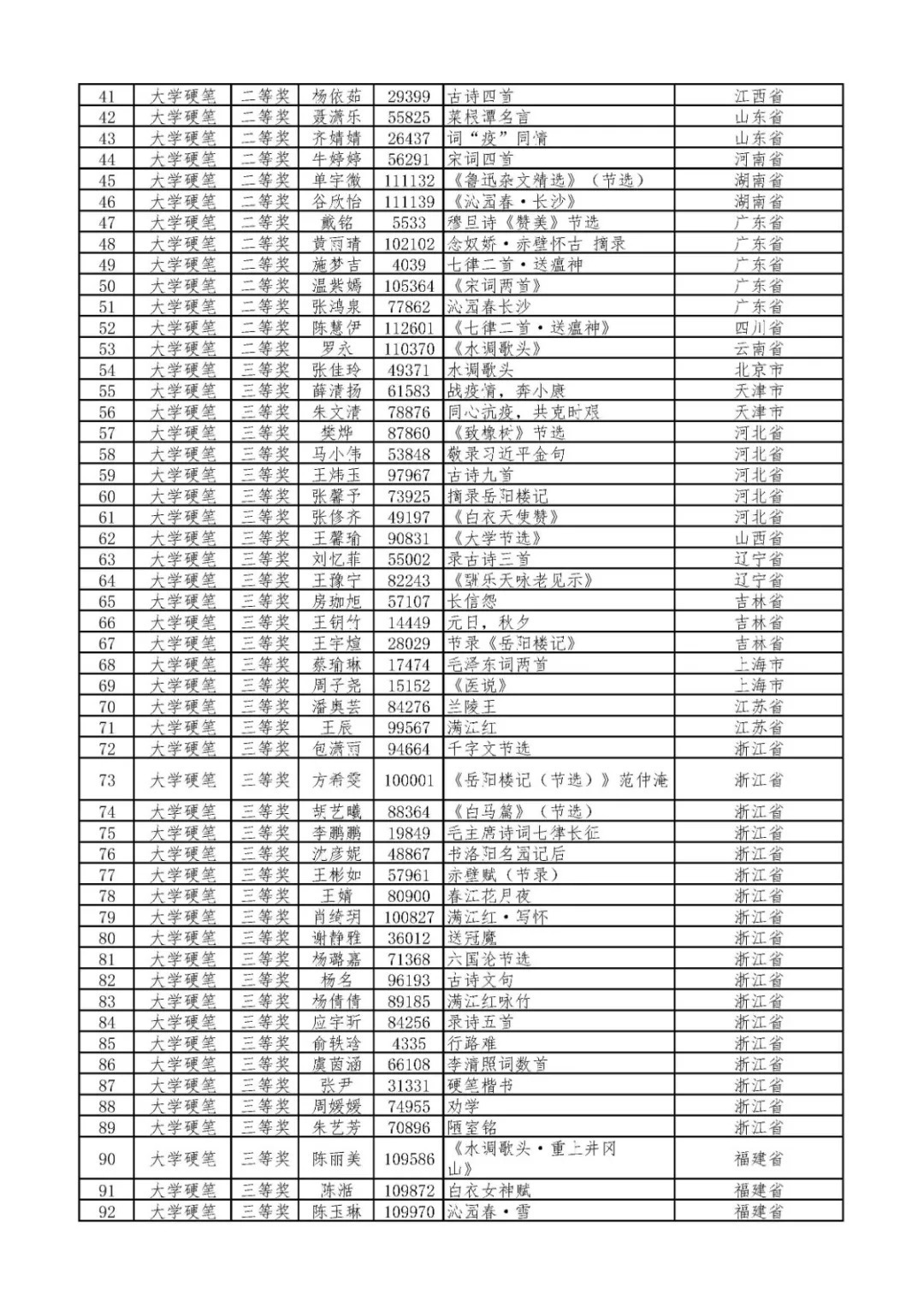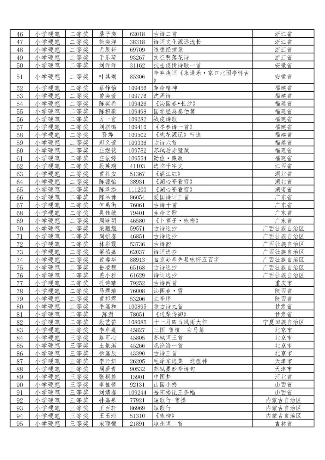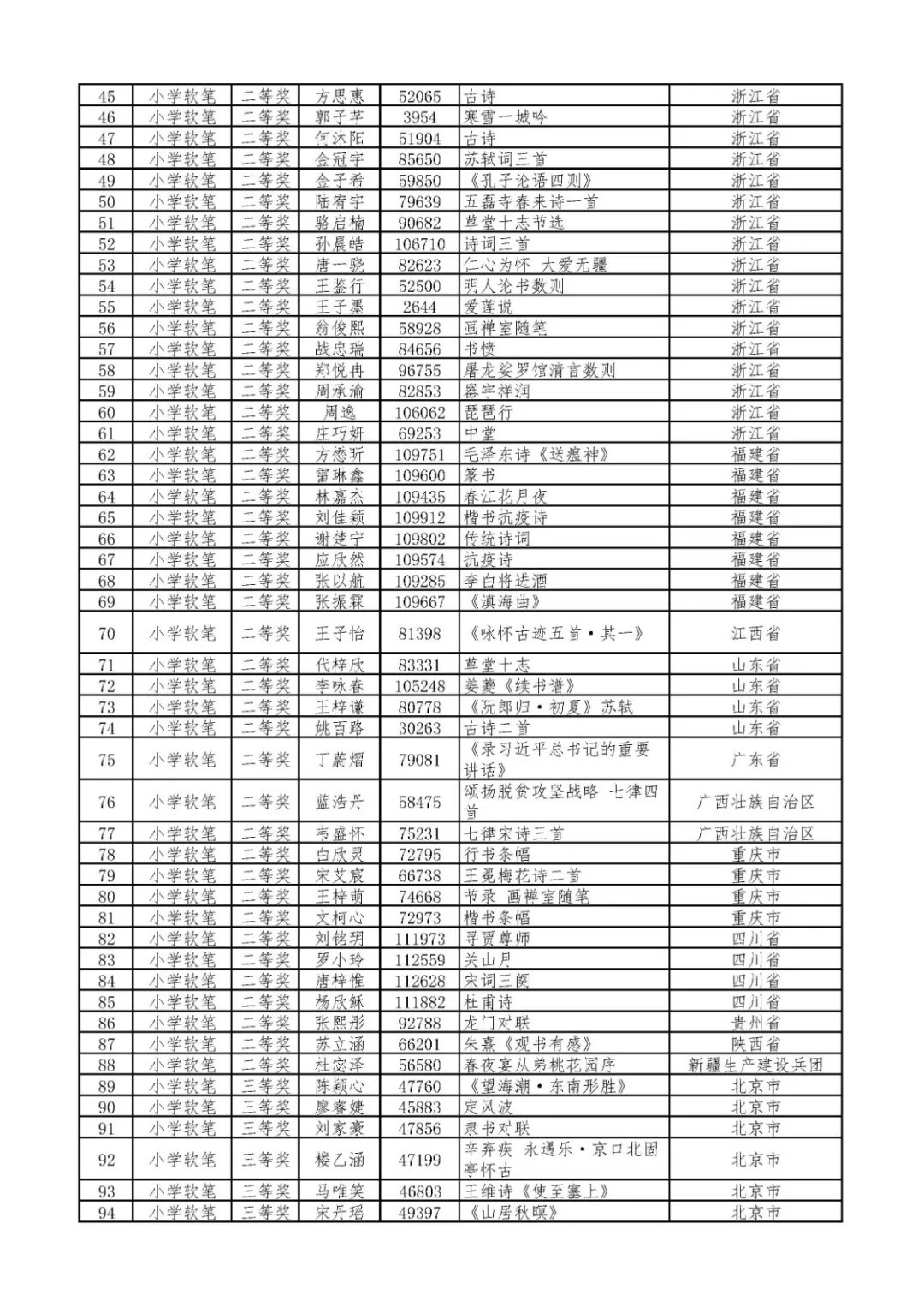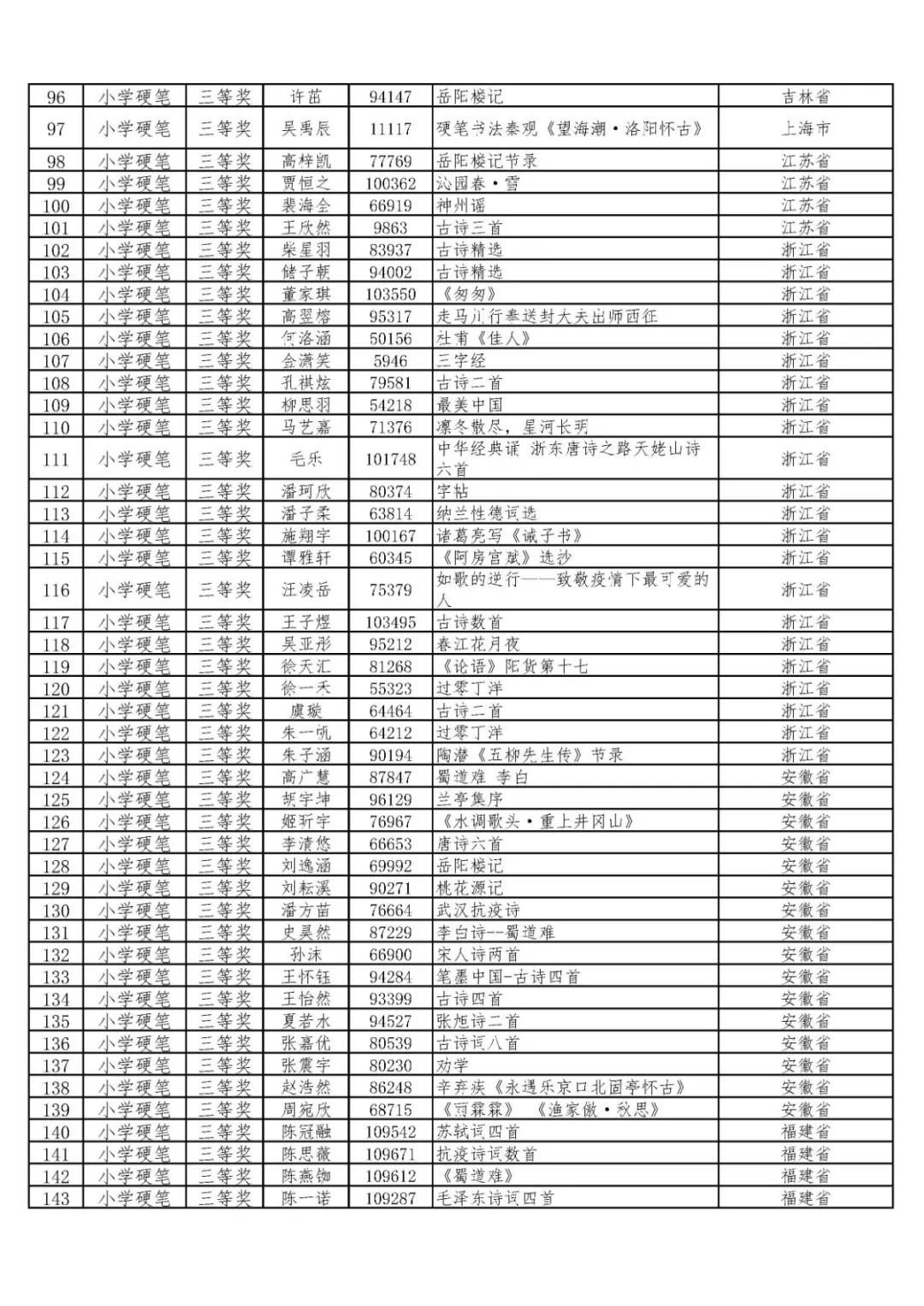 根据《教育部办公厅关于举办第二届中华经典诵写讲大赛的通知》(教语用厅函〔2020〕1号)精神,2020年5月10日至8月10日,“笔墨中国”汉字书写大赛完成了初赛作品征集,共收到参赛作品近12万件。9月-10月,经过初赛、决赛评审,共评选出硬笔类小学组、中学组、大学组、教师组、社会人员组;软笔类小学组、中学组、大学组、教师组、社会人员组共10个组别,总计3336件获奖作品,指导教师奖117名。现将获奖名单公示如下,公示期7天(11月6日—11月13日)。 公示期间接受举报,如经查实代笔或假借作品等问题的,将取消获奖资格。若对获奖名单有异议,请于11月13日16:30前,向赛事承办方实名反馈。反馈邮箱:bmzg@ywcbs.com。 特此公示。 第二届中华经典诵写讲大赛组委会 2020年11月6日