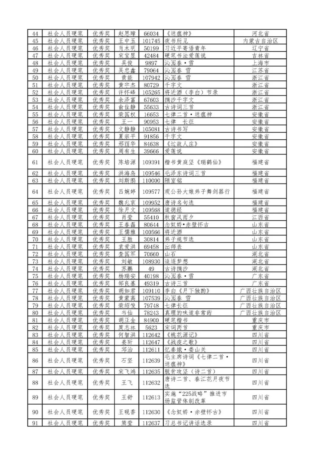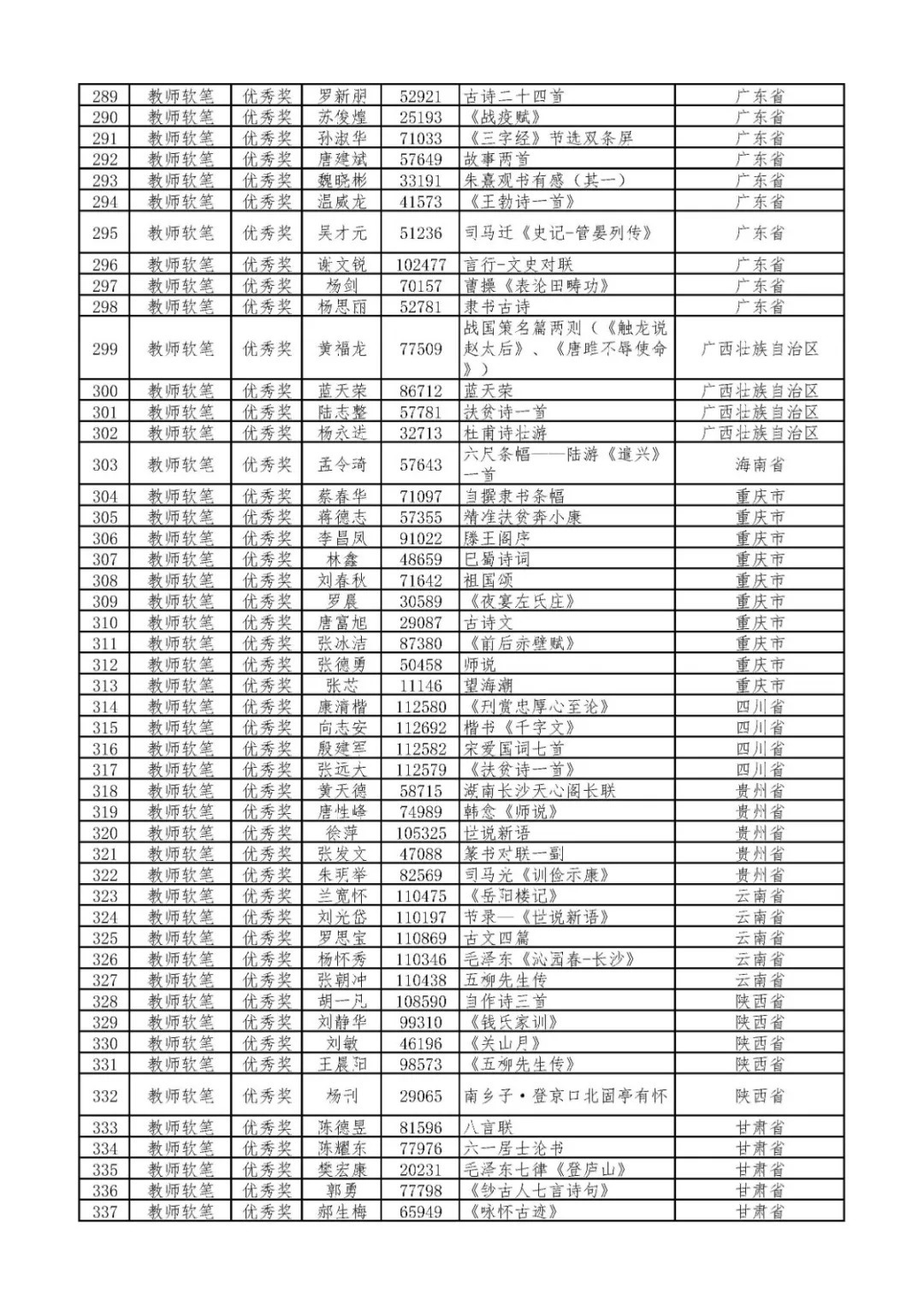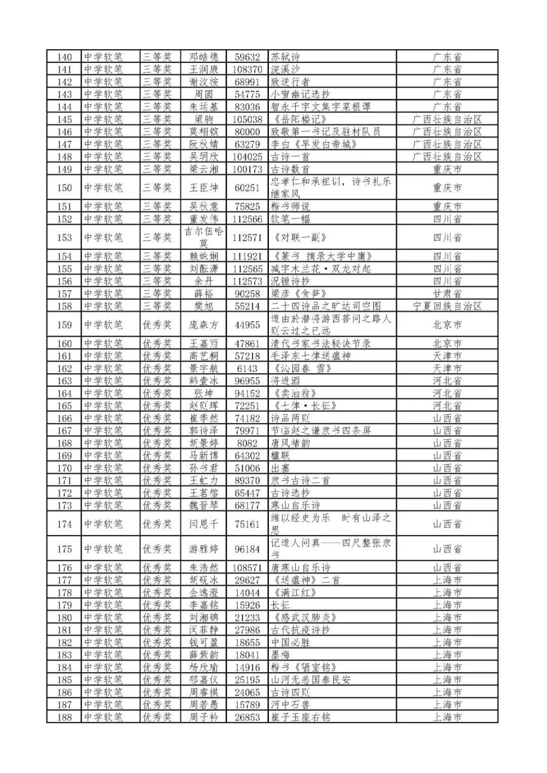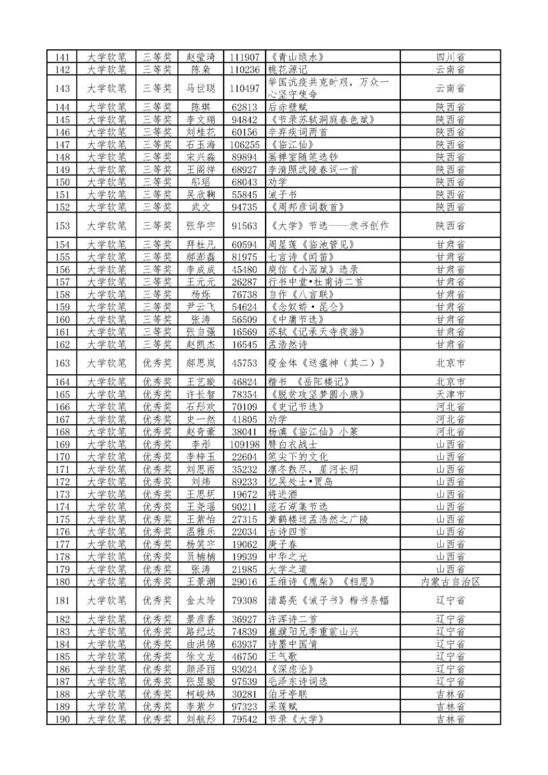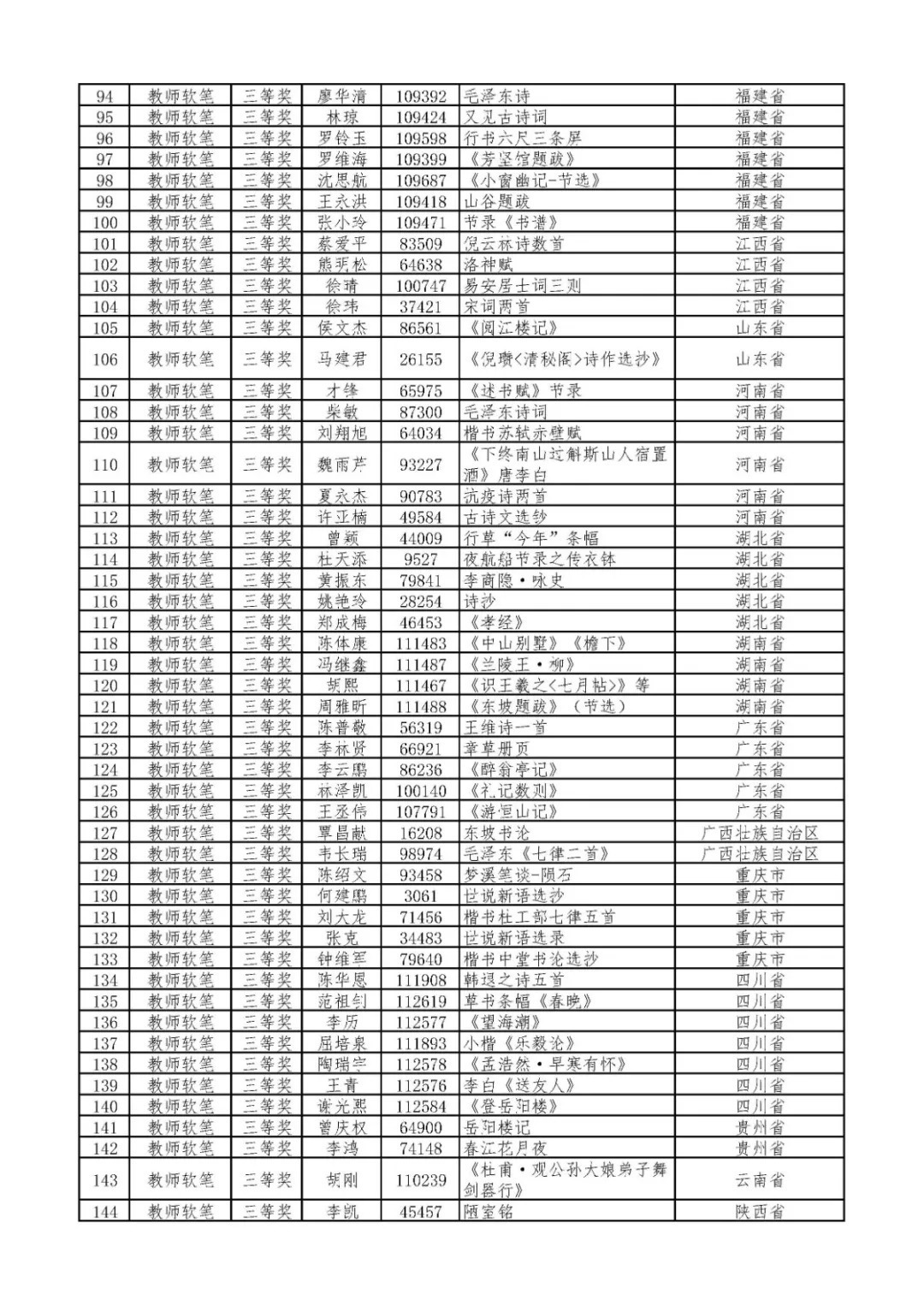 根据《教育部办公厅关于举办第二届中华经典诵写讲大赛的通知》(教语用厅函〔2020〕1号)精神,2020年5月10日至8月10日,“笔墨中国”汉字书写大赛完成了初赛作品征集,共收到参赛作品近12万件。9月-10月,经过初赛、决赛评审,共评选出硬笔类小学组、中学组、大学组、教师组、社会人员组;软笔类小学组、中学组、大学组、教师组、社会人员组共10个组别,总计3336件获奖作品,指导教师奖117名。现将获奖名单公示如下,公示期7天(11月6日—11月13日)。 公示期间接受举报,如经查实代笔或假借作品等问题的,将取消获奖资格。若对获奖名单有异议,请于11月13日16:30前,向赛事承办方实名反馈。反馈邮箱:bmzg@ywcbs.com。 特此公示。 第二届中华经典诵写讲大赛组委会 2020年11月6日