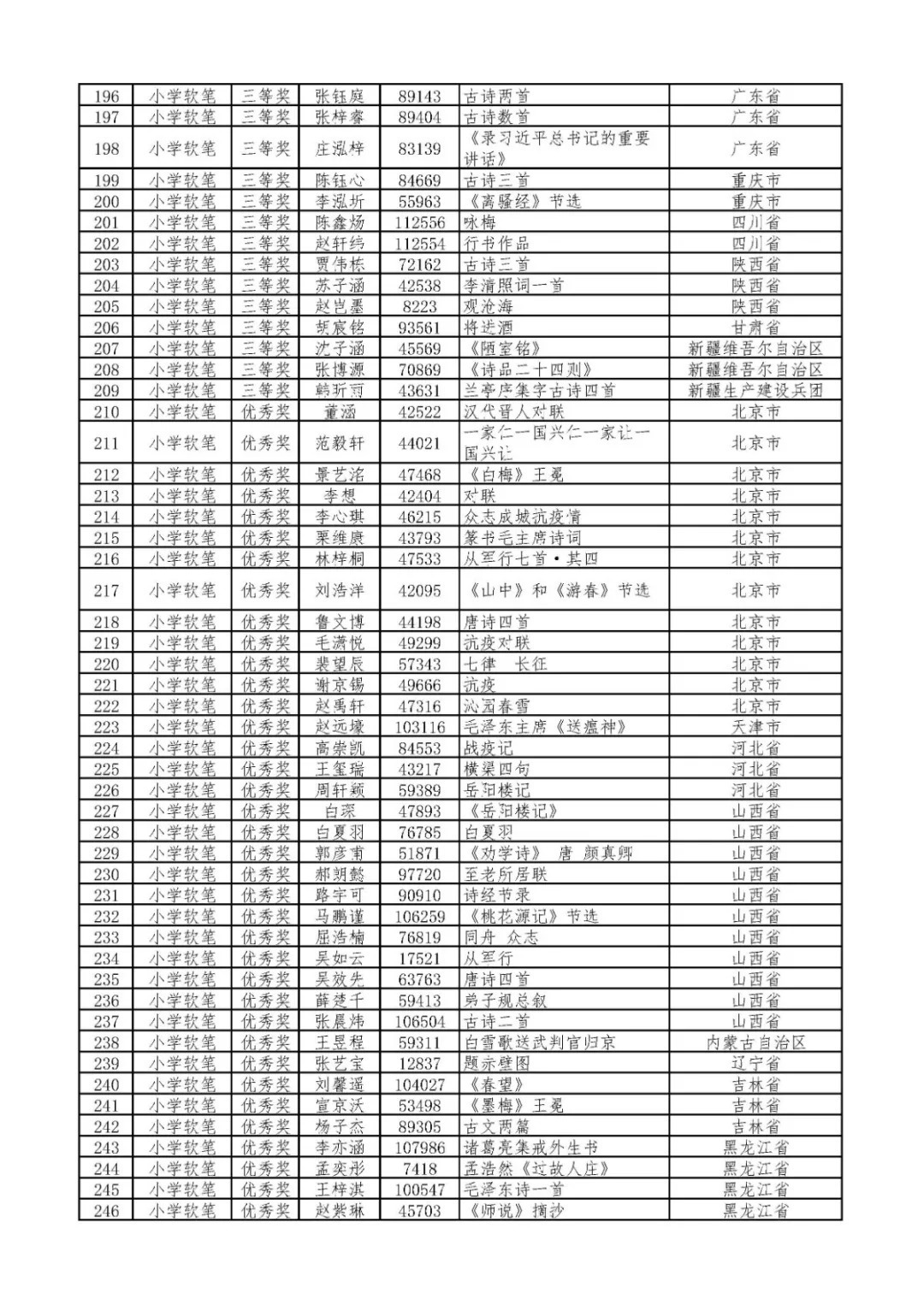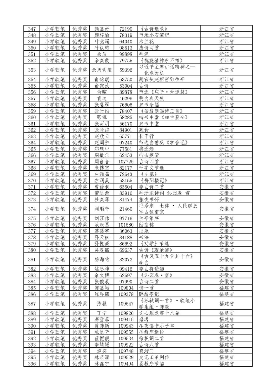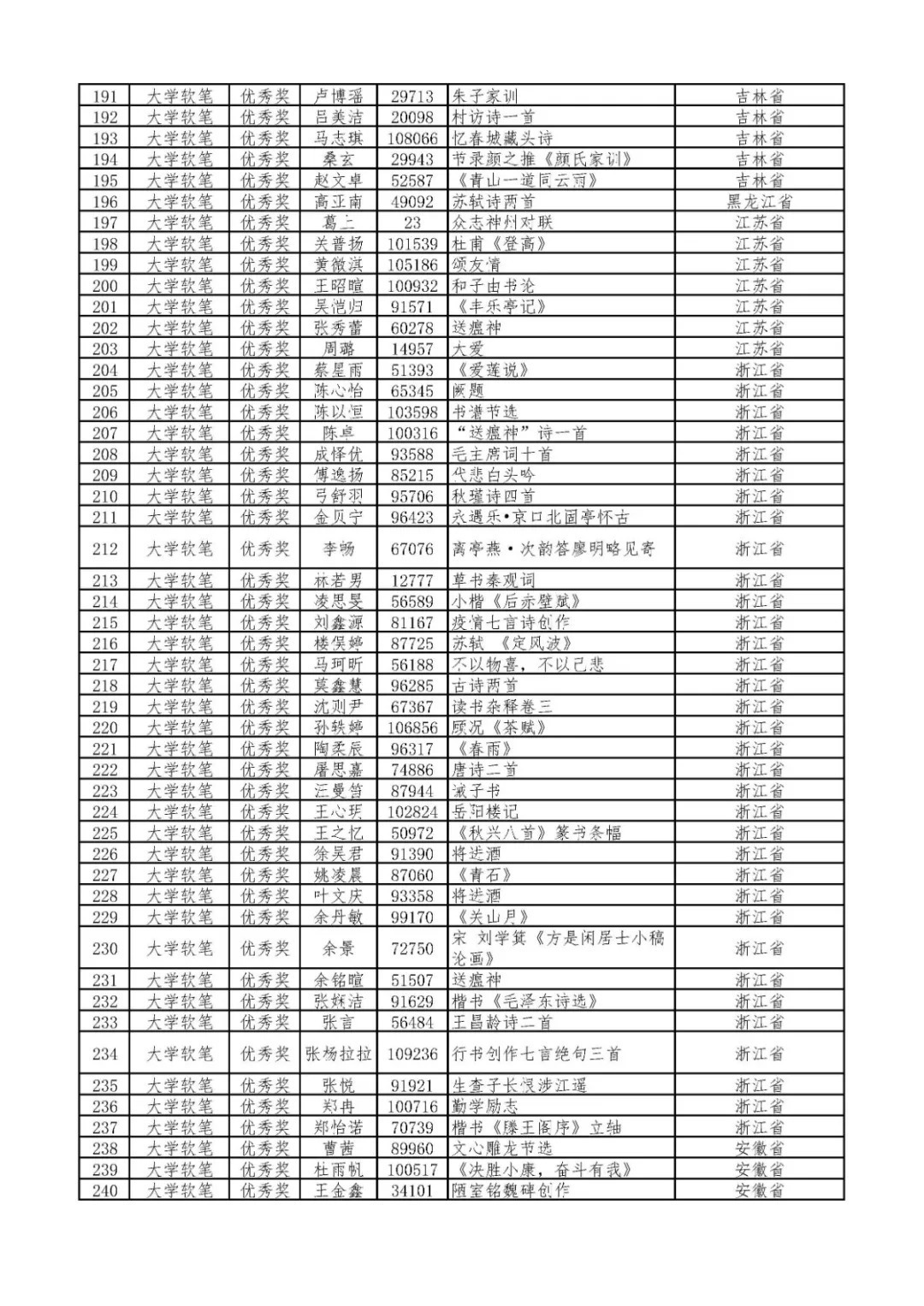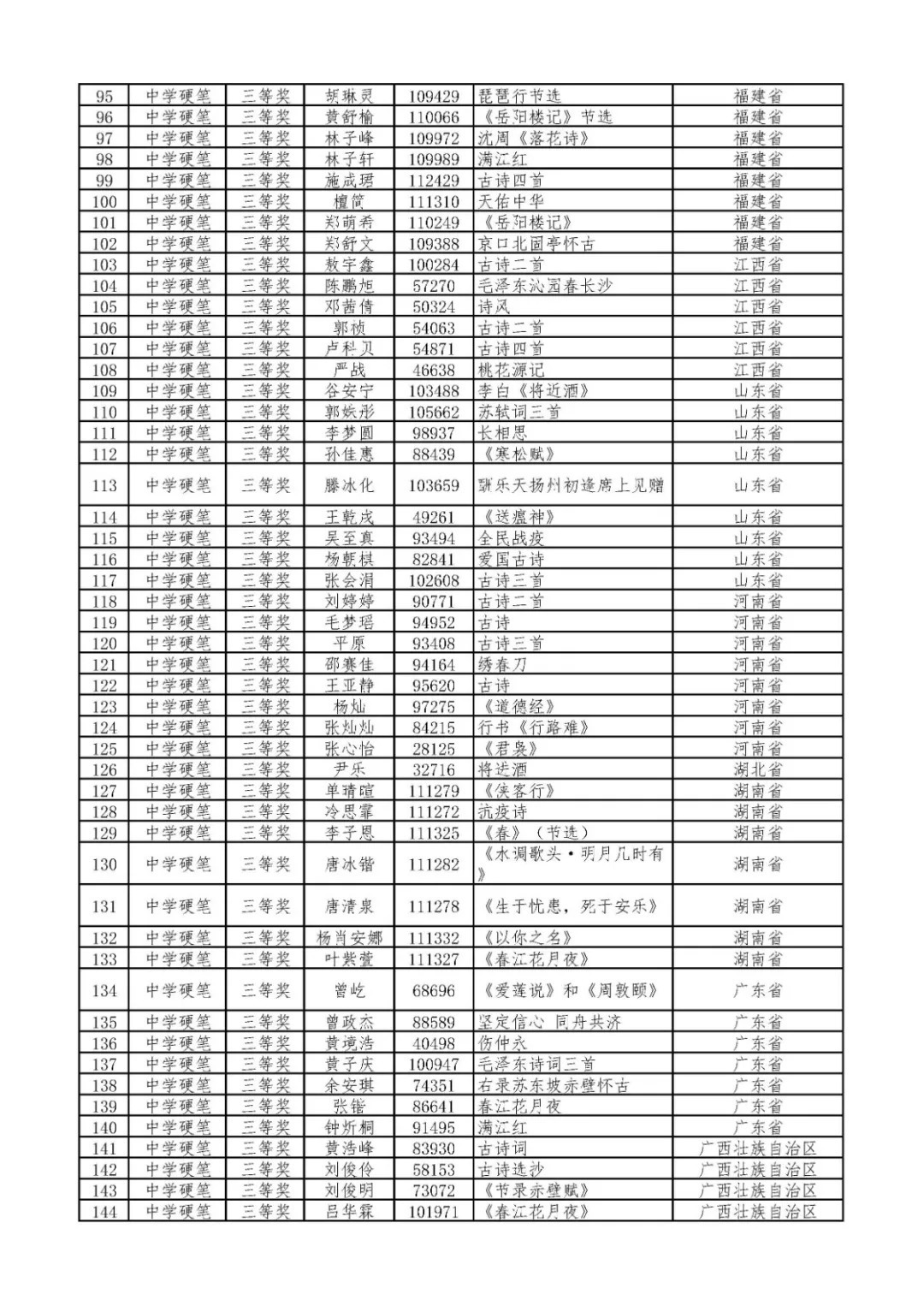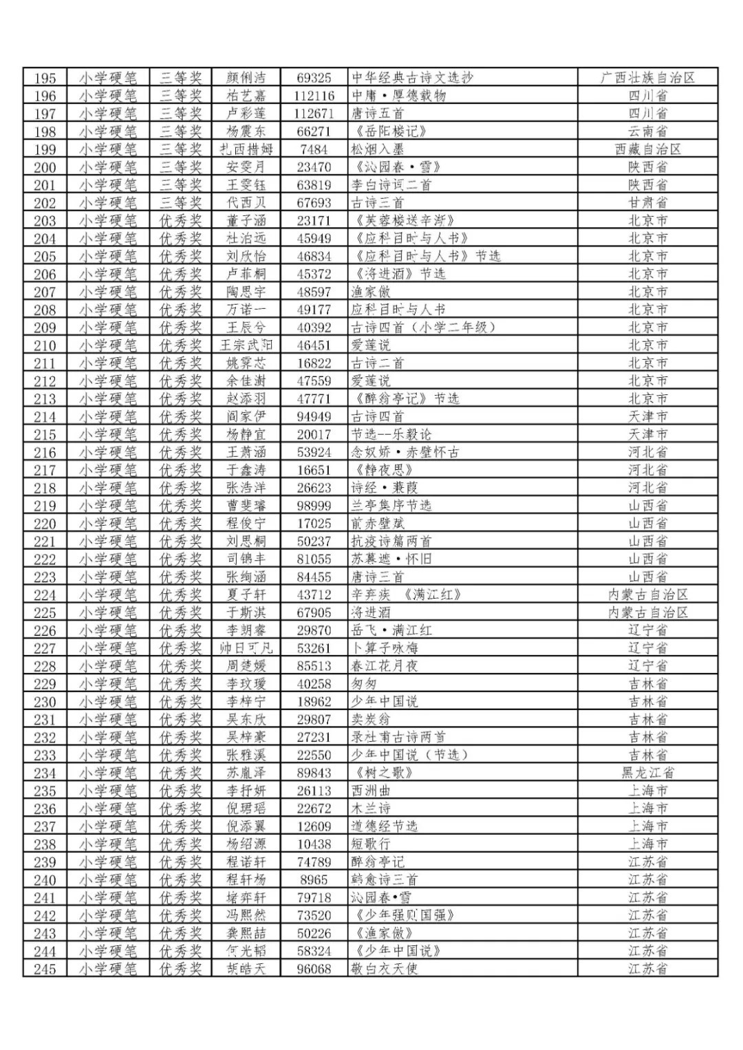 根据《教育部办公厅关于举办第二届中华经典诵写讲大赛的通知》(教语用厅函〔2020〕1号)精神,2020年5月10日至8月10日,“笔墨中国”汉字书写大赛完成了初赛作品征集,共收到参赛作品近12万件。9月-10月,经过初赛、决赛评审,共评选出硬笔类小学组、中学组、大学组、教师组、社会人员组;软笔类小学组、中学组、大学组、教师组、社会人员组共10个组别,总计3336件获奖作品,指导教师奖117名。现将获奖名单公示如下,公示期7天(11月6日—11月13日)。 公示期间接受举报,如经查实代笔或假借作品等问题的,将取消获奖资格。若对获奖名单有异议,请于11月13日16:30前,向赛事承办方实名反馈。反馈邮箱:bmzg@ywcbs.com。 特此公示。 第二届中华经典诵写讲大赛组委会 2020年11月6日