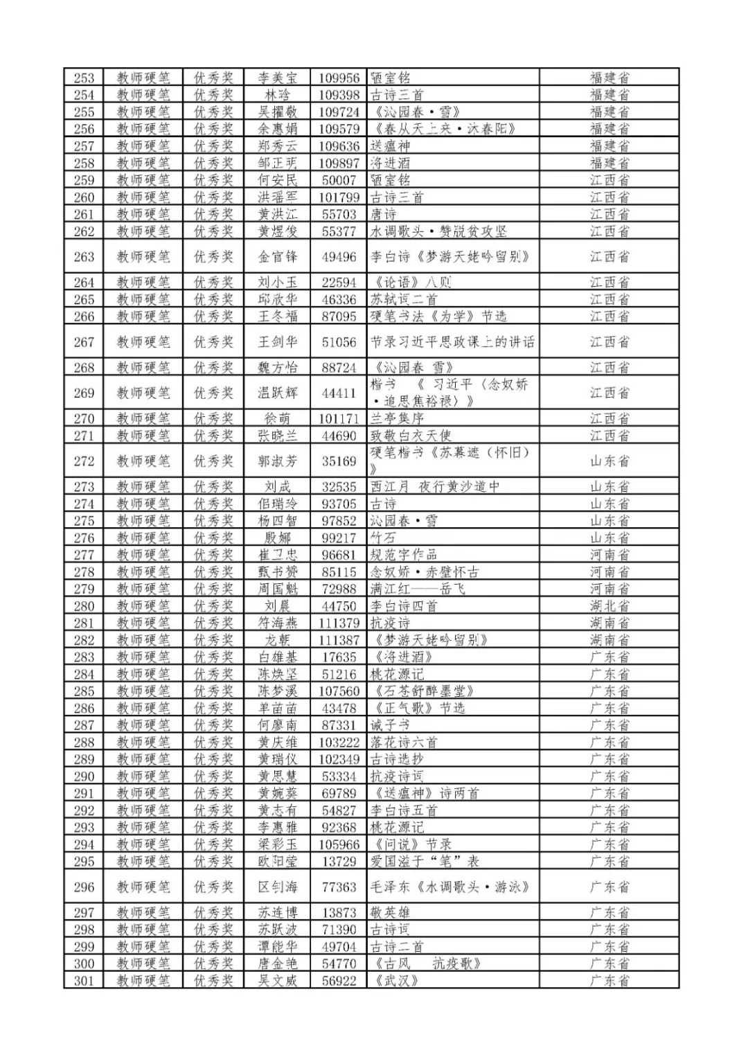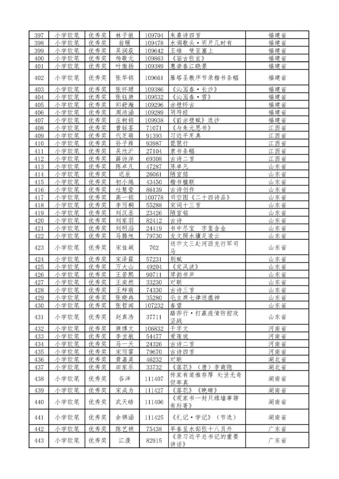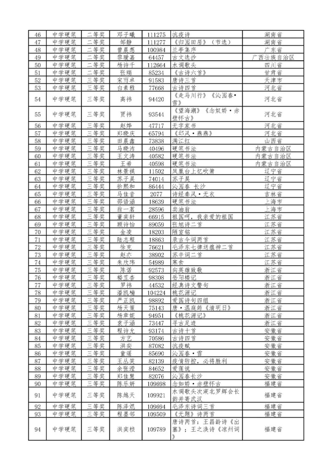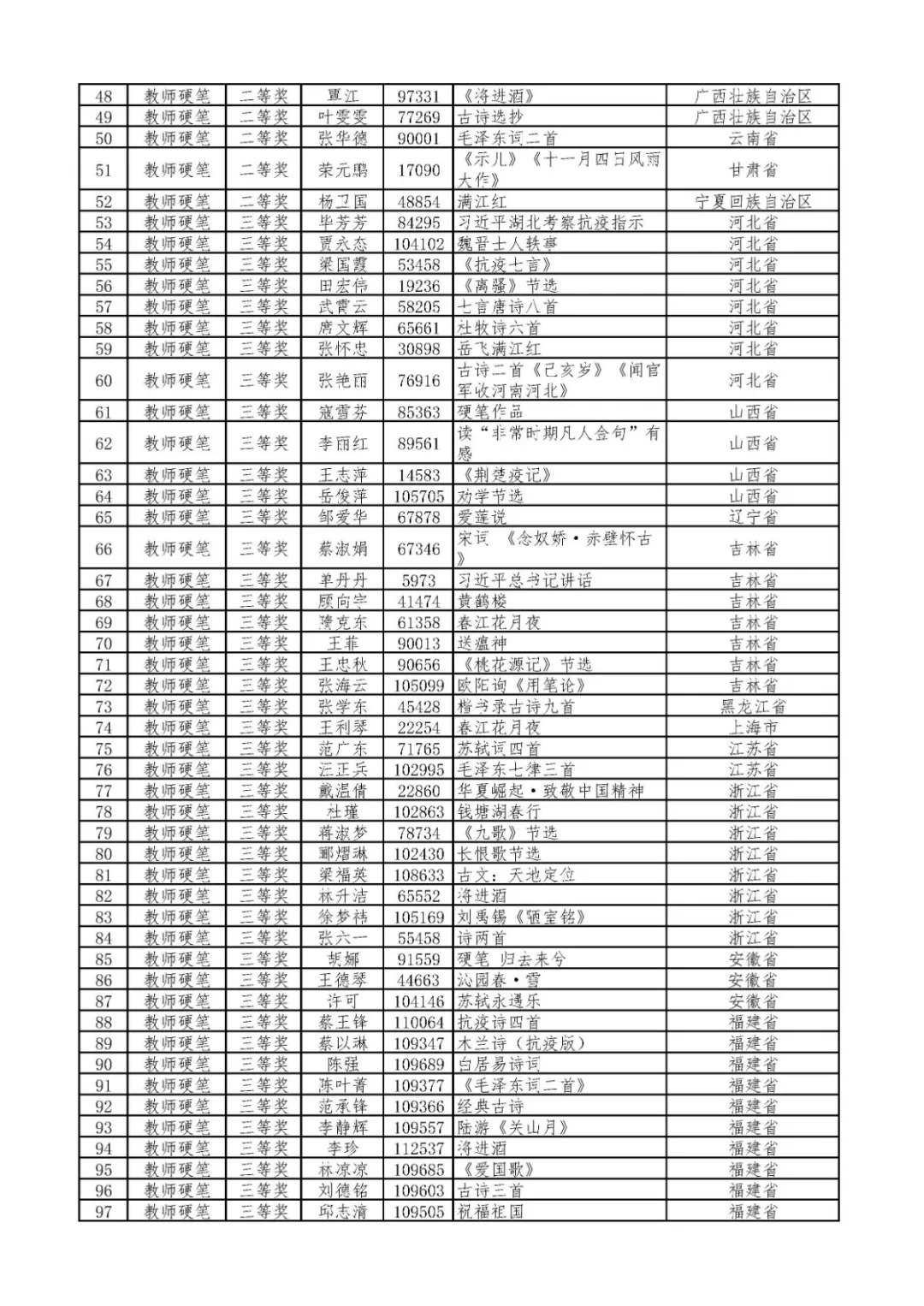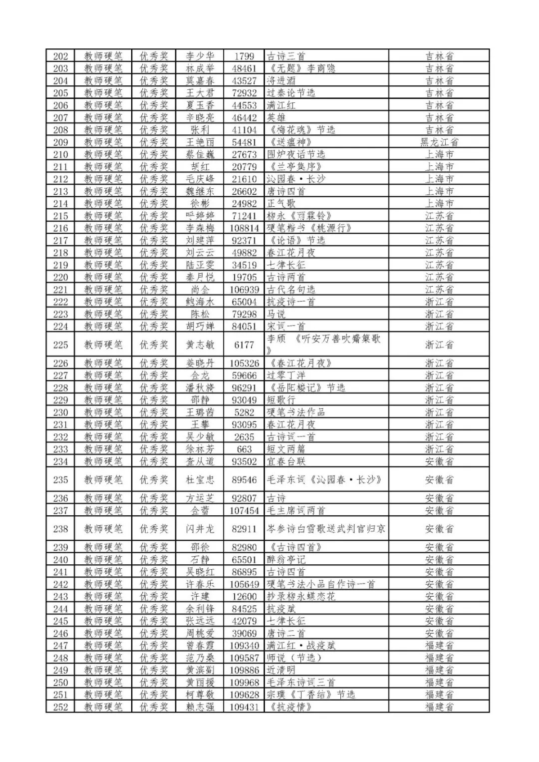 根据《教育部办公厅关于举办第二届中华经典诵写讲大赛的通知》(教语用厅函〔2020〕1号)精神,2020年5月10日至8月10日,“笔墨中国”汉字书写大赛完成了初赛作品征集,共收到参赛作品近12万件。9月-10月,经过初赛、决赛评审,共评选出硬笔类小学组、中学组、大学组、教师组、社会人员组;软笔类小学组、中学组、大学组、教师组、社会人员组共10个组别,总计3336件获奖作品,指导教师奖117名。现将获奖名单公示如下,公示期7天(11月6日—11月13日)。 公示期间接受举报,如经查实代笔或假借作品等问题的,将取消获奖资格。若对获奖名单有异议,请于11月13日16:30前,向赛事承办方实名反馈。反馈邮箱:bmzg@ywcbs.com。 特此公示。 第二届中华经典诵写讲大赛组委会 2020年11月6日
