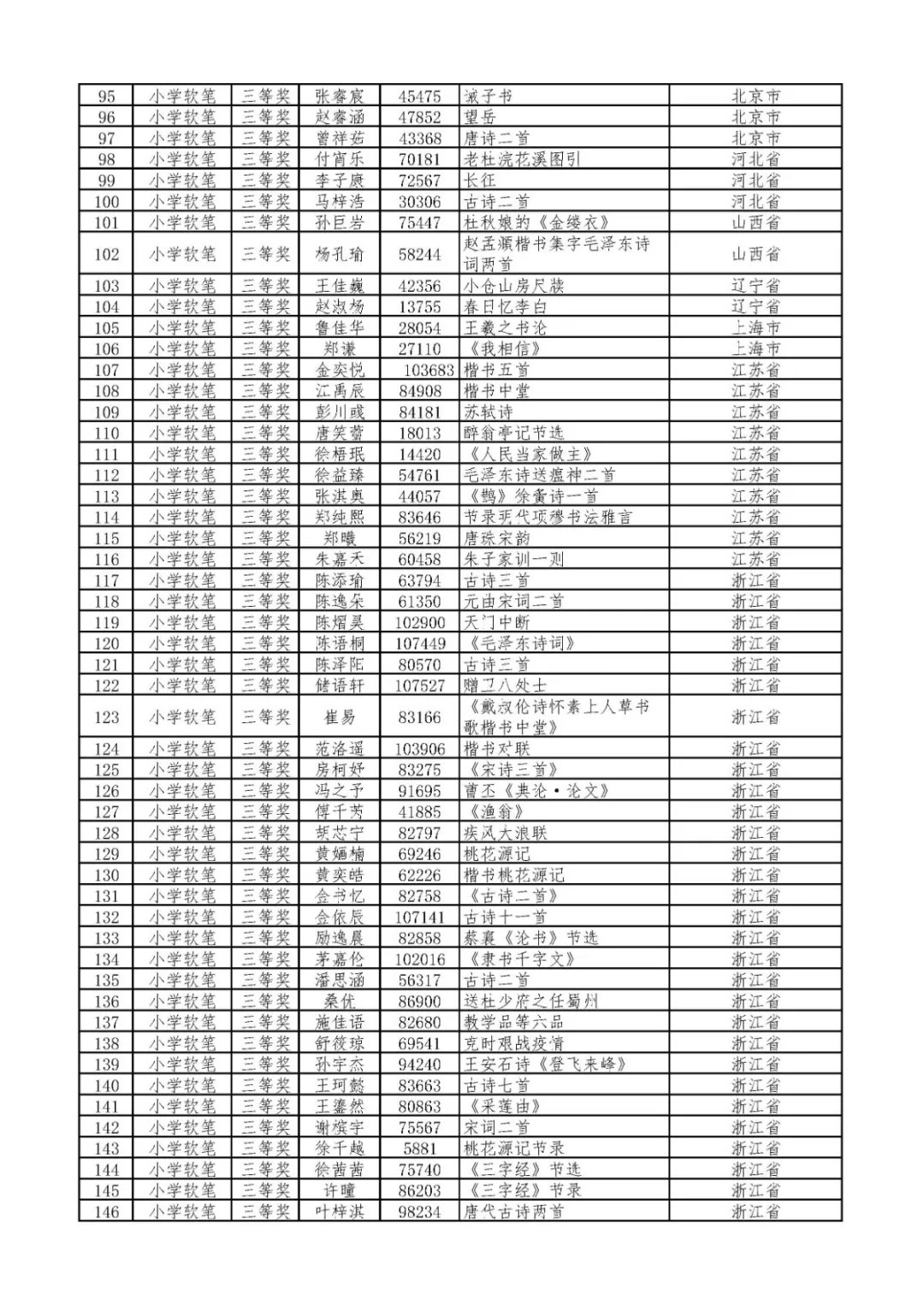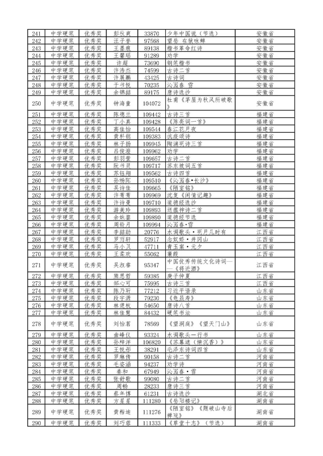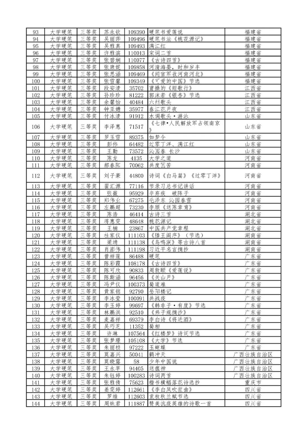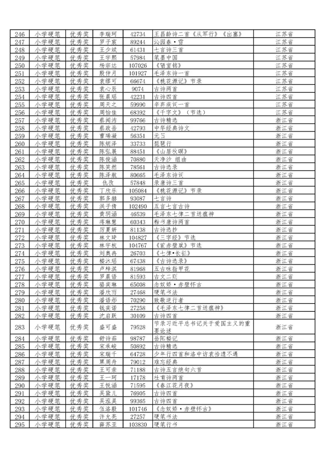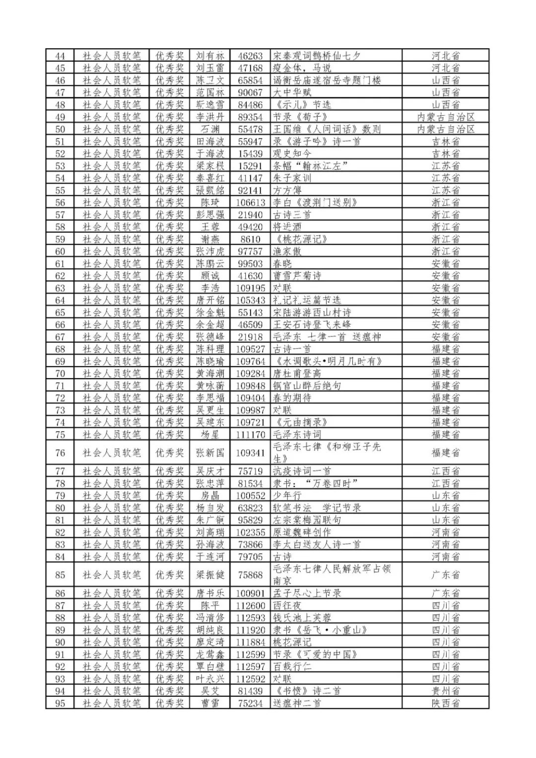 根据《教育部办公厅关于举办第二届中华经典诵写讲大赛的通知》(教语用厅函〔2020〕1号)精神,2020年5月10日至8月10日,“笔墨中国”汉字书写大赛完成了初赛作品征集,共收到参赛作品近12万件。9月-10月,经过初赛、决赛评审,共评选出硬笔类小学组、中学组、大学组、教师组、社会人员组;软笔类小学组、中学组、大学组、教师组、社会人员组共10个组别,总计3336件获奖作品,指导教师奖117名。现将获奖名单公示如下,公示期7天(11月6日—11月13日)。 公示期间接受举报,如经查实代笔或假借作品等问题的,将取消获奖资格。若对获奖名单有异议,请于11月13日16:30前,向赛事承办方实名反馈。反馈邮箱:bmzg@ywcbs.com。 特此公示。 第二届中华经典诵写讲大赛组委会 2020年11月6日