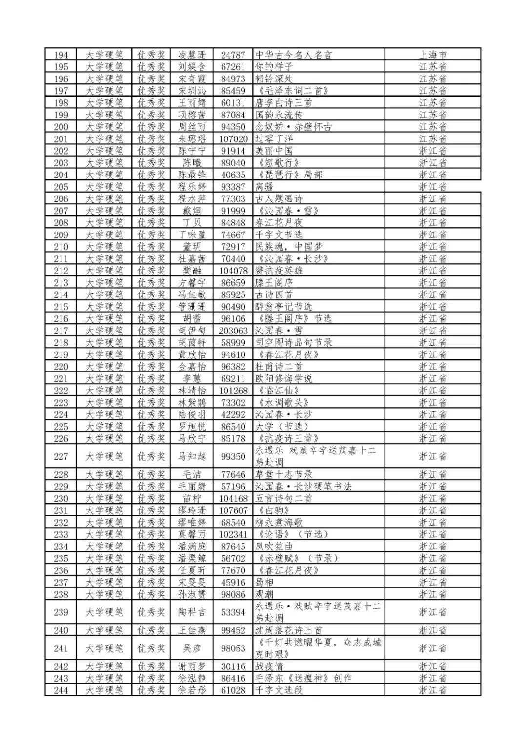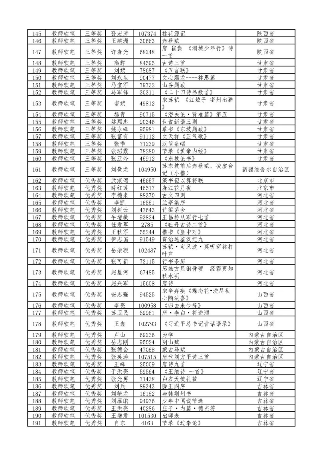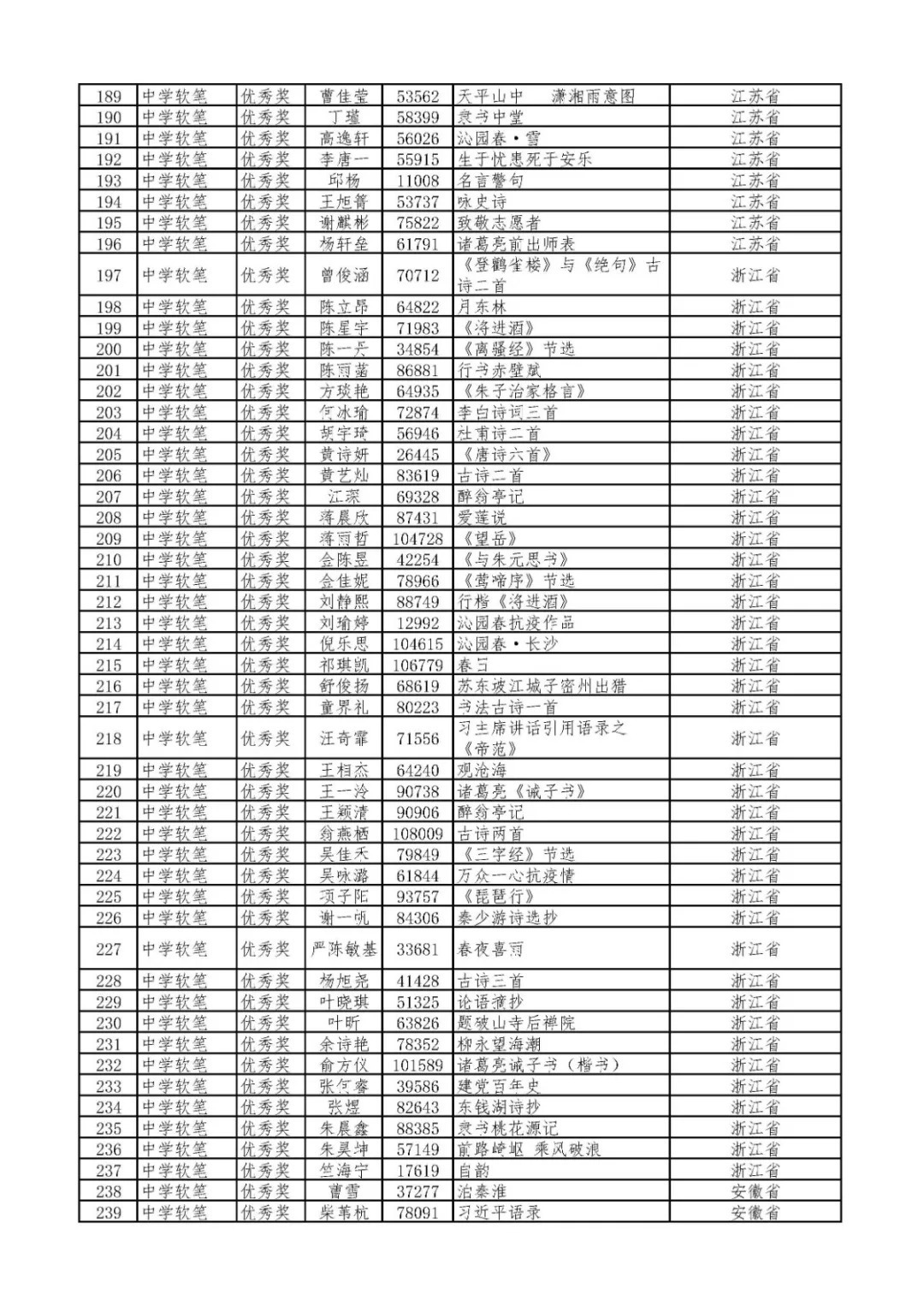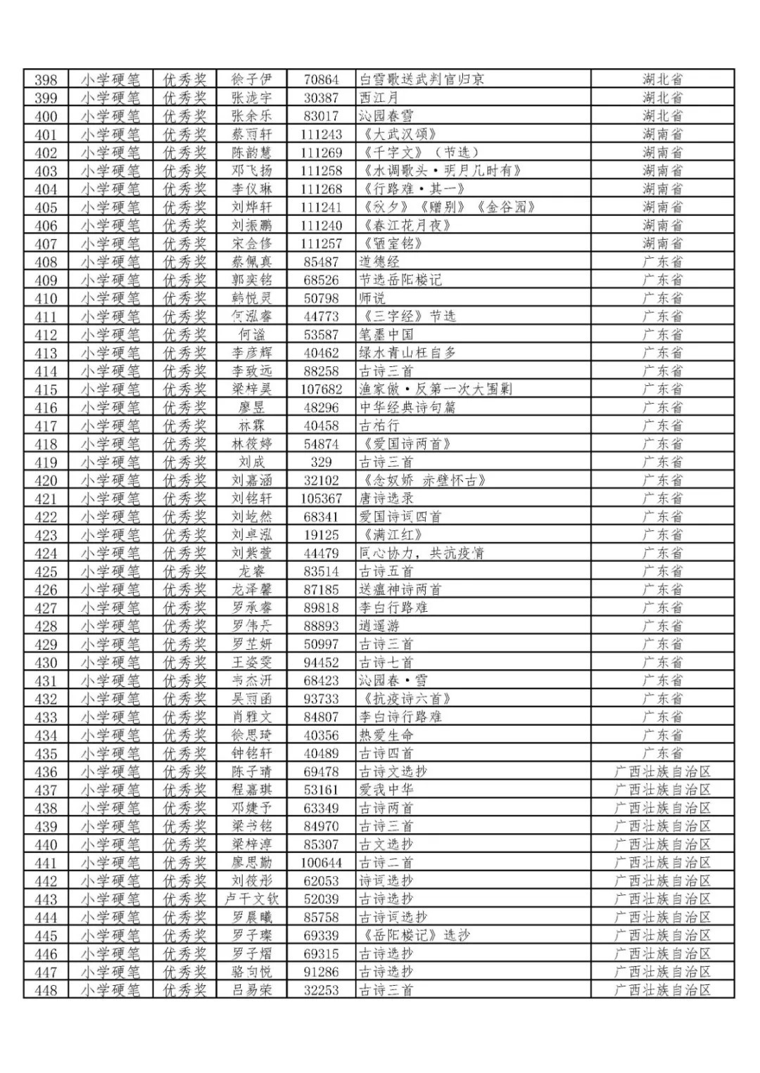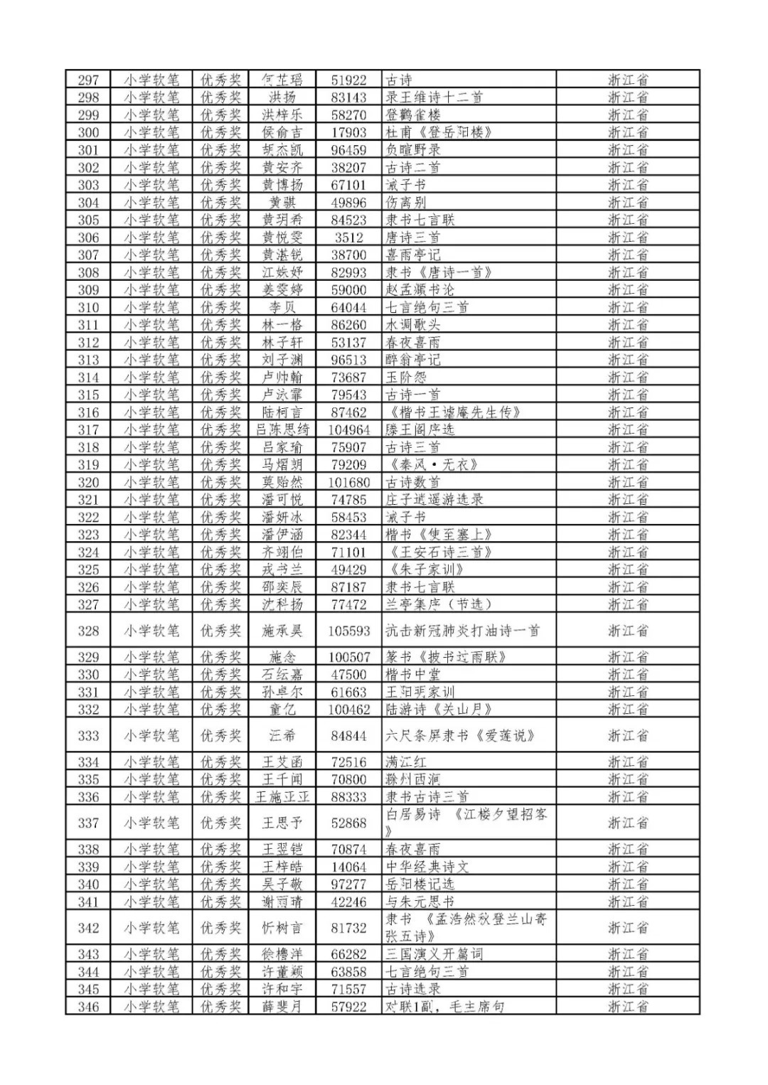 根据《教育部办公厅关于举办第二届中华经典诵写讲大赛的通知》(教语用厅函〔2020〕1号)精神,2020年5月10日至8月10日,“笔墨中国”汉字书写大赛完成了初赛作品征集,共收到参赛作品近12万件。9月-10月,经过初赛、决赛评审,共评选出硬笔类小学组、中学组、大学组、教师组、社会人员组;软笔类小学组、中学组、大学组、教师组、社会人员组共10个组别,总计3336件获奖作品,指导教师奖117名。现将获奖名单公示如下,公示期7天(11月6日—11月13日)。 公示期间接受举报,如经查实代笔或假借作品等问题的,将取消获奖资格。若对获奖名单有异议,请于11月13日16:30前,向赛事承办方实名反馈。反馈邮箱:bmzg@ywcbs.com。 特此公示。 第二届中华经典诵写讲大赛组委会 2020年11月6日
