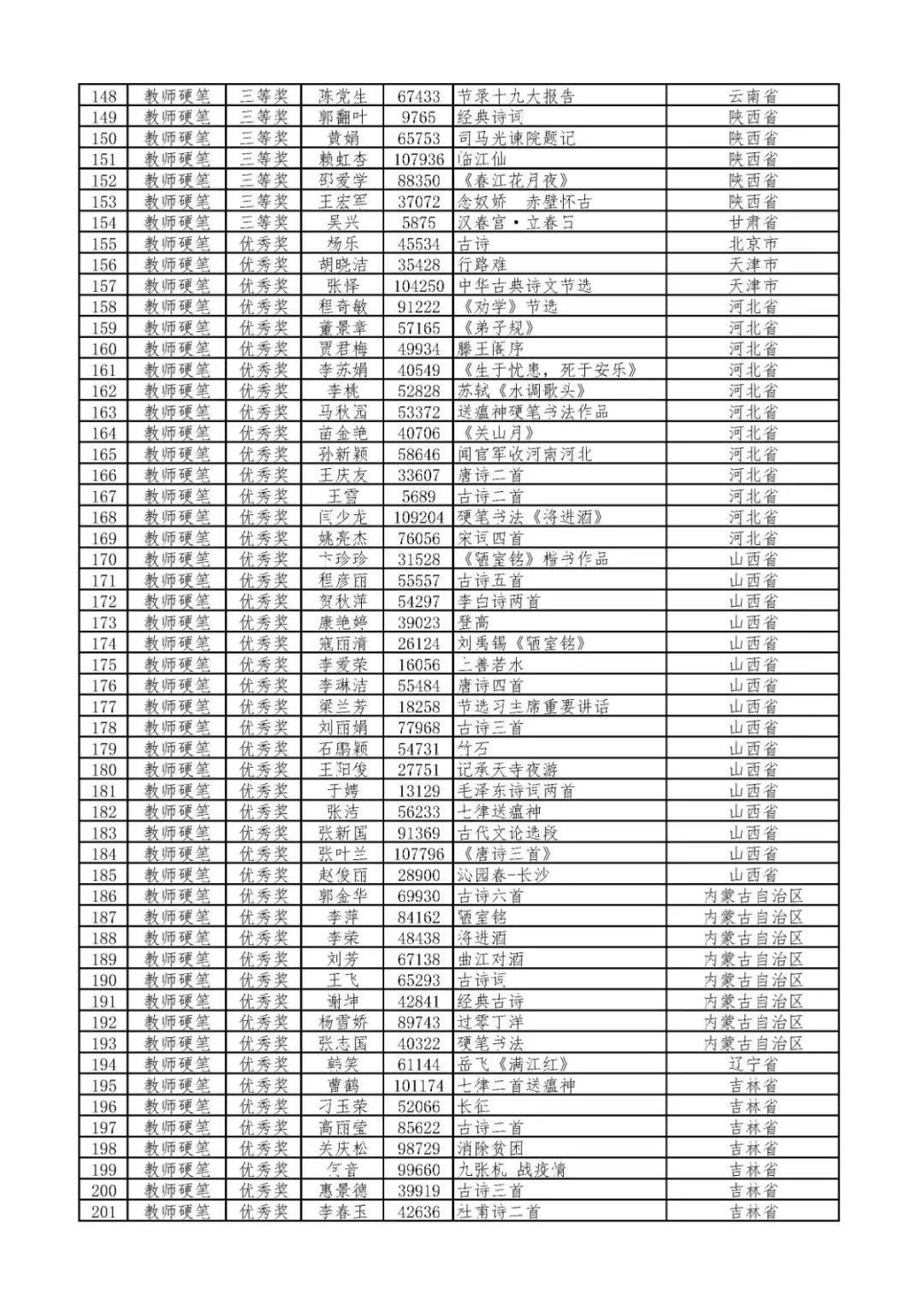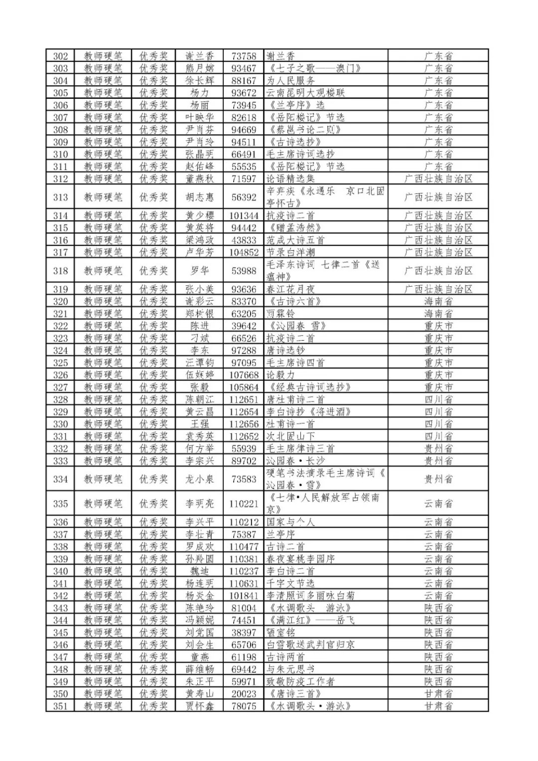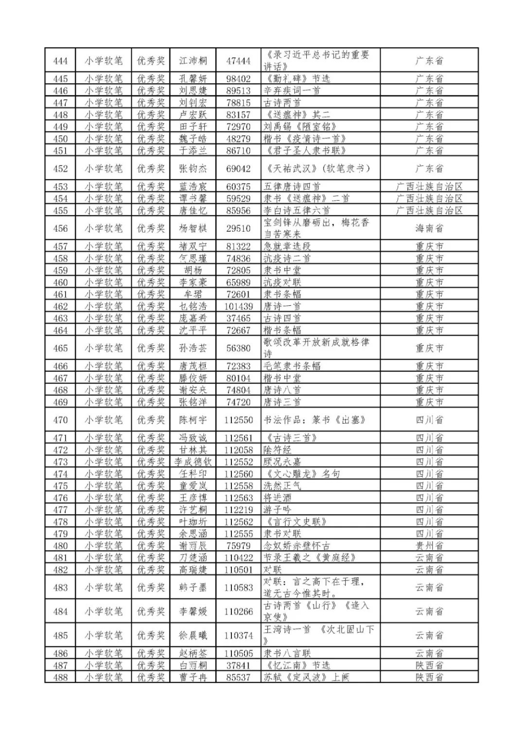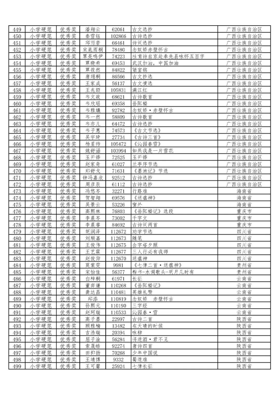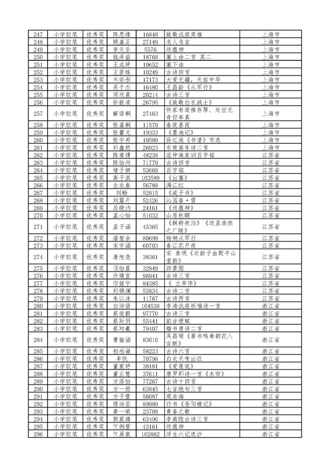 根据《教育部办公厅关于举办第二届中华经典诵写讲大赛的通知》(教语用厅函〔2020〕1号)精神,2020年5月10日至8月10日,“笔墨中国”汉字书写大赛完成了初赛作品征集,共收到参赛作品近12万件。9月-10月,经过初赛、决赛评审,共评选出硬笔类小学组、中学组、大学组、教师组、社会人员组;软笔类小学组、中学组、大学组、教师组、社会人员组共10个组别,总计3336件获奖作品,指导教师奖117名。现将获奖名单公示如下,公示期7天(11月6日—11月13日)。 公示期间接受举报,如经查实代笔或假借作品等问题的,将取消获奖资格。若对获奖名单有异议,请于11月13日16:30前,向赛事承办方实名反馈。反馈邮箱:bmzg@ywcbs.com。 特此公示。 第二届中华经典诵写讲大赛组委会 2020年11月6日