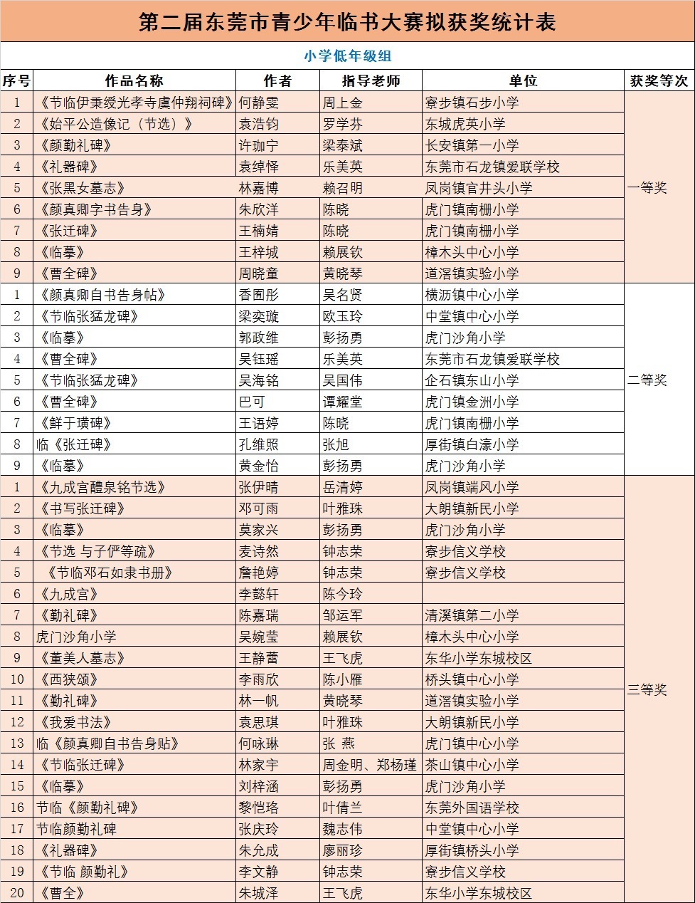 “形式之美”——第二届东莞市青少年临书大赛评审工作已如期结束。本次大赛共收到作品1090件,小学低年级组71件,小学高年级组831件,初中组163件,高中组25件;去掉不符合参评标准的(自行装裱、无学校盖章、校外机构投稿、作品背面无信息等)48件作品,最后,1042件有效投稿作品参加评选。根据评审方案,分四个组别评出获奖作品,现将获奖名单公示(详见统计表)。