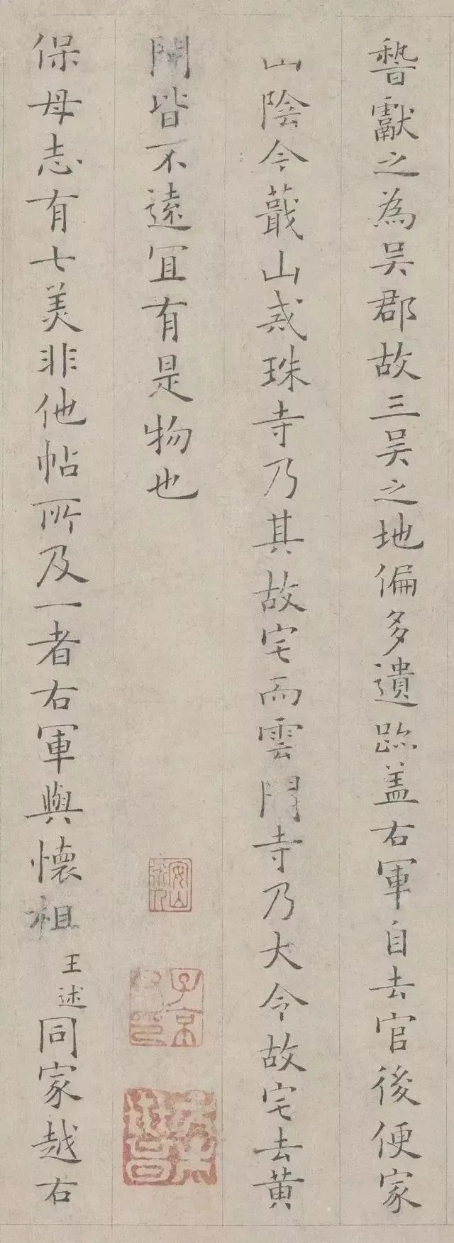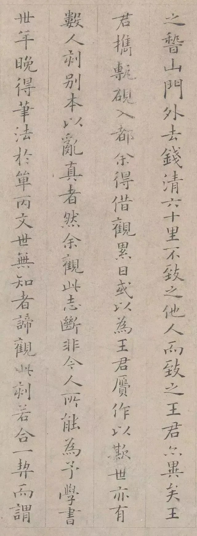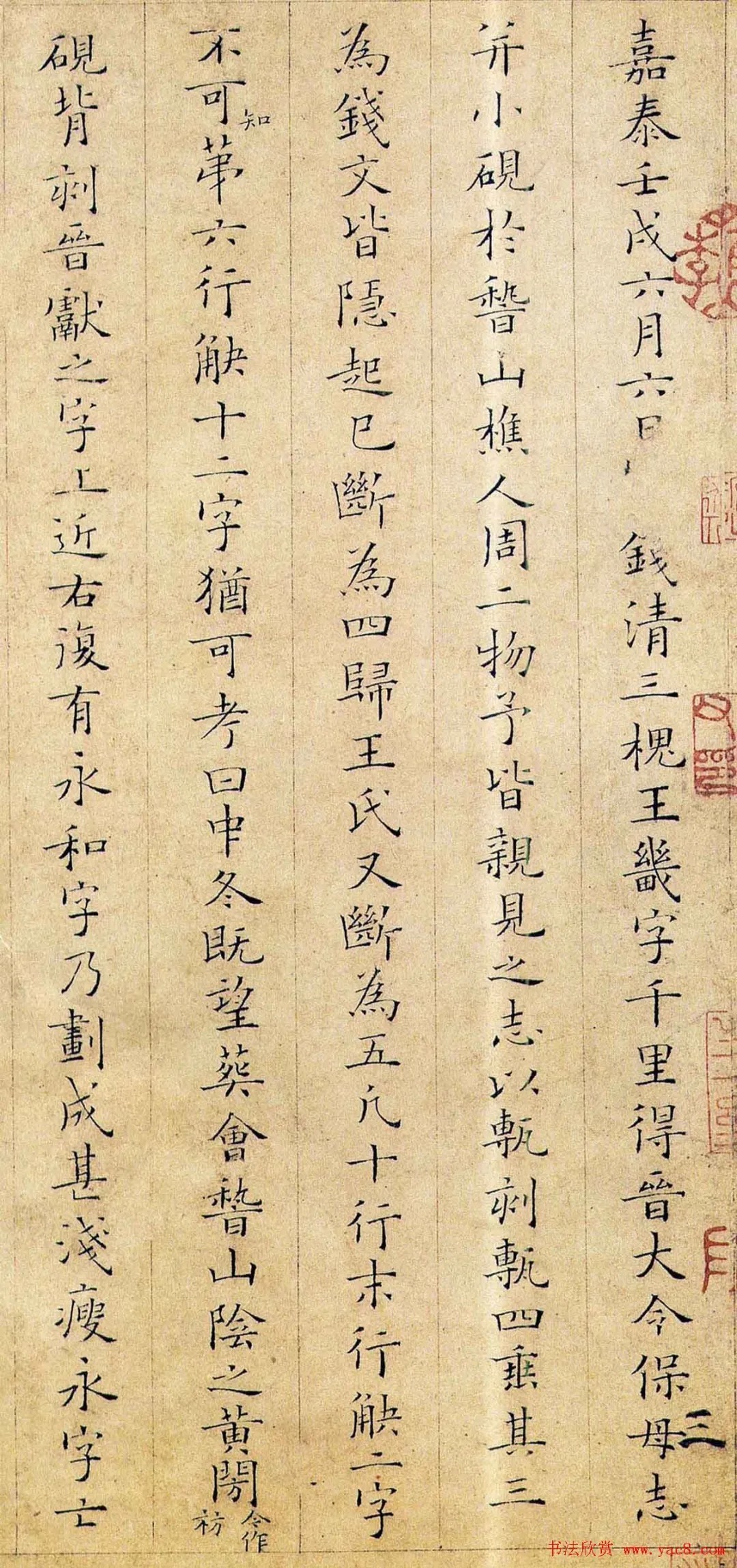 姜夔(约1155-1221)字尧章,鄱阳(今江西鄱阳县)人。自号白石道人。工诗词,精音乐,善书法,对词的造诣尤深。有诗词、诗论、乐书、字书、杂录等多种著作。一生未入仕途,以布衣终。传世墨迹不多。从《小楷跋王献之保母帖》中可以看出他的书法出于二王一路,用笔精到,典雅俊润,且受初唐诸家书风影响,不随时俗,清新脱俗。