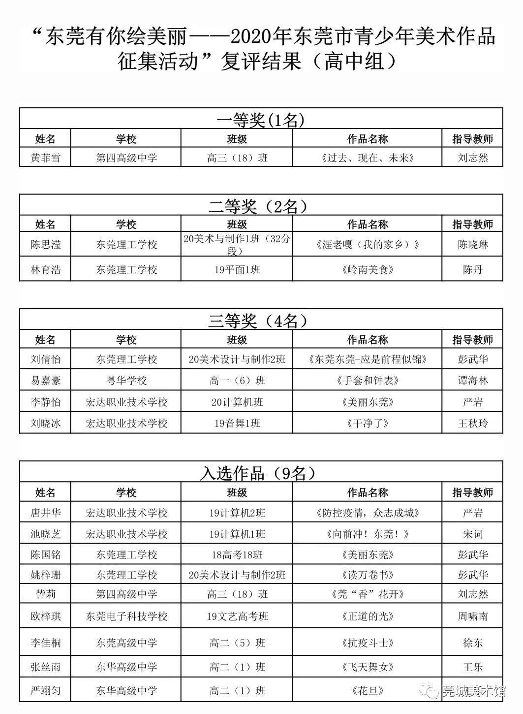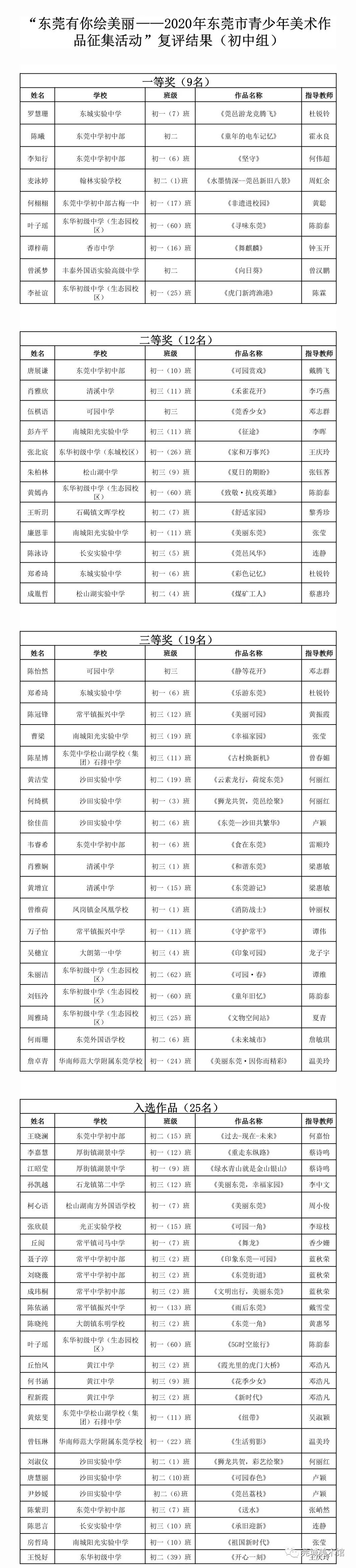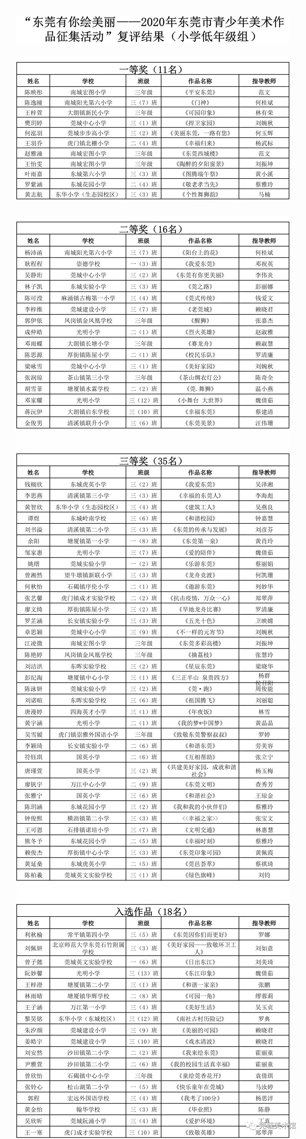 征集情况 今年9月,“东莞有你绘美丽——2020年东莞市青少年美术作品主题创作展”征稿活动正式开展。 征稿结束后,共收到来自全市各个镇街选送的作品3519件(组),投稿人数3275人;相较于上一届,作品数量增长了313%。 参照作品质量、往届入选情况以及展馆的展线长度,按征稿函要求,作品初评、复评活动已完成。活动评选出入选作品321件(组),其中一等奖作品43件(组)、二等奖作品65件(组)、三等奖作品108件(组)。 评选结果 小学低年级组 (排序不分先后) 上下滑动阅览 小学高年级组 (排序不分先后) 上下滑动阅览 初中组 (排序不分先后) 上下滑动阅览 高中组 (排序不分先后) 上下滑动阅览 优秀组织、优秀指导教师 (排序不分先后) 上下滑动阅览 注意事项 1 公布结果信息如有误,请发送正确信息至1742236369@qq.com。 2 即日起至2020年12月6日,请作者将作品自行取回。 3 本次展览仅展出获奖作品,入选作品不参展,请获一、二、三等奖的作者将作品装框,填写《东莞有你绘美丽》参展作品登记卡并粘贴在作品画框背面,于2020年12月12日-27日期间送至莞城美术馆(提前、逾期均不收件)。展览结束后,所有作品需在两周内自行取回。 取、送件地址:广东省东莞市莞城区高第街五号,莞城美术馆 联系方式: 0769-22100180 (咨询时间:周一至周五09:00—17:30) 0769-22100261 (咨询时间:周二至周日09:30—17:00) (注:请勿用玻璃等易碎材质装框,保证作品外框和画心等牢固、结实,以确保作品在运送、展览过程中完好无损,否则,由此产生的任何破损结果由作者承担。) 《东莞有你绘美丽》参展作品登记卡 评委寄语 詹逸然丨东莞市教育局美术教研员 美育的早期教育非常重要,家庭对美育有着非常特殊的意义。父母对子女审美观形成有着导向作用,家庭为孩子创设一个美的环境,可以培养孩子发现美的眼睛和耳朵,塑造美的心灵。父母可以多鼓励自己的孩子,让他们用涂涂画画的方式来表达内心世界。 谢洪涛丨东莞市青少年活动中心主任、东莞市体育艺术联合会会长 展览的主题是“东莞有你绘美丽”,本届的投稿作品有以下几个特征:第一,作品都很贴切主题,传递了正能量;第二,作品种类丰富,表现形式多样,有水墨、版画、线描、工艺等;第三,作品的画面感越来越体现出学生的真实性,体现每个年龄段的心理特征和绘画技能技法,相较于以往有很大的进步。 从小参与这些活动,学生的社会责任感会越来越强,能逐渐形成爱党爱国的思想意识,我们所说的艺术要为时代服务就体现在这里。