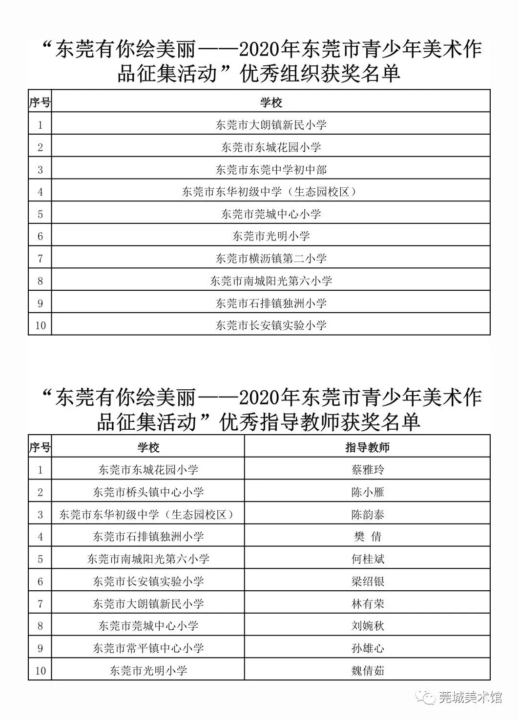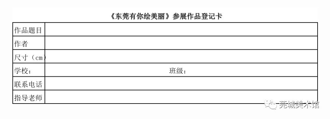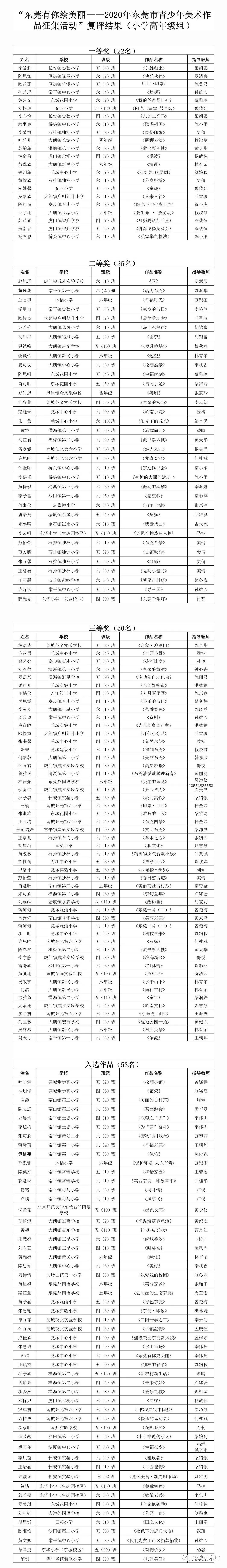 征集情况 今年9月,“东莞有你绘美丽——2020年东莞市青少年美术作品主题创作展”征稿活动正式开展。 征稿结束后,共收到来自全市各个镇街选送的作品3519件(组),投稿人数3275人;相较于上一届,作品数量增长了313%。 参照作品质量、往届入选情况以及展馆的展线长度,按征稿函要求,作品初评、复评活动已完成。活动评选出入选作品321件(组),其中一等奖作品43件(组)、二等奖作品65件(组)、三等奖作品108件(组)。 评选结果 小学低年级组 (排序不分先后) 上下滑动阅览 小学高年级组 (排序不分先后) 上下滑动阅览 初中组 (排序不分先后) 上下滑动阅览 高中组 (排序不分先后) 上下滑动阅览 优秀组织、优秀指导教师 (排序不分先后) 上下滑动阅览 注意事项 1 公布结果信息如有误,请发送正确信息至1742236369@qq.com。 2 即日起至2020年12月6日,请作者将作品自行取回。 3 本次展览仅展出获奖作品,入选作品不参展,请获一、二、三等奖的作者将作品装框,填写《东莞有你绘美丽》参展作品登记卡并粘贴在作品画框背面,于2020年12月12日-27日期间送至莞城美术馆(提前、逾期均不收件)。展览结束后,所有作品需在两周内自行取回。 取、送件地址:广东省东莞市莞城区高第街五号,莞城美术馆 联系方式: 0769-22100180 (咨询时间:周一至周五09:00—17:30) 0769-22100261 (咨询时间:周二至周日09:30—17:00) (注:请勿用玻璃等易碎材质装框,保证作品外框和画心等牢固、结实,以确保作品在运送、展览过程中完好无损,否则,由此产生的任何破损结果由作者承担。) 《东莞有你绘美丽》参展作品登记卡 评委寄语 詹逸然丨东莞市教育局美术教研员 美育的早期教育非常重要,家庭对美育有着非常特殊的意义。父母对子女审美观形成有着导向作用,家庭为孩子创设一个美的环境,可以培养孩子发现美的眼睛和耳朵,塑造美的心灵。父母可以多鼓励自己的孩子,让他们用涂涂画画的方式来表达内心世界。 谢洪涛丨东莞市青少年活动中心主任、东莞市体育艺术联合会会长 展览的主题是“东莞有你绘美丽”,本届的投稿作品有以下几个特征:第一,作品都很贴切主题,传递了正能量;第二,作品种类丰富,表现形式多样,有水墨、版画、线描、工艺等;第三,作品的画面感越来越体现出学生的真实性,体现每个年龄段的心理特征和绘画技能技法,相较于以往有很大的进步。 从小参与这些活动,学生的社会责任感会越来越强,能逐渐形成爱党爱国的思想意识,我们所说的艺术要为时代服务就体现在这里。