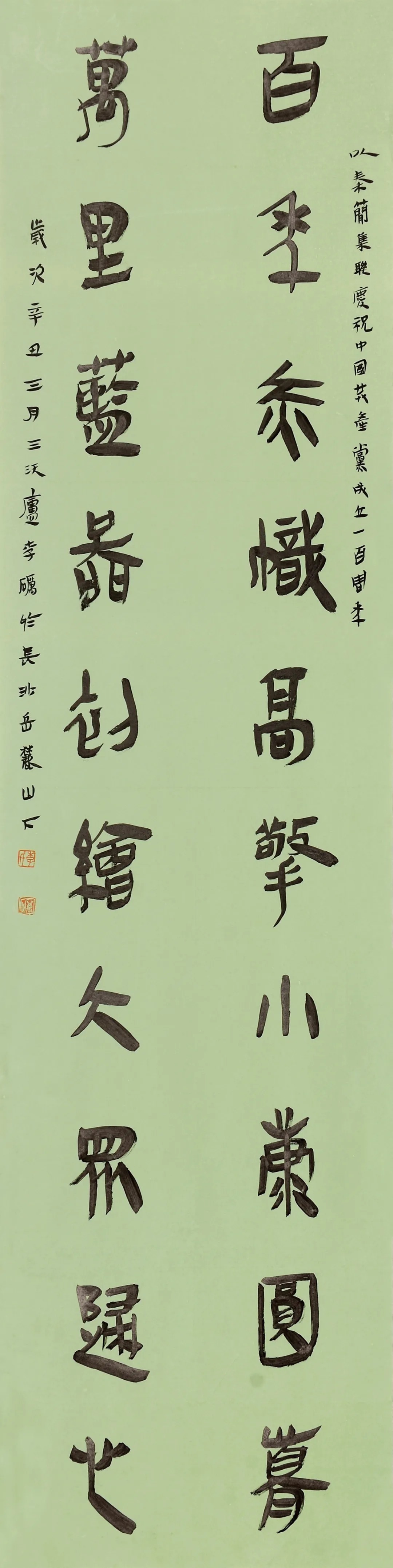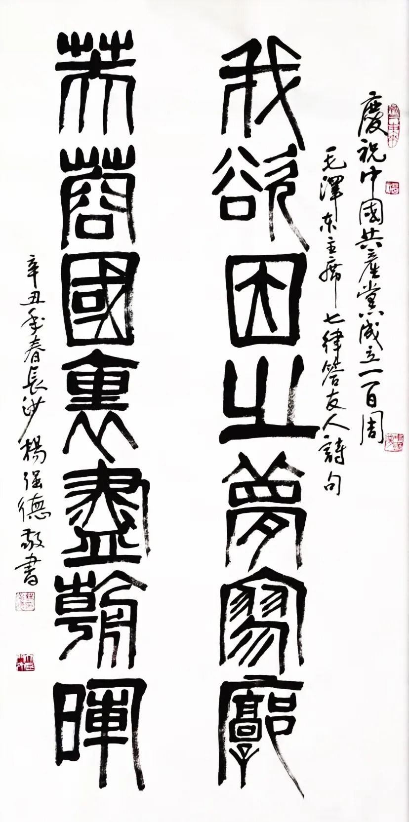 (排名不分先后) 春风化雨 万象更新 敖普安 松龄鹤寿 · 敖普安 和顺致祥 · 罗光磊 筚路百年大国复兴尘劫后 揽枝万里中华雄屹地球东 罗光磊 没有共产党就没有新中国 · 胡伟 坚定执着追理想 · 胡伟 天若有情天亦老 人间正道是沧桑 李莹波 毛泽东《卜算子·咏梅》 · 谭石光 百年赤帜高擎小康圆梦 万里蓝图初绘大众归心 李 砺 会当水击三千里 · 李砺 大哉,百年巨变 伟矣,万代宏基 张建明