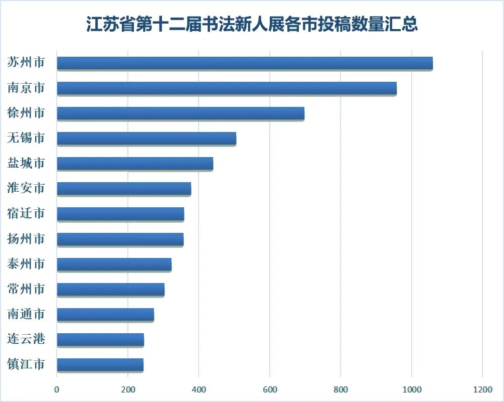 ▲江苏省第十二届书法新人展各市投稿数量汇总