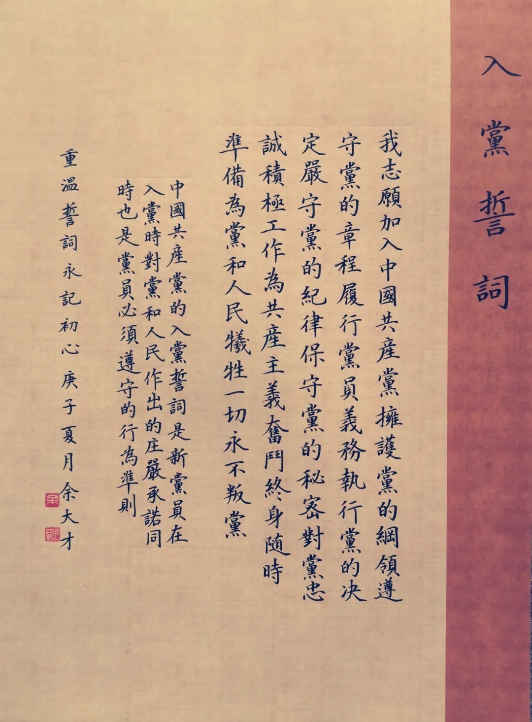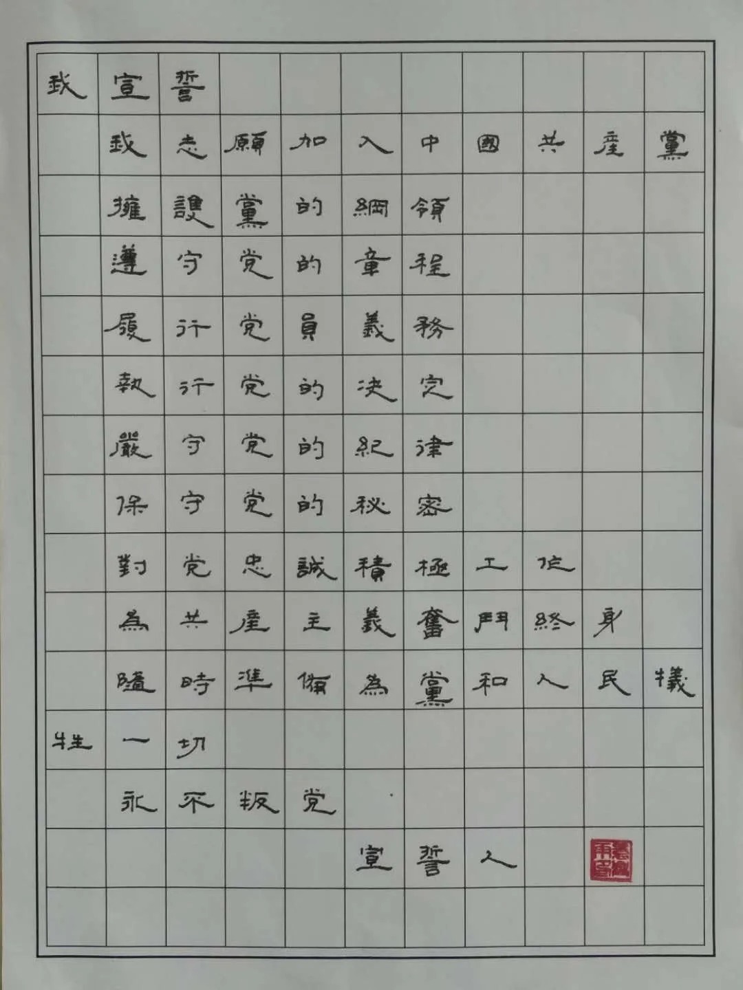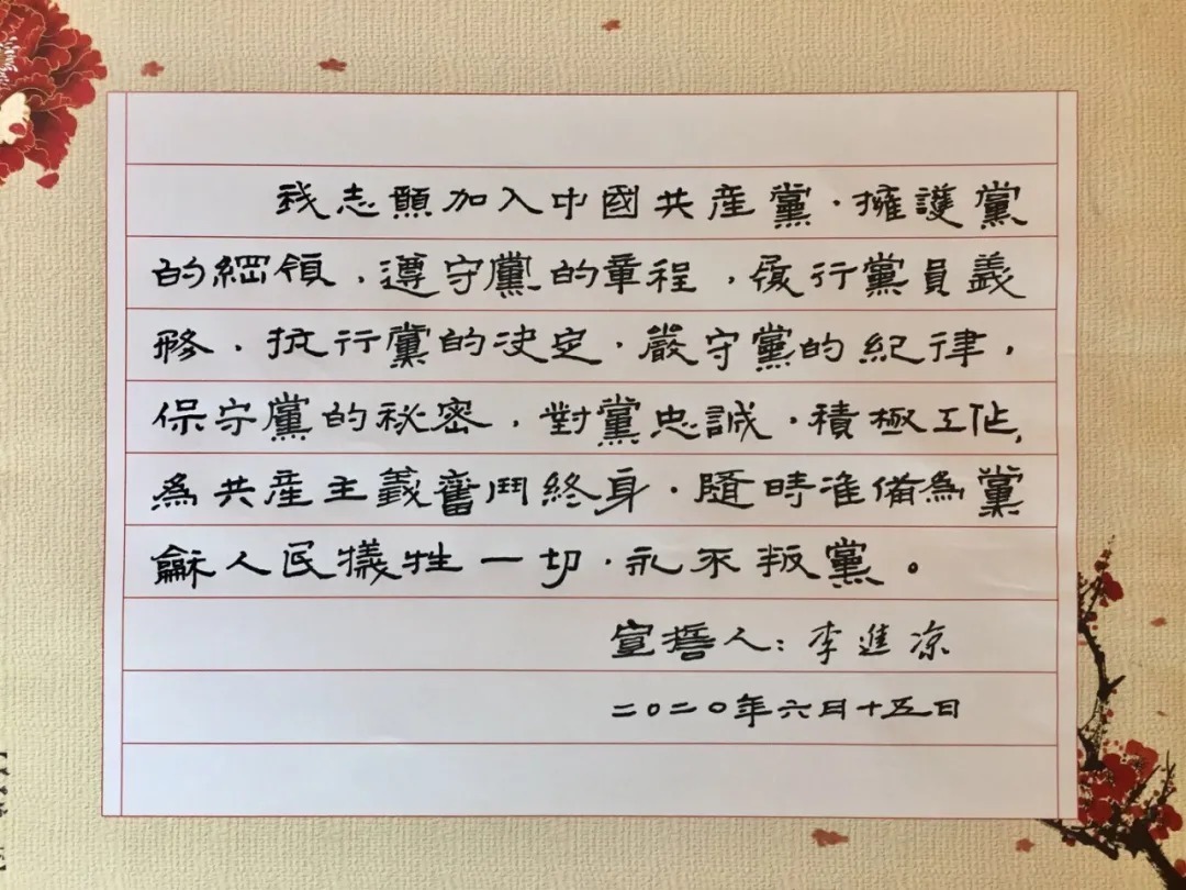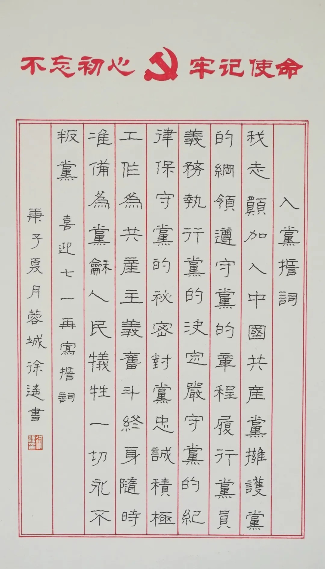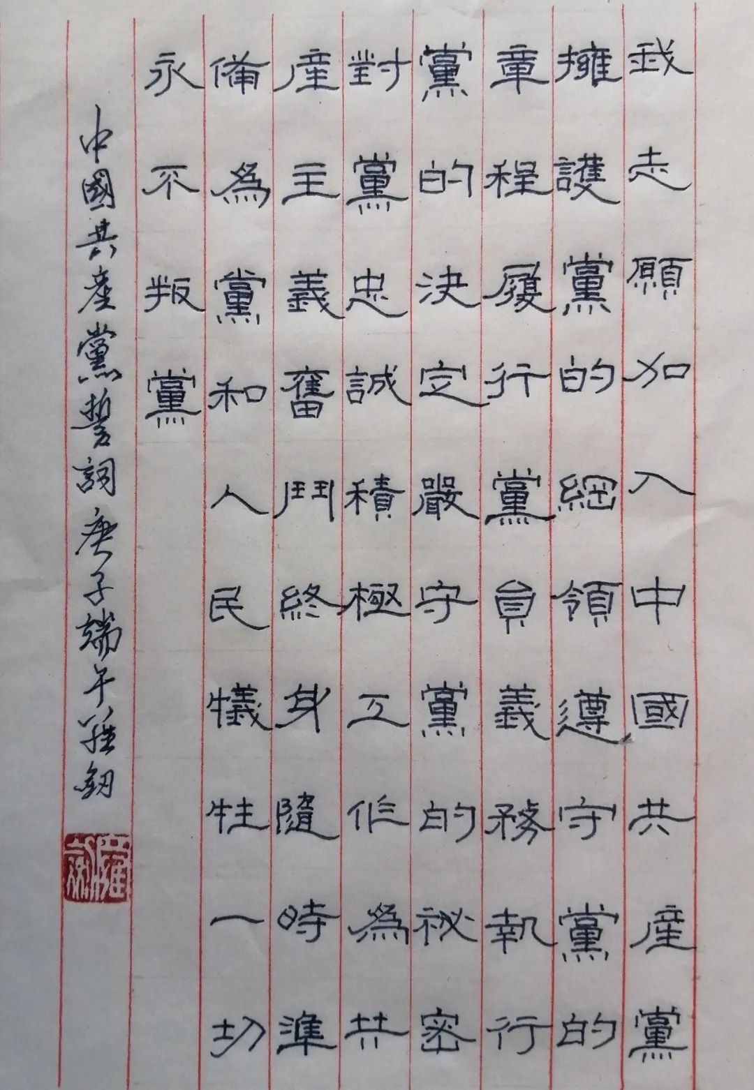 为庆祝中国共产党成立99周年,四川省硬笔书法家协会党支部组织党员再写入党誓词。通过重写入党誓词,重温党员对党和人民的庄严承诺,重记党对党员的基本要求和行为准则,增强执行党的决定、履行党员义务和严守党的纪律的自觉性,坚定为共产主义奋斗终身的信念,增强党员为协会建设和发展四川硬笔书法事业的责任感使命感。 入党誓词,“我”字开头,党在心中。入党誓词,八十个字,十二句话,字字千钧,句句铿锵。重温一次,洗礼一次。重温,提醒“我”时刻不忘初心,不忘为什么出发,才会找准方向,坚定追求,正道直行。重温,敦促“我”勿忘党员身份,一经宣誓,就意味着,“我”完成了重要的身份转换,从一名群众,成为一名党员。重温,鞭策“我”砥砺前行,入党誓词是行动指南,当成为共产党人的座右铭,不断学习之,终身践行之。 “我”是“志愿”加入中国共产党的。“志愿”里,有对共产主义的认同和向往,有终自己一生为远大理想努力奋斗的抱负,有倾自己所有为党和人民牺牲奉献的决心。初心,是无穷力量,足以战胜前路艰险;是奋斗方向,指引我们扬帆启航。理想信念旗帜高高扬起,为人民服务宗旨时时牢记,经常想想来路,始终认定目标,就会鼓足一往无前的勇气。 “入党是一阵子,做党员是一辈子。”只有刻骨铭心地牢记共产党员这个第一身份,鞠躬尽瘁地履行为党工作这个第一职责,做到任何时候都忠诚于党,与党同心同德,才能够永葆共产党人的政治本色。 今天我们注目党旗、书写誓词,用这种特殊的方式庆祝党的生日。希望协会中的共产党员,不忘初心,牢记使命,充分发挥党员的先锋模范作用,为实现“打造硬笔书法高原,攀登硬笔书法高峰”这一宏愿而不懈努力!