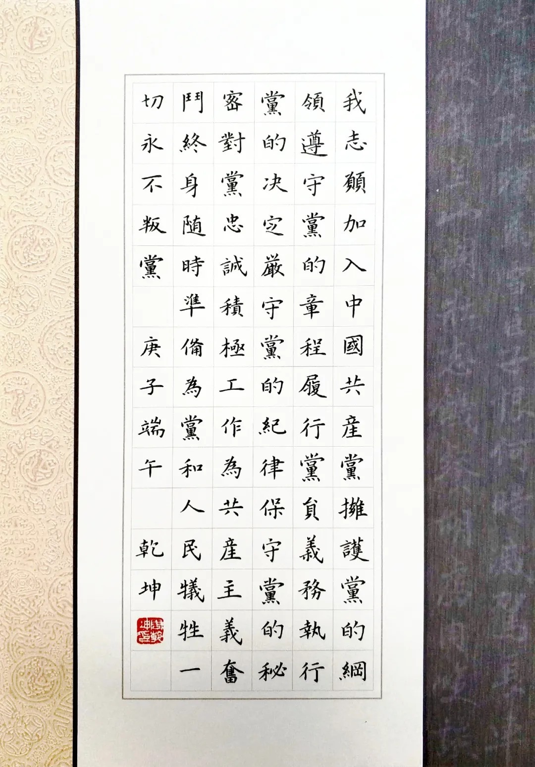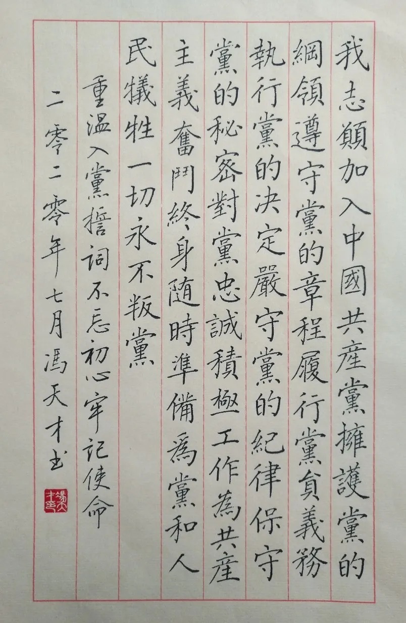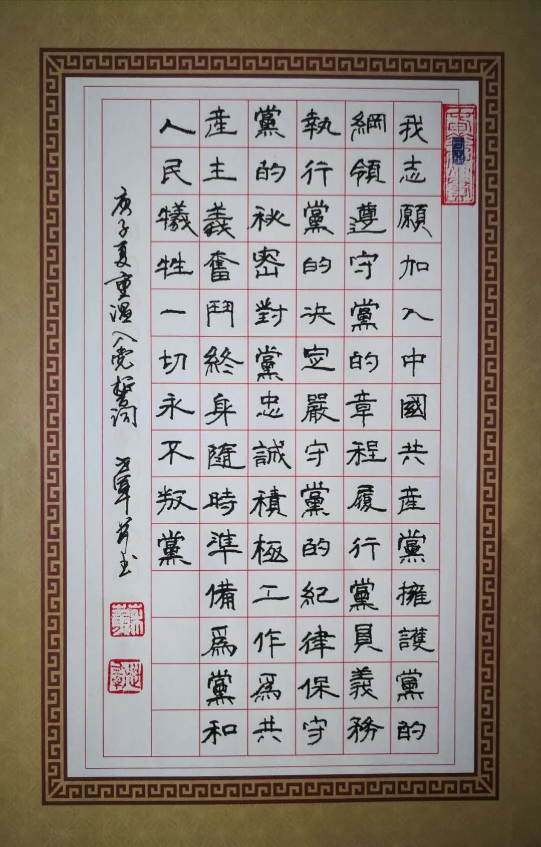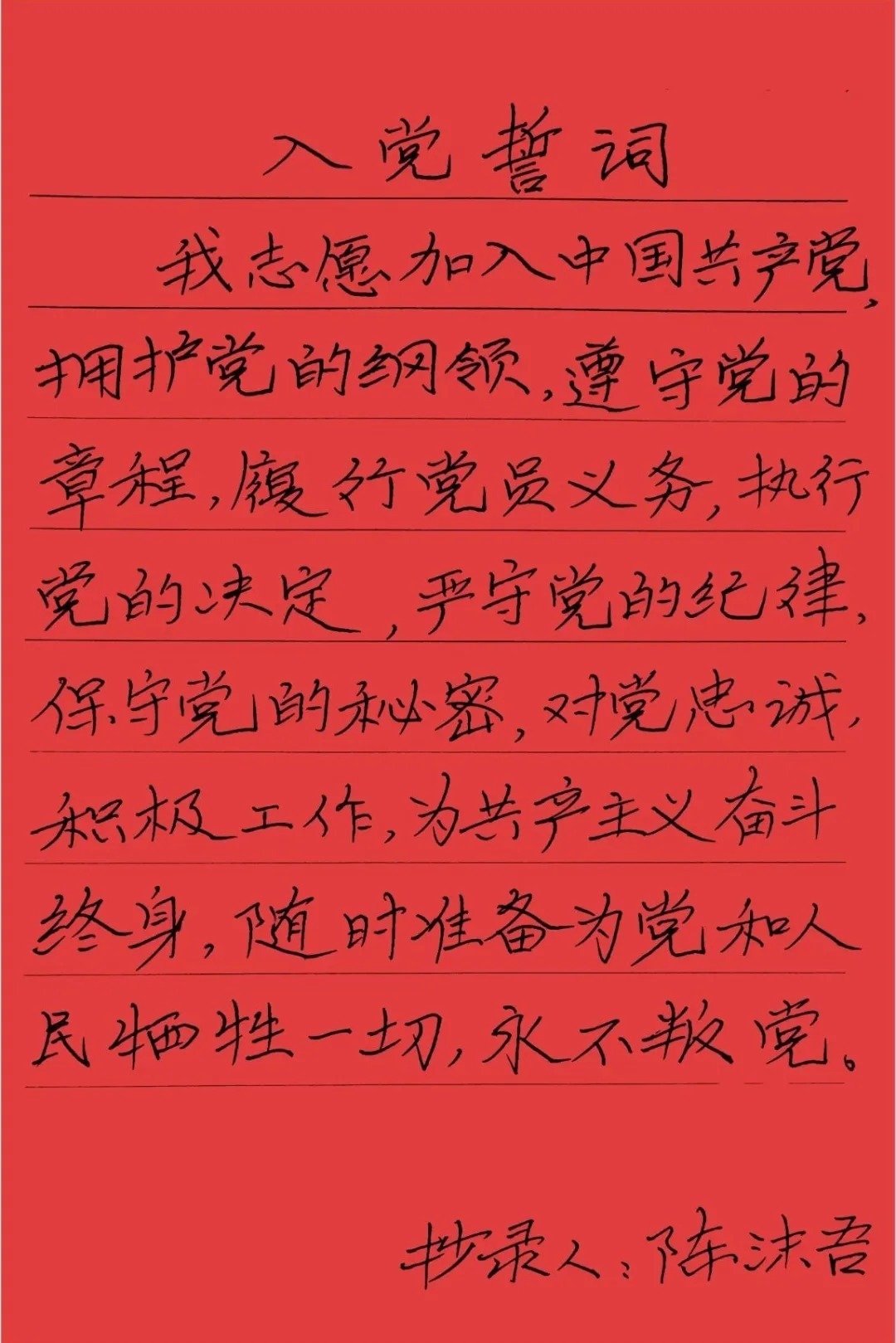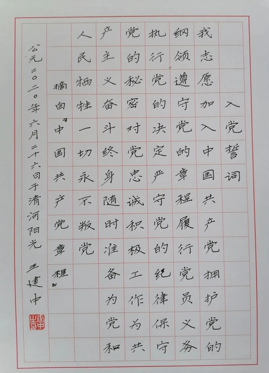 为庆祝中国共产党成立99周年,四川省硬笔书法家协会党支部组织党员再写入党誓词。通过重写入党誓词,重温党员对党和人民的庄严承诺,重记党对党员的基本要求和行为准则,增强执行党的决定、履行党员义务和严守党的纪律的自觉性,坚定为共产主义奋斗终身的信念,增强党员为协会建设和发展四川硬笔书法事业的责任感使命感。 入党誓词,“我”字开头,党在心中。入党誓词,八十个字,十二句话,字字千钧,句句铿锵。重温一次,洗礼一次。重温,提醒“我”时刻不忘初心,不忘为什么出发,才会找准方向,坚定追求,正道直行。重温,敦促“我”勿忘党员身份,一经宣誓,就意味着,“我”完成了重要的身份转换,从一名群众,成为一名党员。重温,鞭策“我”砥砺前行,入党誓词是行动指南,当成为共产党人的座右铭,不断学习之,终身践行之。 “我”是“志愿”加入中国共产党的。“志愿”里,有对共产主义的认同和向往,有终自己一生为远大理想努力奋斗的抱负,有倾自己所有为党和人民牺牲奉献的决心。初心,是无穷力量,足以战胜前路艰险;是奋斗方向,指引我们扬帆启航。理想信念旗帜高高扬起,为人民服务宗旨时时牢记,经常想想来路,始终认定目标,就会鼓足一往无前的勇气。 “入党是一阵子,做党员是一辈子。”只有刻骨铭心地牢记共产党员这个第一身份,鞠躬尽瘁地履行为党工作这个第一职责,做到任何时候都忠诚于党,与党同心同德,才能够永葆共产党人的政治本色。 今天我们注目党旗、书写誓词,用这种特殊的方式庆祝党的生日。希望协会中的共产党员,不忘初心,牢记使命,充分发挥党员的先锋模范作用,为实现“打造硬笔书法高原,攀登硬笔书法高峰”这一宏愿而不懈努力!