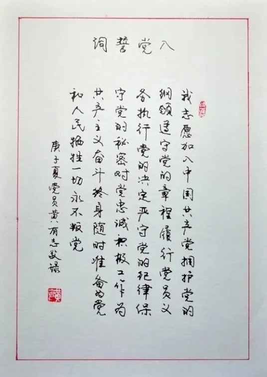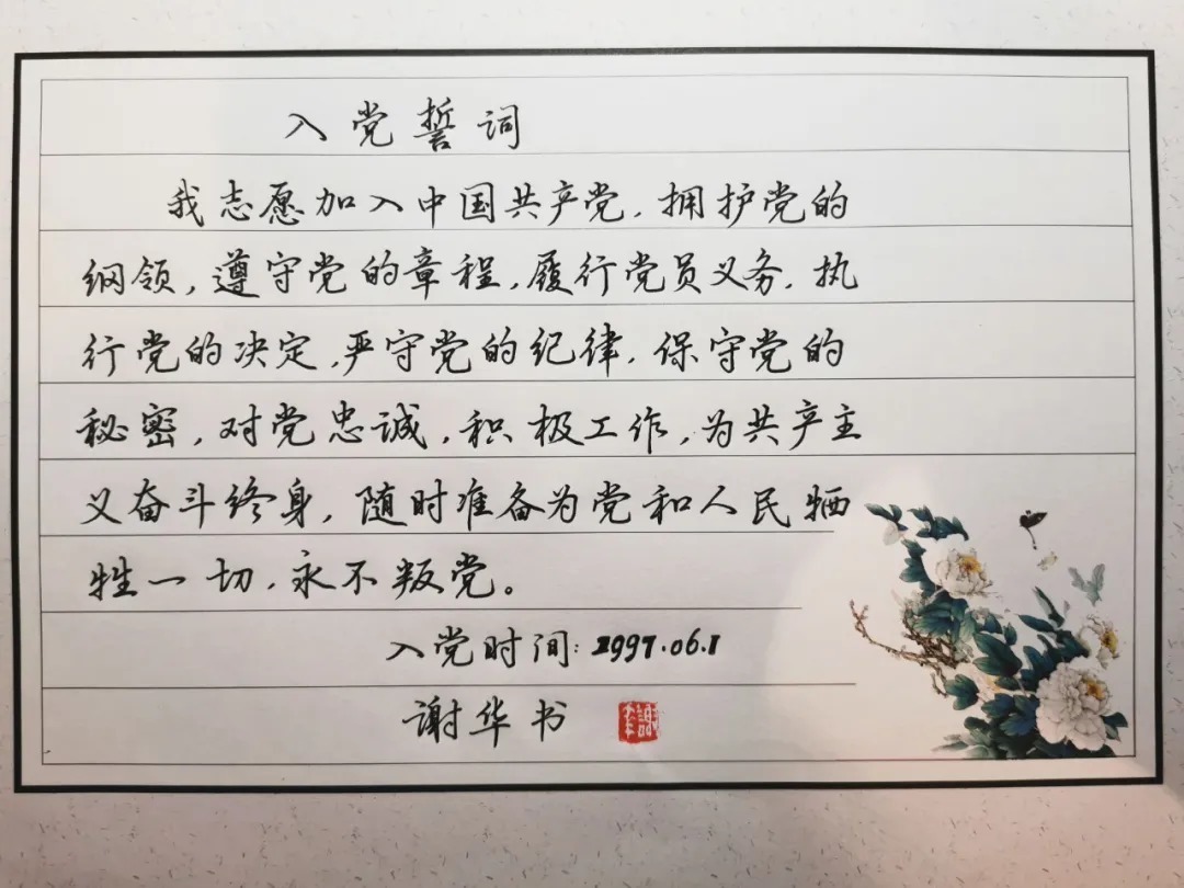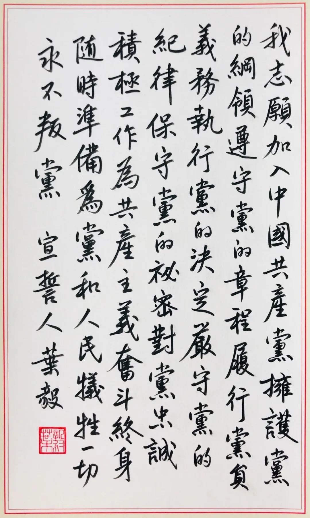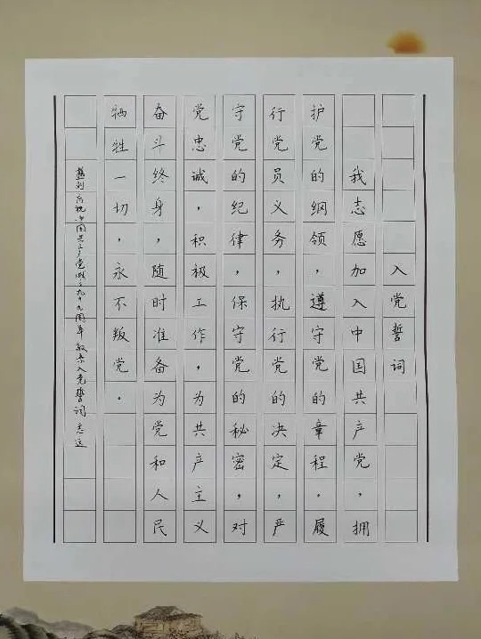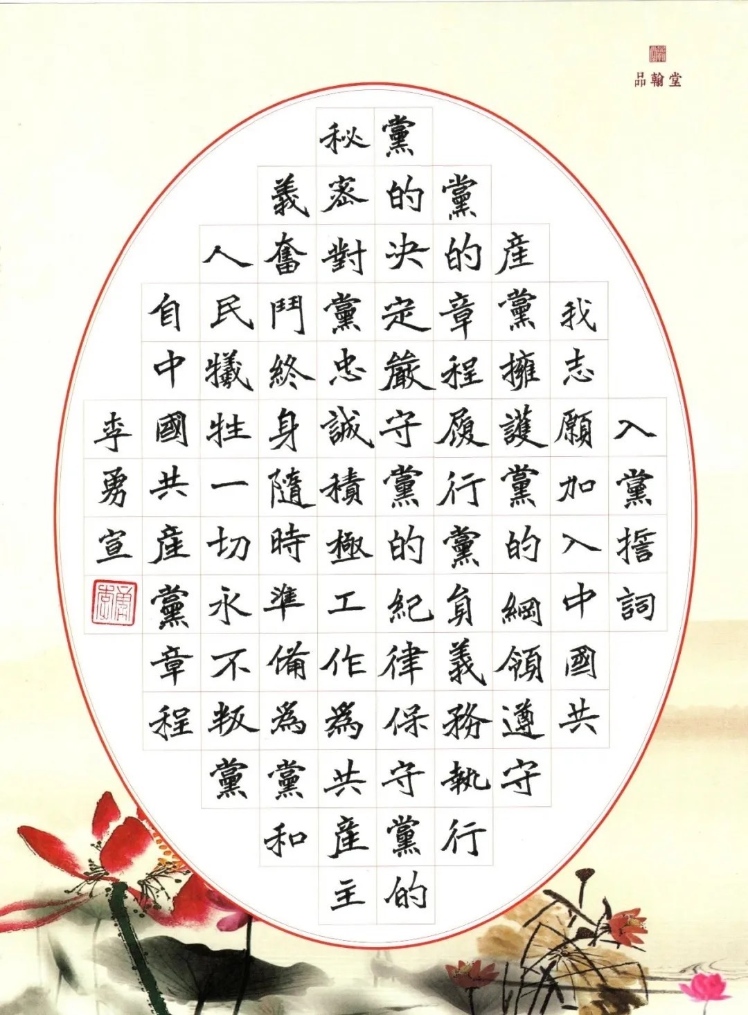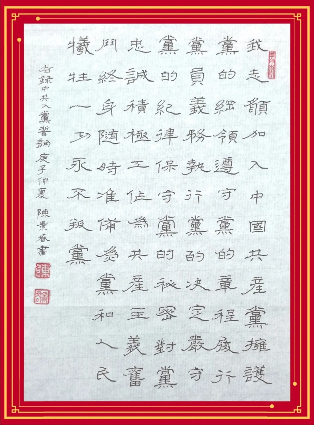 为庆祝中国共产党成立99周年,四川省硬笔书法家协会党支部组织党员再写入党誓词。通过重写入党誓词,重温党员对党和人民的庄严承诺,重记党对党员的基本要求和行为准则,增强执行党的决定、履行党员义务和严守党的纪律的自觉性,坚定为共产主义奋斗终身的信念,增强党员为协会建设和发展四川硬笔书法事业的责任感使命感。 入党誓词,“我”字开头,党在心中。入党誓词,八十个字,十二句话,字字千钧,句句铿锵。重温一次,洗礼一次。重温,提醒“我”时刻不忘初心,不忘为什么出发,才会找准方向,坚定追求,正道直行。重温,敦促“我”勿忘党员身份,一经宣誓,就意味着,“我”完成了重要的身份转换,从一名群众,成为一名党员。重温,鞭策“我”砥砺前行,入党誓词是行动指南,当成为共产党人的座右铭,不断学习之,终身践行之。 “我”是“志愿”加入中国共产党的。“志愿”里,有对共产主义的认同和向往,有终自己一生为远大理想努力奋斗的抱负,有倾自己所有为党和人民牺牲奉献的决心。初心,是无穷力量,足以战胜前路艰险;是奋斗方向,指引我们扬帆启航。理想信念旗帜高高扬起,为人民服务宗旨时时牢记,经常想想来路,始终认定目标,就会鼓足一往无前的勇气。 “入党是一阵子,做党员是一辈子。”只有刻骨铭心地牢记共产党员这个第一身份,鞠躬尽瘁地履行为党工作这个第一职责,做到任何时候都忠诚于党,与党同心同德,才能够永葆共产党人的政治本色。 今天我们注目党旗、书写誓词,用这种特殊的方式庆祝党的生日。希望协会中的共产党员,不忘初心,牢记使命,充分发挥党员的先锋模范作用,为实现“打造硬笔书法高原,攀登硬笔书法高峰”这一宏愿而不懈努力!