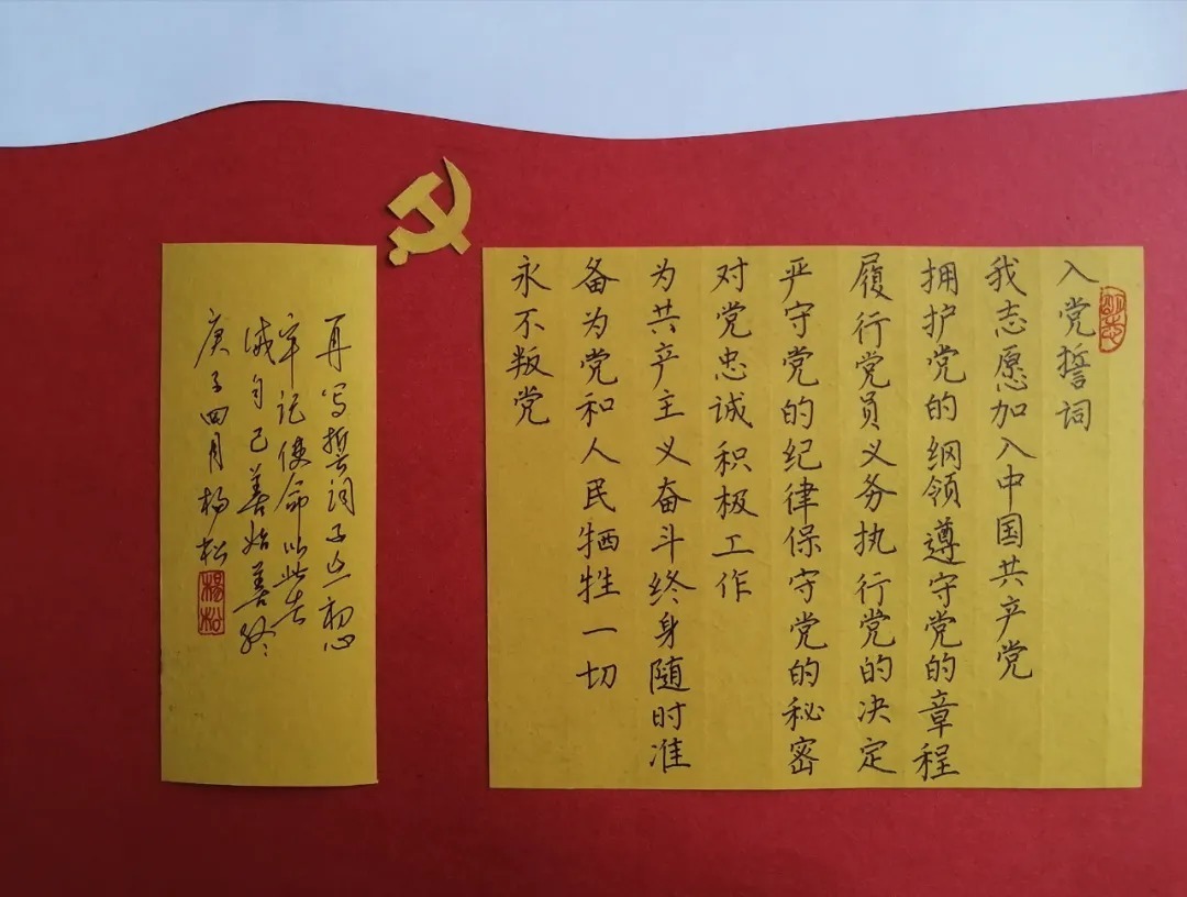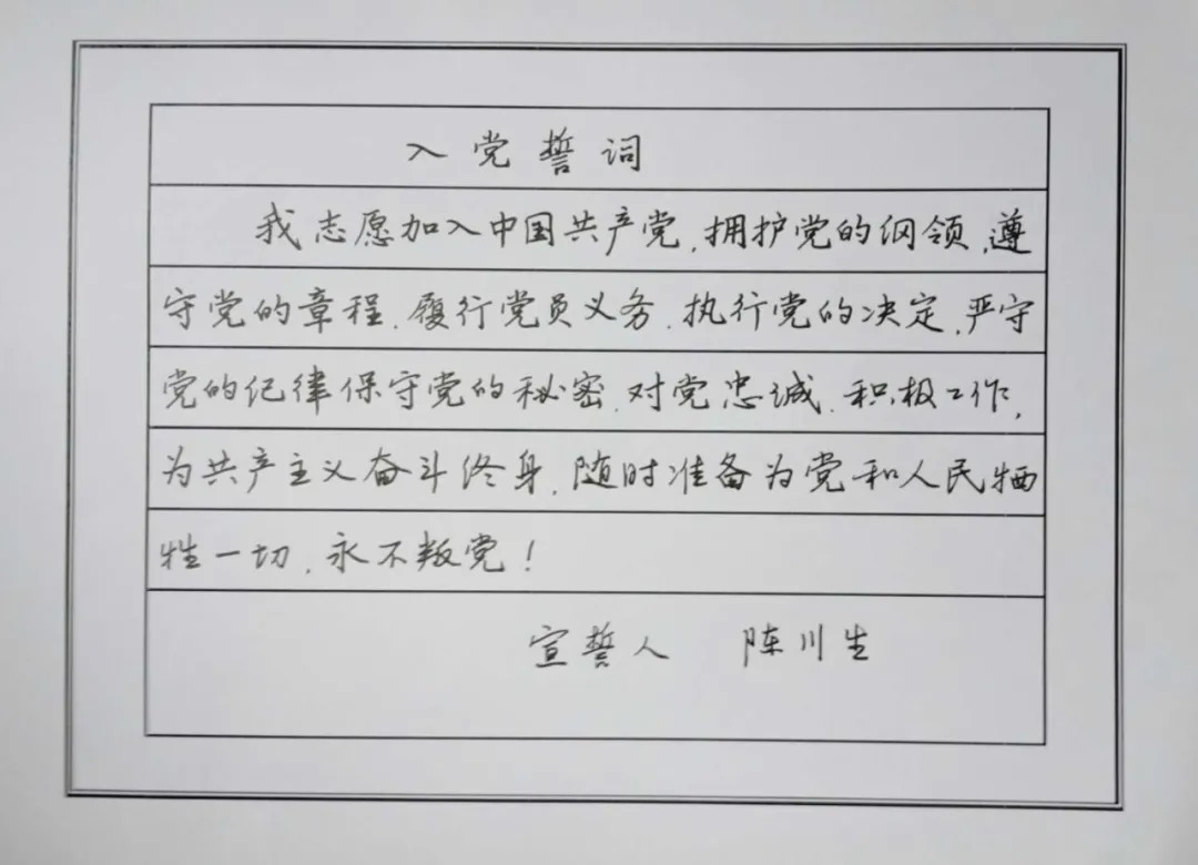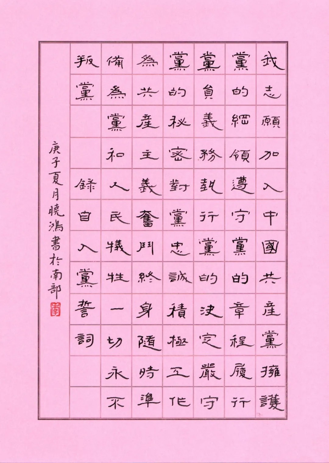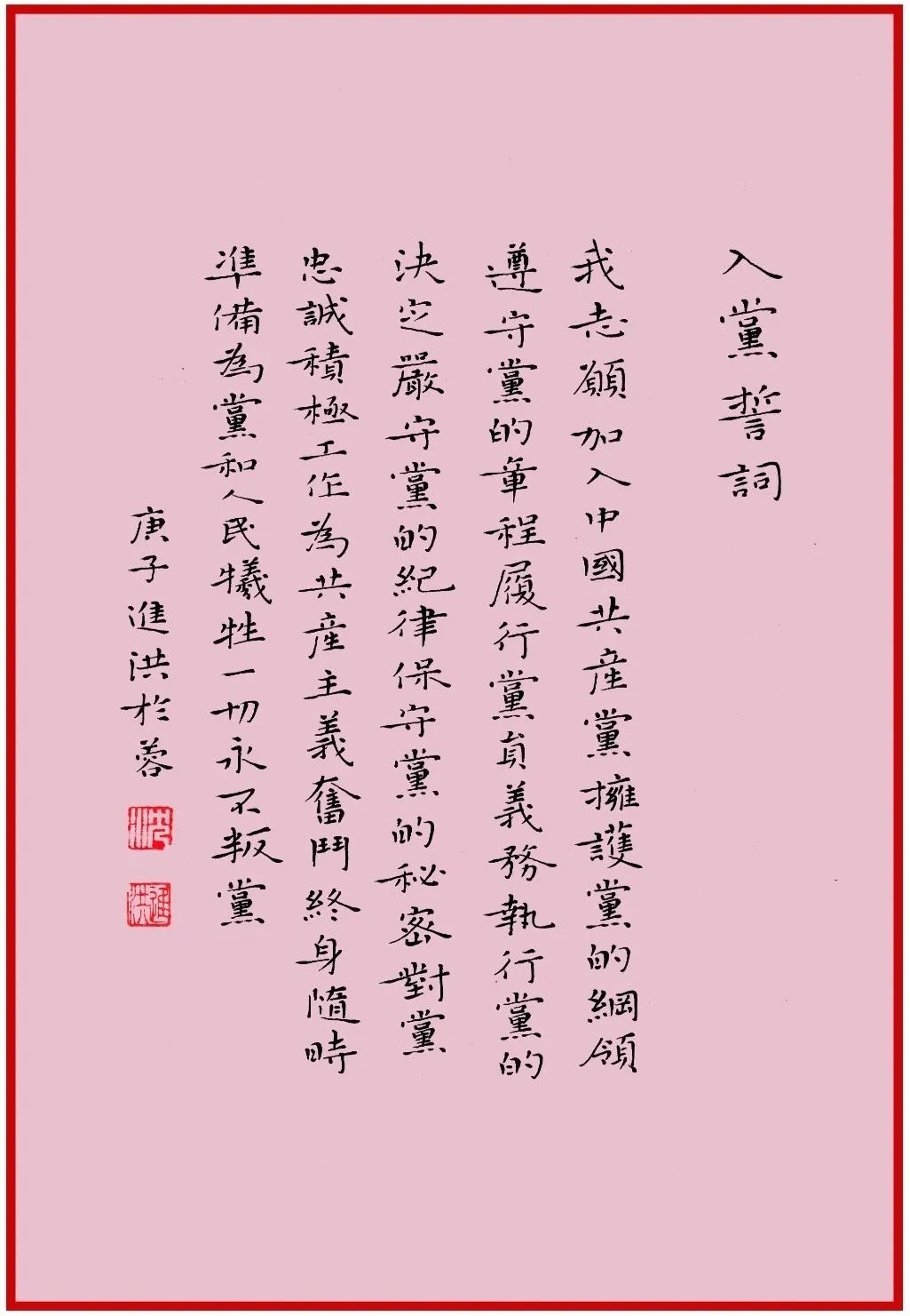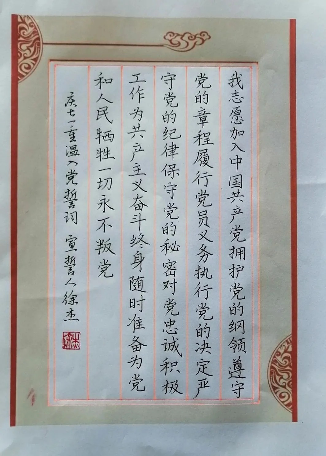 为庆祝中国共产党成立99周年,四川省硬笔书法家协会党支部组织党员再写入党誓词。通过重写入党誓词,重温党员对党和人民的庄严承诺,重记党对党员的基本要求和行为准则,增强执行党的决定、履行党员义务和严守党的纪律的自觉性,坚定为共产主义奋斗终身的信念,增强党员为协会建设和发展四川硬笔书法事业的责任感使命感。 入党誓词,“我”字开头,党在心中。入党誓词,八十个字,十二句话,字字千钧,句句铿锵。重温一次,洗礼一次。重温,提醒“我”时刻不忘初心,不忘为什么出发,才会找准方向,坚定追求,正道直行。重温,敦促“我”勿忘党员身份,一经宣誓,就意味着,“我”完成了重要的身份转换,从一名群众,成为一名党员。重温,鞭策“我”砥砺前行,入党誓词是行动指南,当成为共产党人的座右铭,不断学习之,终身践行之。 “我”是“志愿”加入中国共产党的。“志愿”里,有对共产主义的认同和向往,有终自己一生为远大理想努力奋斗的抱负,有倾自己所有为党和人民牺牲奉献的决心。初心,是无穷力量,足以战胜前路艰险;是奋斗方向,指引我们扬帆启航。理想信念旗帜高高扬起,为人民服务宗旨时时牢记,经常想想来路,始终认定目标,就会鼓足一往无前的勇气。 “入党是一阵子,做党员是一辈子。”只有刻骨铭心地牢记共产党员这个第一身份,鞠躬尽瘁地履行为党工作这个第一职责,做到任何时候都忠诚于党,与党同心同德,才能够永葆共产党人的政治本色。 今天我们注目党旗、书写誓词,用这种特殊的方式庆祝党的生日。希望协会中的共产党员,不忘初心,牢记使命,充分发挥党员的先锋模范作用,为实现“打造硬笔书法高原,攀登硬笔书法高峰”这一宏愿而不懈努力!