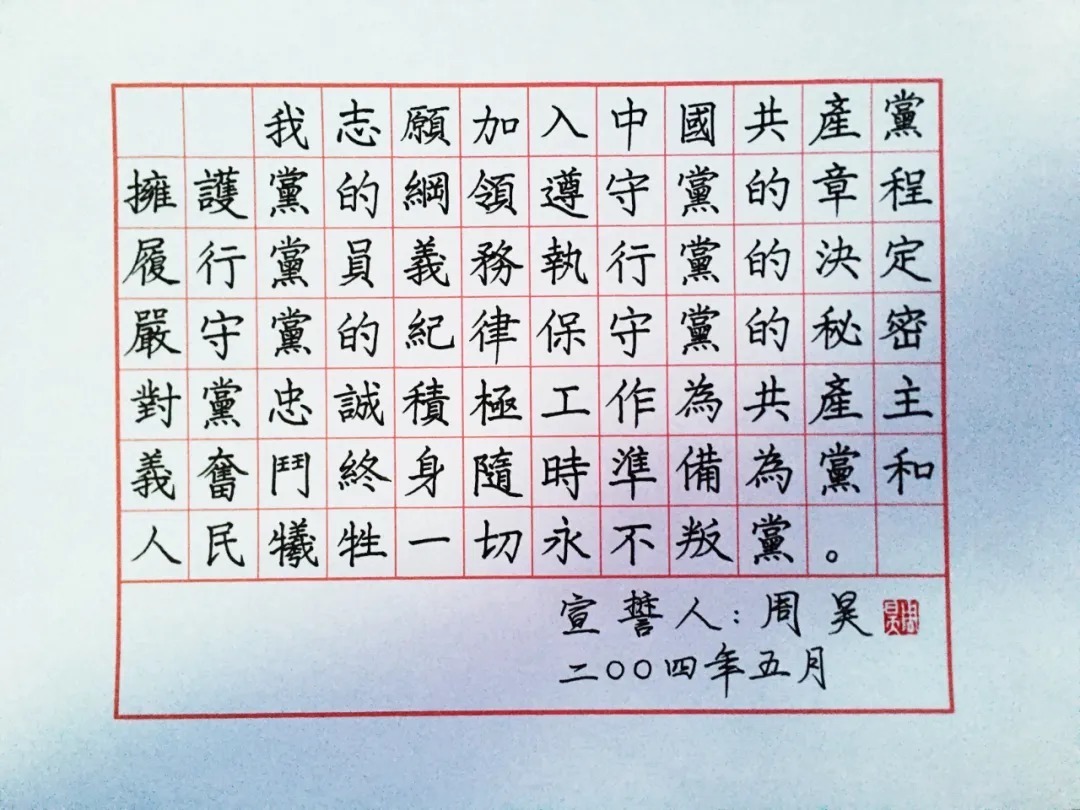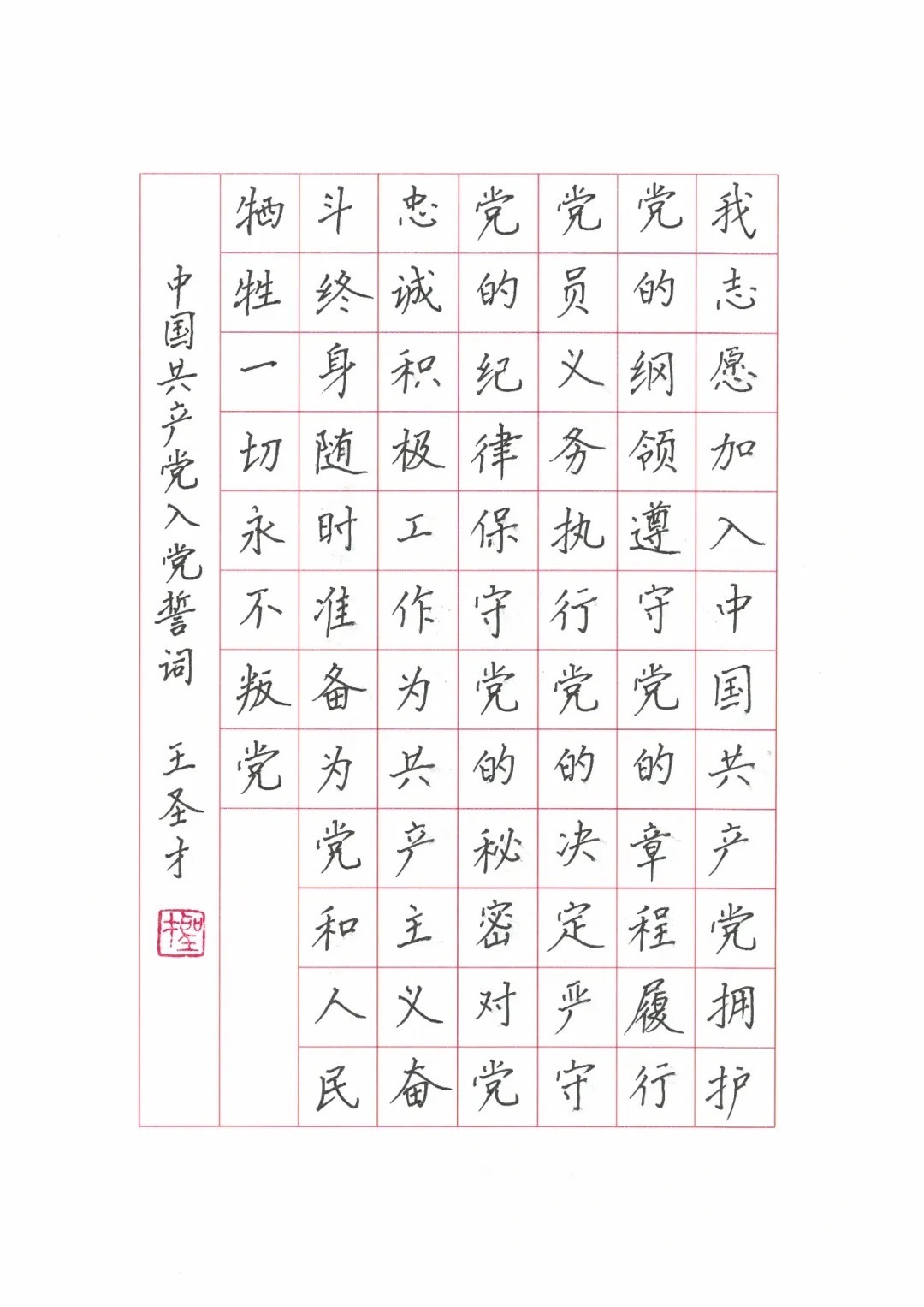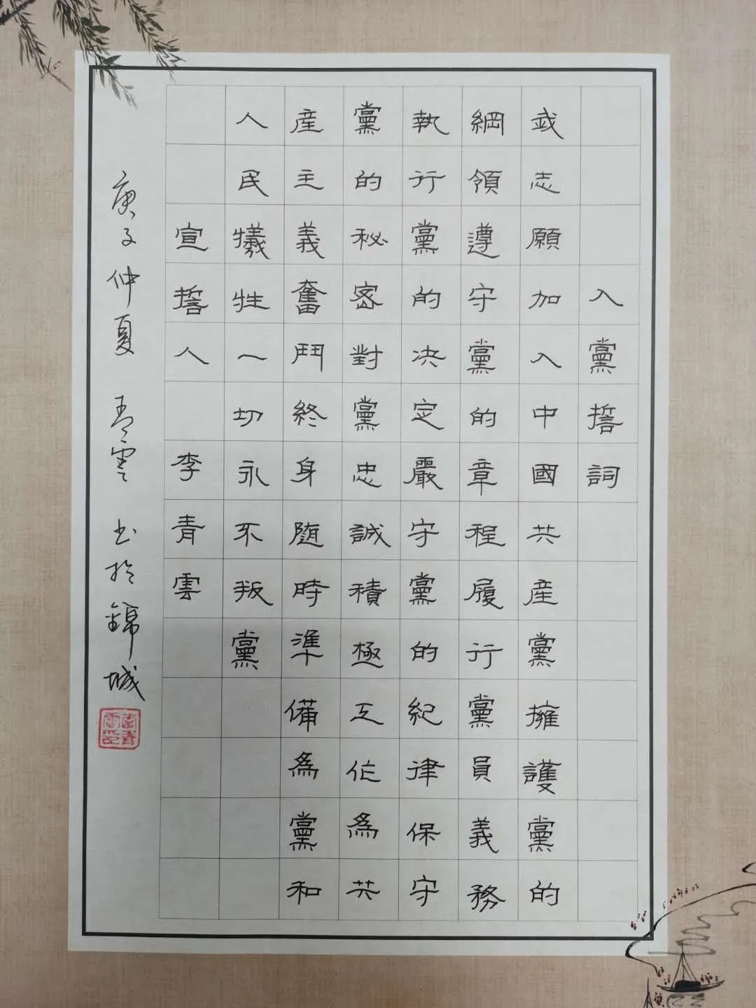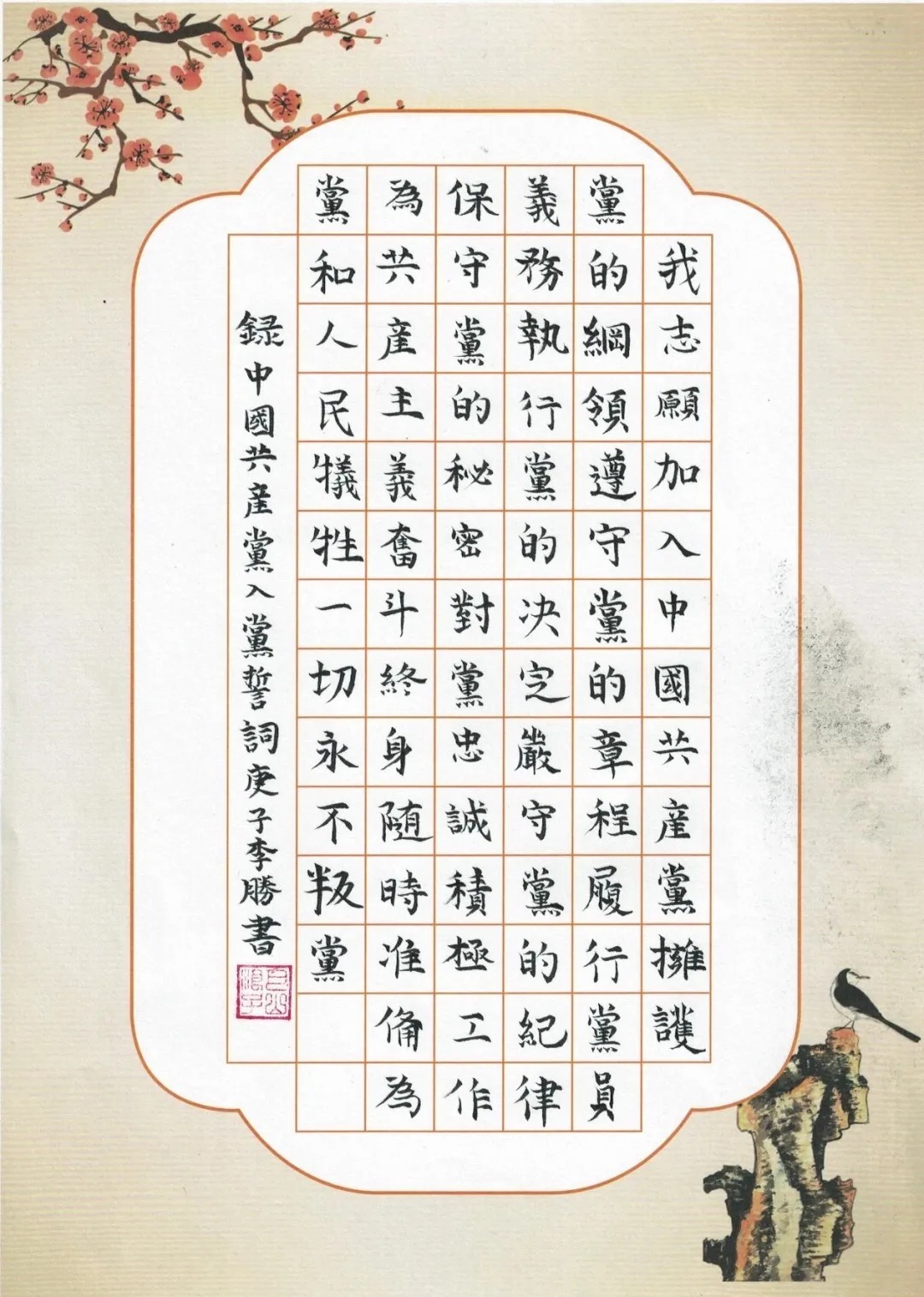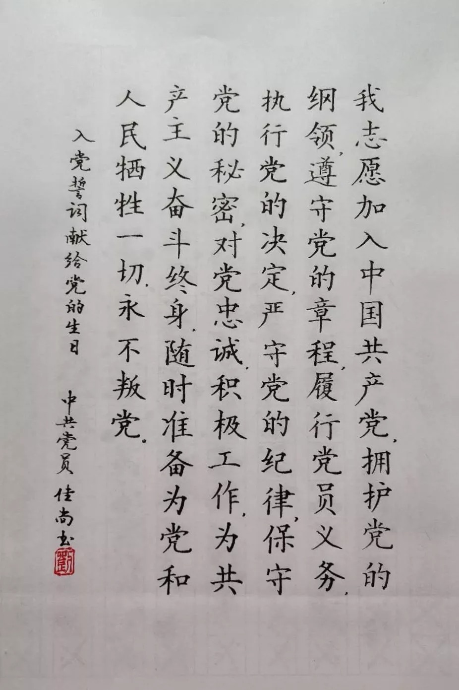 为庆祝中国共产党成立99周年,四川省硬笔书法家协会党支部组织党员再写入党誓词。通过重写入党誓词,重温党员对党和人民的庄严承诺,重记党对党员的基本要求和行为准则,增强执行党的决定、履行党员义务和严守党的纪律的自觉性,坚定为共产主义奋斗终身的信念,增强党员为协会建设和发展四川硬笔书法事业的责任感使命感。 入党誓词,“我”字开头,党在心中。入党誓词,八十个字,十二句话,字字千钧,句句铿锵。重温一次,洗礼一次。重温,提醒“我”时刻不忘初心,不忘为什么出发,才会找准方向,坚定追求,正道直行。重温,敦促“我”勿忘党员身份,一经宣誓,就意味着,“我”完成了重要的身份转换,从一名群众,成为一名党员。重温,鞭策“我”砥砺前行,入党誓词是行动指南,当成为共产党人的座右铭,不断学习之,终身践行之。 “我”是“志愿”加入中国共产党的。“志愿”里,有对共产主义的认同和向往,有终自己一生为远大理想努力奋斗的抱负,有倾自己所有为党和人民牺牲奉献的决心。初心,是无穷力量,足以战胜前路艰险;是奋斗方向,指引我们扬帆启航。理想信念旗帜高高扬起,为人民服务宗旨时时牢记,经常想想来路,始终认定目标,就会鼓足一往无前的勇气。 “入党是一阵子,做党员是一辈子。”只有刻骨铭心地牢记共产党员这个第一身份,鞠躬尽瘁地履行为党工作这个第一职责,做到任何时候都忠诚于党,与党同心同德,才能够永葆共产党人的政治本色。 今天我们注目党旗、书写誓词,用这种特殊的方式庆祝党的生日。希望协会中的共产党员,不忘初心,牢记使命,充分发挥党员的先锋模范作用,为实现“打造硬笔书法高原,攀登硬笔书法高峰”这一宏愿而不懈努力!