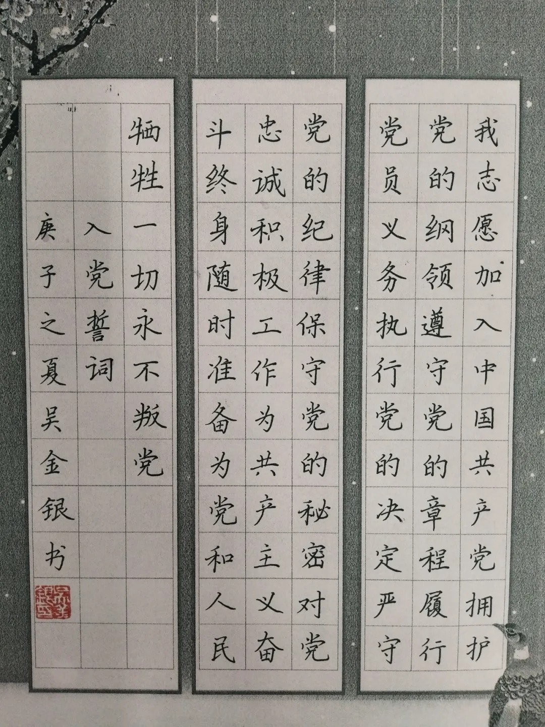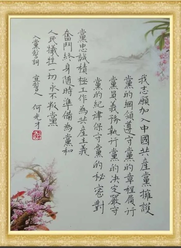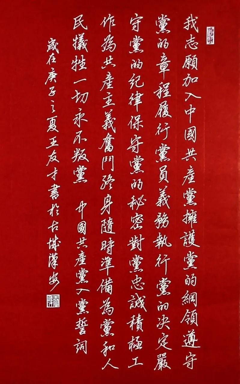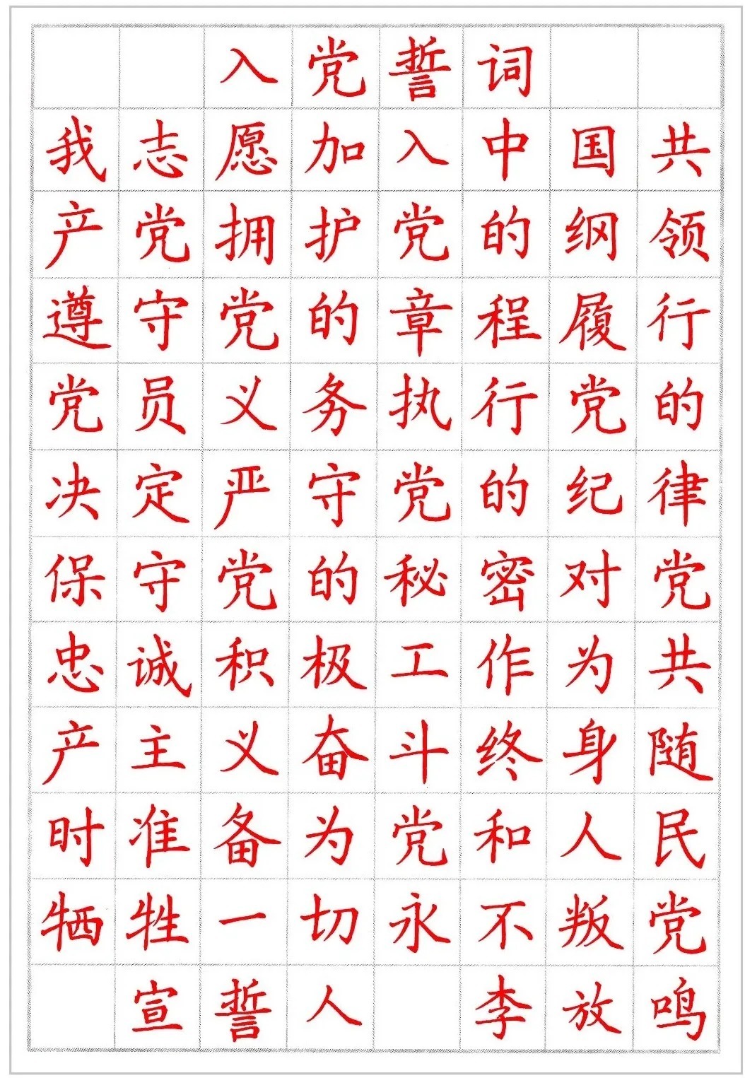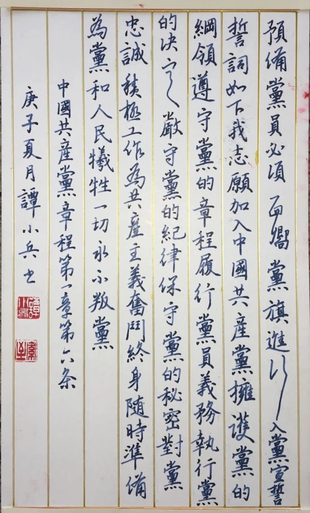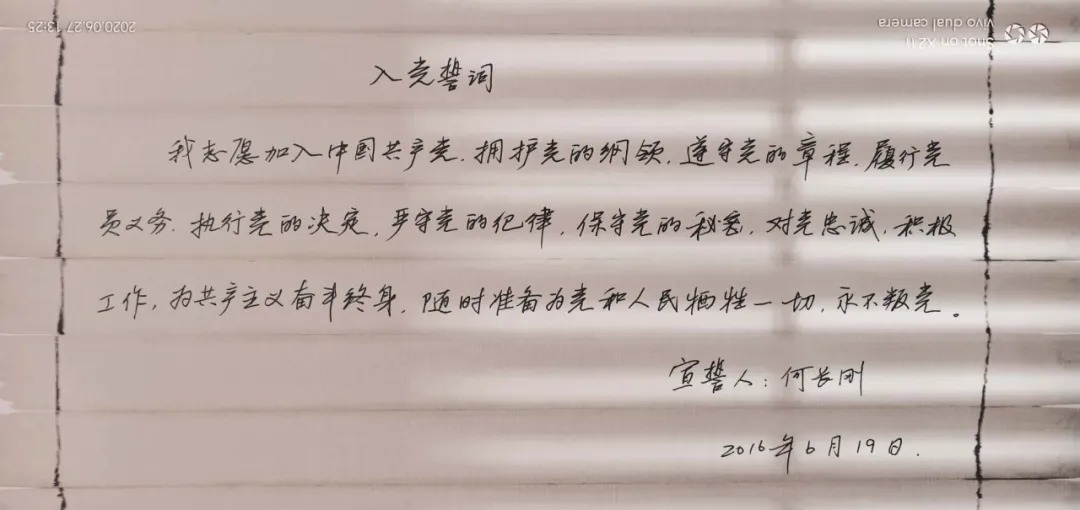 为庆祝中国共产党成立99周年,四川省硬笔书法家协会党支部组织党员再写入党誓词。通过重写入党誓词,重温党员对党和人民的庄严承诺,重记党对党员的基本要求和行为准则,增强执行党的决定、履行党员义务和严守党的纪律的自觉性,坚定为共产主义奋斗终身的信念,增强党员为协会建设和发展四川硬笔书法事业的责任感使命感。 入党誓词,“我”字开头,党在心中。入党誓词,八十个字,十二句话,字字千钧,句句铿锵。重温一次,洗礼一次。重温,提醒“我”时刻不忘初心,不忘为什么出发,才会找准方向,坚定追求,正道直行。重温,敦促“我”勿忘党员身份,一经宣誓,就意味着,“我”完成了重要的身份转换,从一名群众,成为一名党员。重温,鞭策“我”砥砺前行,入党誓词是行动指南,当成为共产党人的座右铭,不断学习之,终身践行之。 “我”是“志愿”加入中国共产党的。“志愿”里,有对共产主义的认同和向往,有终自己一生为远大理想努力奋斗的抱负,有倾自己所有为党和人民牺牲奉献的决心。初心,是无穷力量,足以战胜前路艰险;是奋斗方向,指引我们扬帆启航。理想信念旗帜高高扬起,为人民服务宗旨时时牢记,经常想想来路,始终认定目标,就会鼓足一往无前的勇气。 “入党是一阵子,做党员是一辈子。”只有刻骨铭心地牢记共产党员这个第一身份,鞠躬尽瘁地履行为党工作这个第一职责,做到任何时候都忠诚于党,与党同心同德,才能够永葆共产党人的政治本色。 今天我们注目党旗、书写誓词,用这种特殊的方式庆祝党的生日。希望协会中的共产党员,不忘初心,牢记使命,充分发挥党员的先锋模范作用,为实现“打造硬笔书法高原,攀登硬笔书法高峰”这一宏愿而不懈努力!