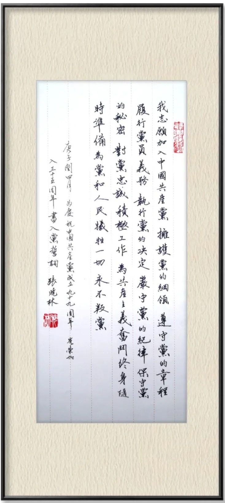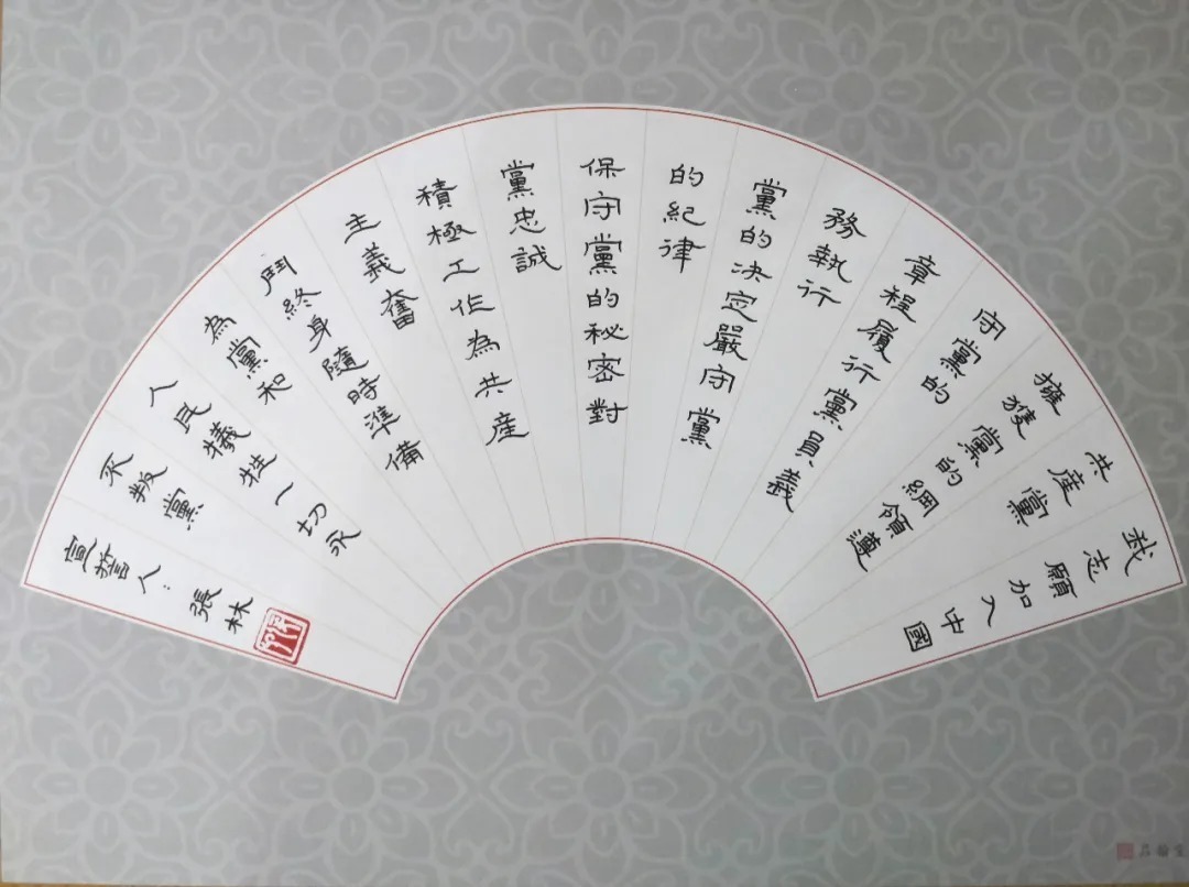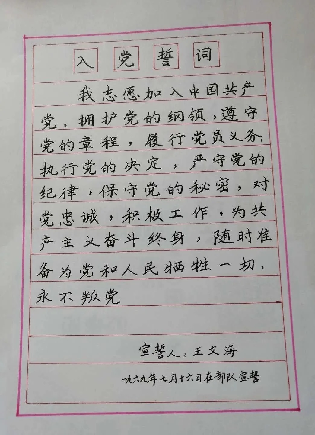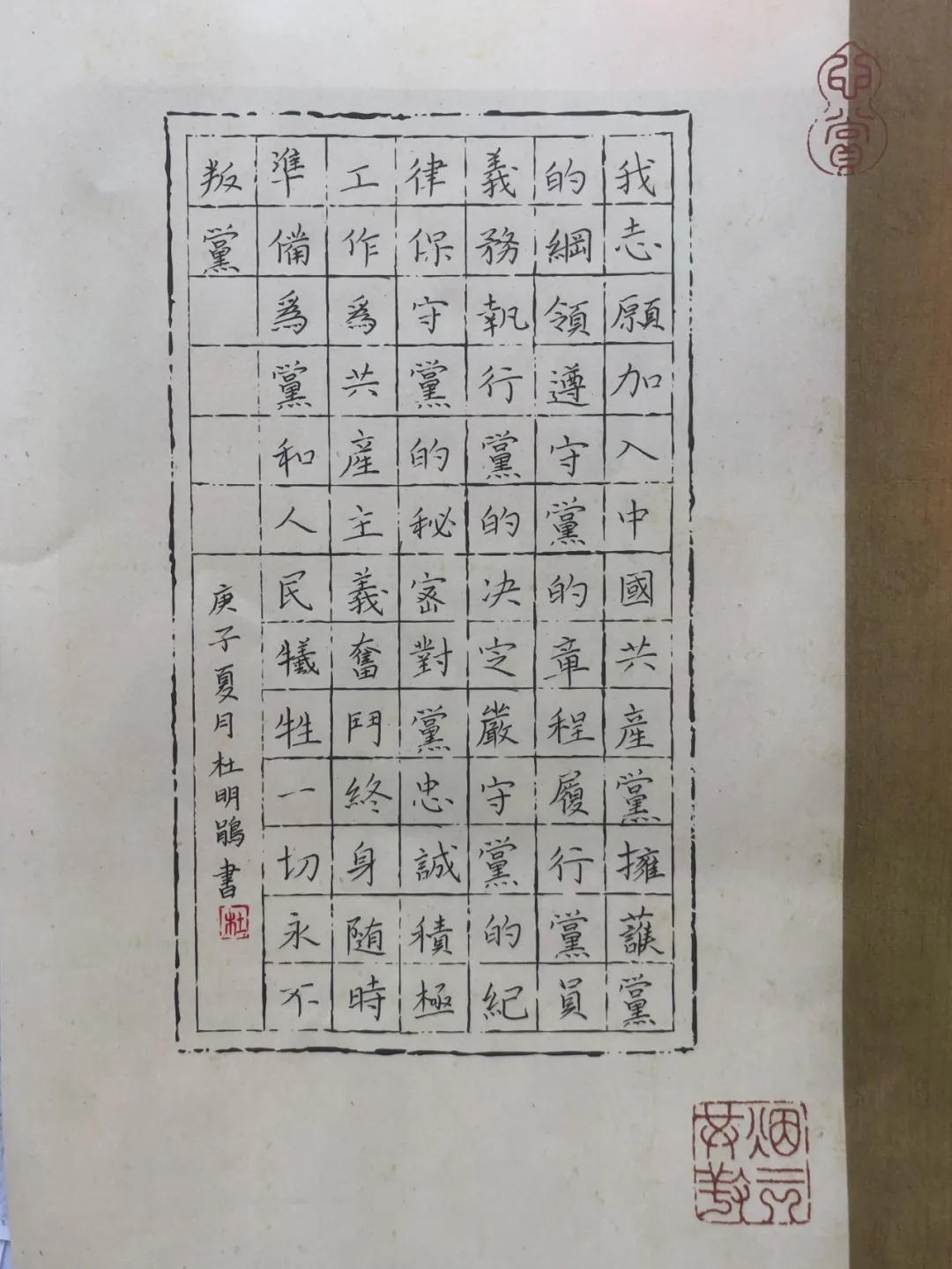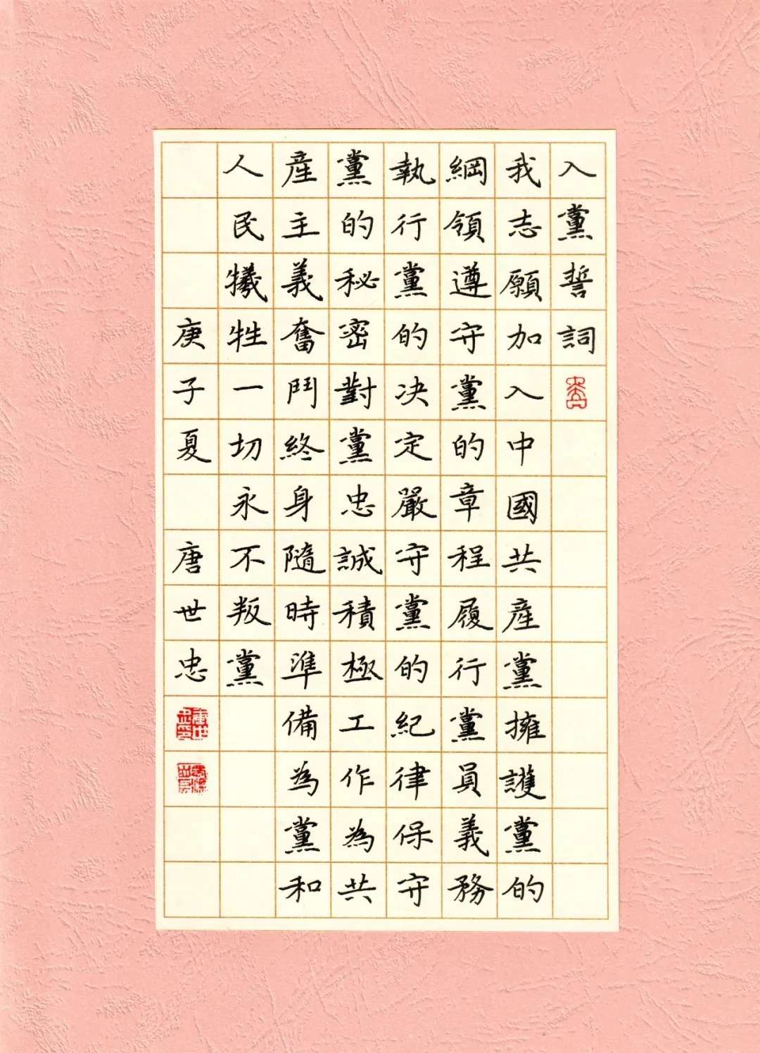 为庆祝中国共产党成立99周年,四川省硬笔书法家协会党支部组织党员再写入党誓词。通过重写入党誓词,重温党员对党和人民的庄严承诺,重记党对党员的基本要求和行为准则,增强执行党的决定、履行党员义务和严守党的纪律的自觉性,坚定为共产主义奋斗终身的信念,增强党员为协会建设和发展四川硬笔书法事业的责任感使命感。 入党誓词,“我”字开头,党在心中。入党誓词,八十个字,十二句话,字字千钧,句句铿锵。重温一次,洗礼一次。重温,提醒“我”时刻不忘初心,不忘为什么出发,才会找准方向,坚定追求,正道直行。重温,敦促“我”勿忘党员身份,一经宣誓,就意味着,“我”完成了重要的身份转换,从一名群众,成为一名党员。重温,鞭策“我”砥砺前行,入党誓词是行动指南,当成为共产党人的座右铭,不断学习之,终身践行之。 “我”是“志愿”加入中国共产党的。“志愿”里,有对共产主义的认同和向往,有终自己一生为远大理想努力奋斗的抱负,有倾自己所有为党和人民牺牲奉献的决心。初心,是无穷力量,足以战胜前路艰险;是奋斗方向,指引我们扬帆启航。理想信念旗帜高高扬起,为人民服务宗旨时时牢记,经常想想来路,始终认定目标,就会鼓足一往无前的勇气。 “入党是一阵子,做党员是一辈子。”只有刻骨铭心地牢记共产党员这个第一身份,鞠躬尽瘁地履行为党工作这个第一职责,做到任何时候都忠诚于党,与党同心同德,才能够永葆共产党人的政治本色。 今天我们注目党旗、书写誓词,用这种特殊的方式庆祝党的生日。希望协会中的共产党员,不忘初心,牢记使命,充分发挥党员的先锋模范作用,为实现“打造硬笔书法高原,攀登硬笔书法高峰”这一宏愿而不懈努力!