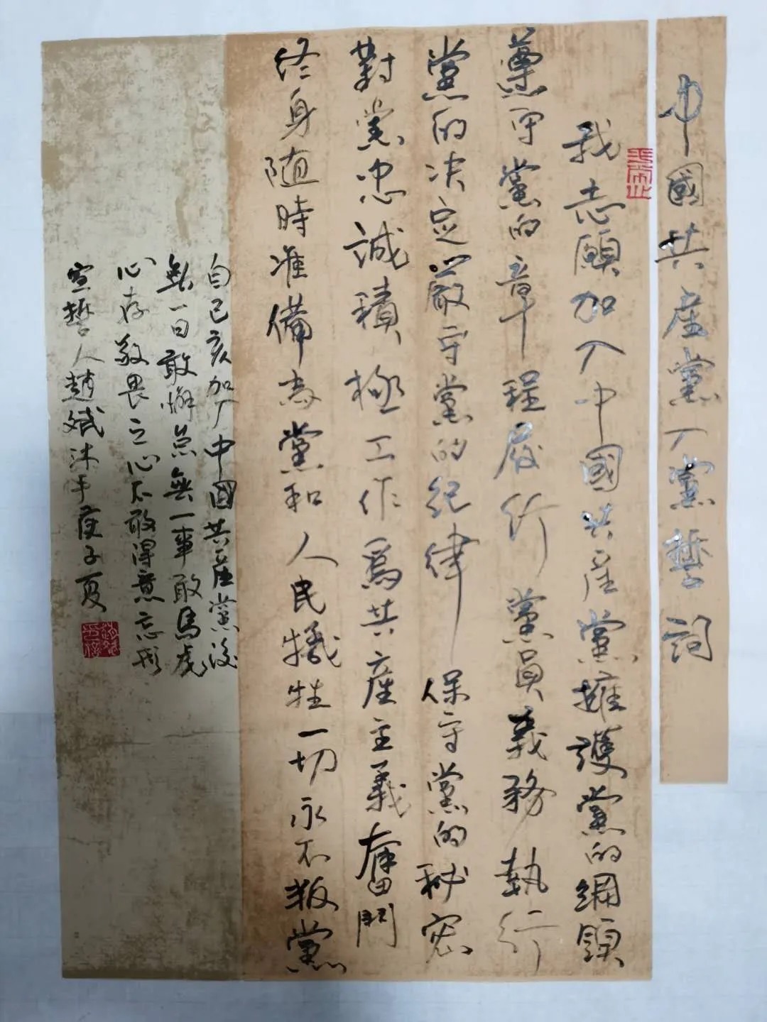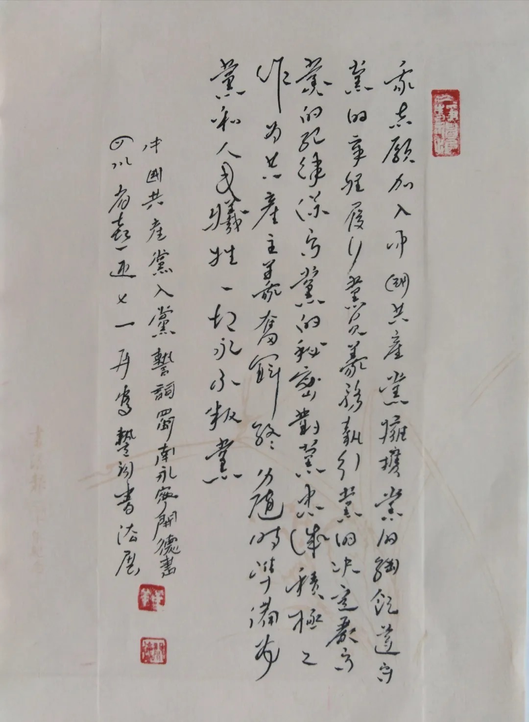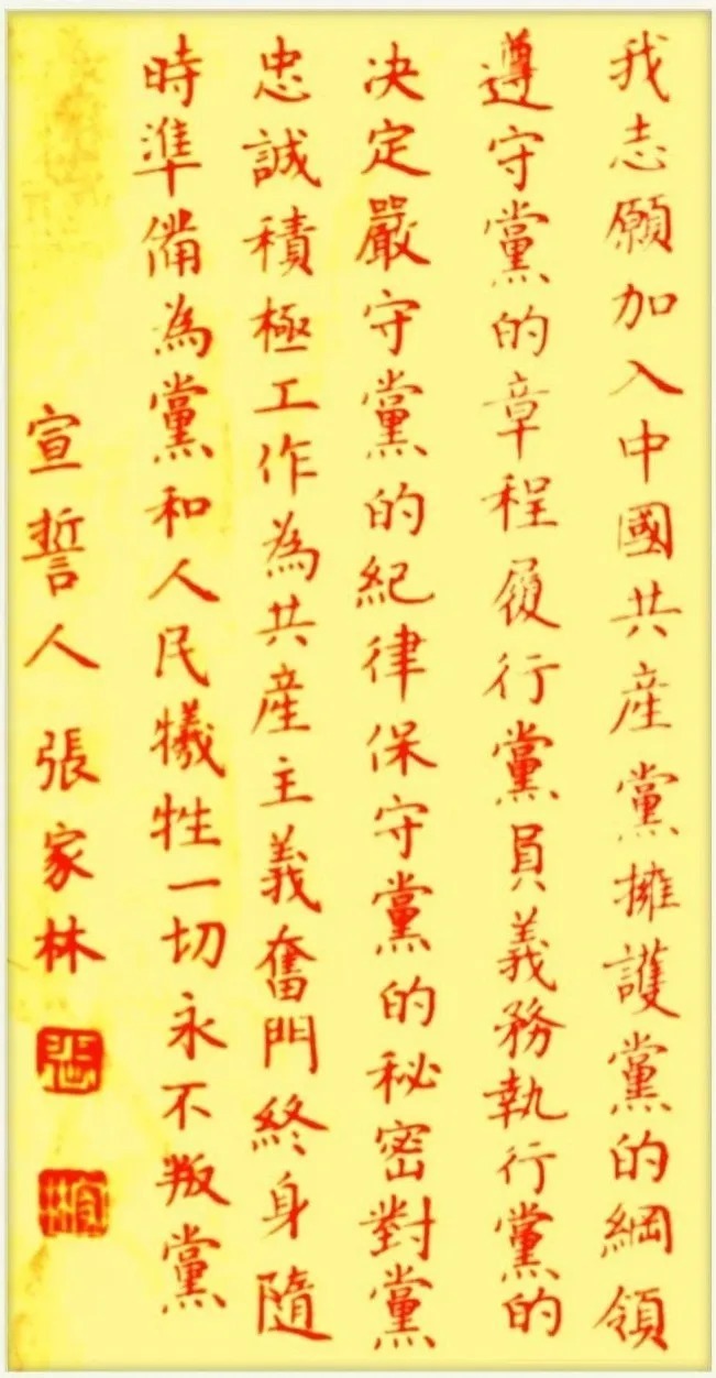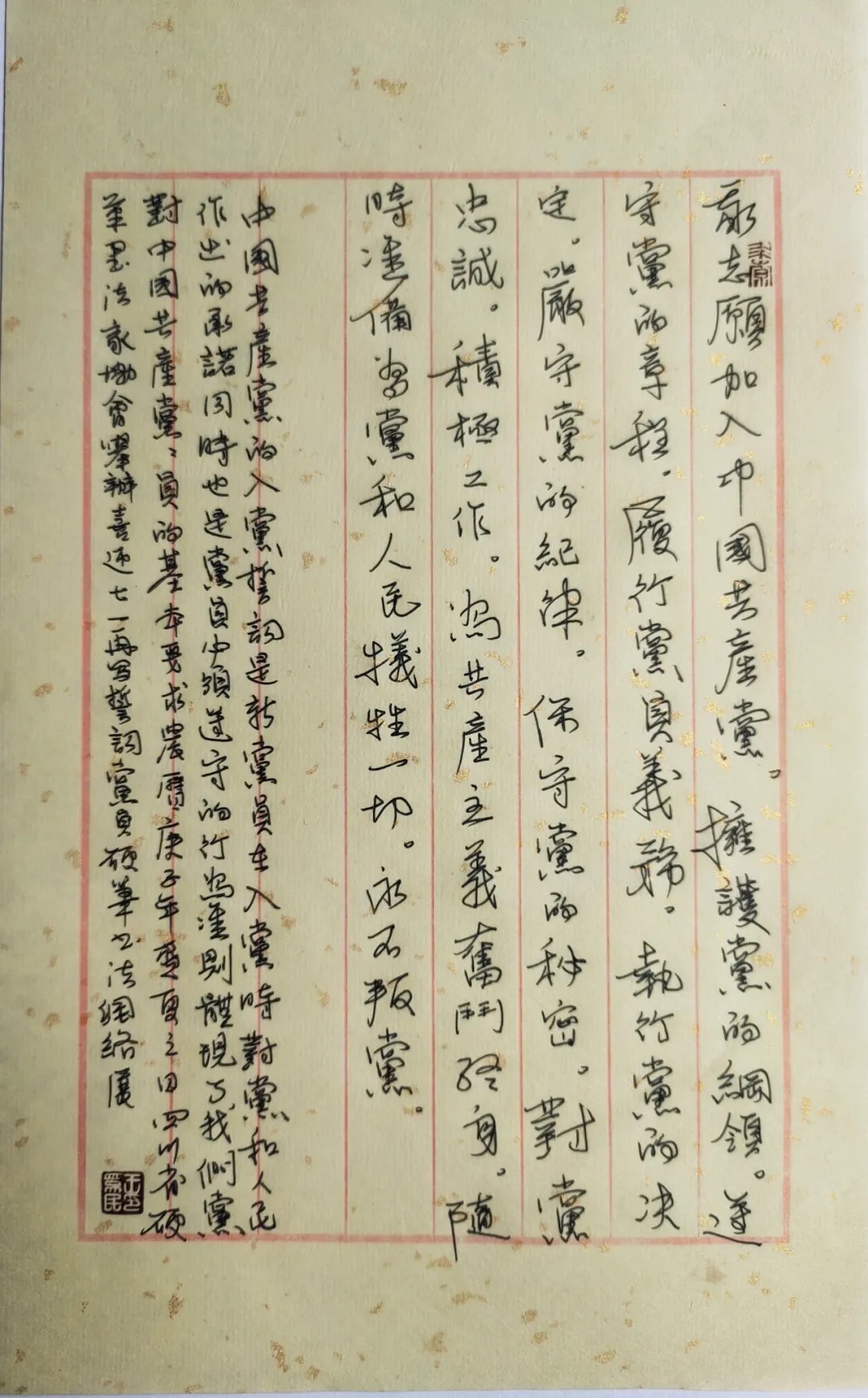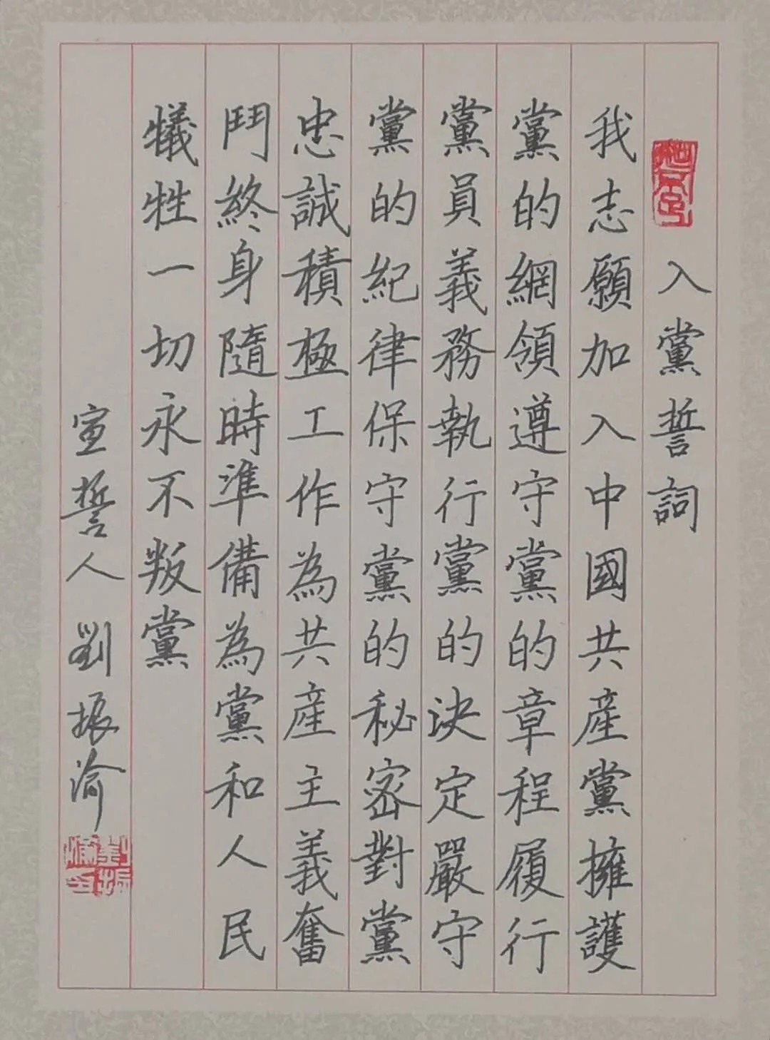 为庆祝中国共产党成立99周年,四川省硬笔书法家协会党支部组织党员再写入党誓词。通过重写入党誓词,重温党员对党和人民的庄严承诺,重记党对党员的基本要求和行为准则,增强执行党的决定、履行党员义务和严守党的纪律的自觉性,坚定为共产主义奋斗终身的信念,增强党员为协会建设和发展四川硬笔书法事业的责任感使命感。 入党誓词,“我”字开头,党在心中。入党誓词,八十个字,十二句话,字字千钧,句句铿锵。重温一次,洗礼一次。重温,提醒“我”时刻不忘初心,不忘为什么出发,才会找准方向,坚定追求,正道直行。重温,敦促“我”勿忘党员身份,一经宣誓,就意味着,“我”完成了重要的身份转换,从一名群众,成为一名党员。重温,鞭策“我”砥砺前行,入党誓词是行动指南,当成为共产党人的座右铭,不断学习之,终身践行之。 “我”是“志愿”加入中国共产党的。“志愿”里,有对共产主义的认同和向往,有终自己一生为远大理想努力奋斗的抱负,有倾自己所有为党和人民牺牲奉献的决心。初心,是无穷力量,足以战胜前路艰险;是奋斗方向,指引我们扬帆启航。理想信念旗帜高高扬起,为人民服务宗旨时时牢记,经常想想来路,始终认定目标,就会鼓足一往无前的勇气。 “入党是一阵子,做党员是一辈子。”只有刻骨铭心地牢记共产党员这个第一身份,鞠躬尽瘁地履行为党工作这个第一职责,做到任何时候都忠诚于党,与党同心同德,才能够永葆共产党人的政治本色。 今天我们注目党旗、书写誓词,用这种特殊的方式庆祝党的生日。希望协会中的共产党员,不忘初心,牢记使命,充分发挥党员的先锋模范作用,为实现“打造硬笔书法高原,攀登硬笔书法高峰”这一宏愿而不懈努力!