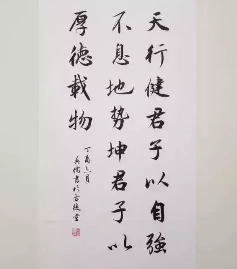 两行的格式。左右两行均靠纸的左右两边写,中间留出较多空白。注意上下字的联系节奏,以及两行间的彼此呼应。落款通常写在第二行的末尾,位置应略高于第一行末一个字。款字可写一行或两行。三行的格式,需注意三行之间的相互关系,穿插映带及节奏变化。落款可在末行下端,底端略高于一、二两行正文的位置;也可另行写款,款字应短于正文,上下不宜与正文平行。书写内容一般为格言、警句或一句诗词等。字数较少,写时要注意字的开合及节奏变化,以求生动。落款可分单款、双款。单款一般写在左侧中间的位置。款字内容包括书写时间、作者的名号,也可只写作者名或号。印章盖在款字下方,一般以两方为宜,印与印之间要适当拉开距离。落双款,上款写在作品的右侧中间偏上的部分,一般写创作作品的时间,若是赠送作品,则需写明被赠者的名或号,称谓及雅正、惠存,清赏等字样。