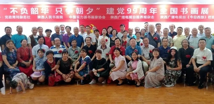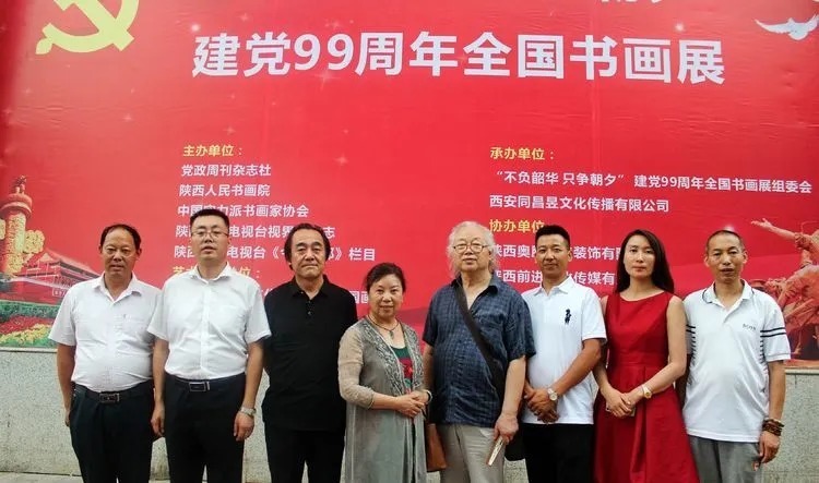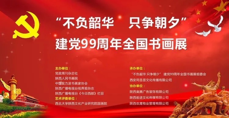值此中国共产党建党99周年之际由党政周刊杂志社、陕西人民书画院、中国实力派书画家协会、陕西广播电视台视界观杂志、陕西广播电视台《今日西部》栏目联合主办,“不负韶华 只争朝夕” 建党99周年全国书画展组委会、西安同昌昱文化传播有限公司承办。陕西奥腾广告装饰有限公司、陕西前进文化传媒有限公司、陕西双鹰物业管理有限公司协办。