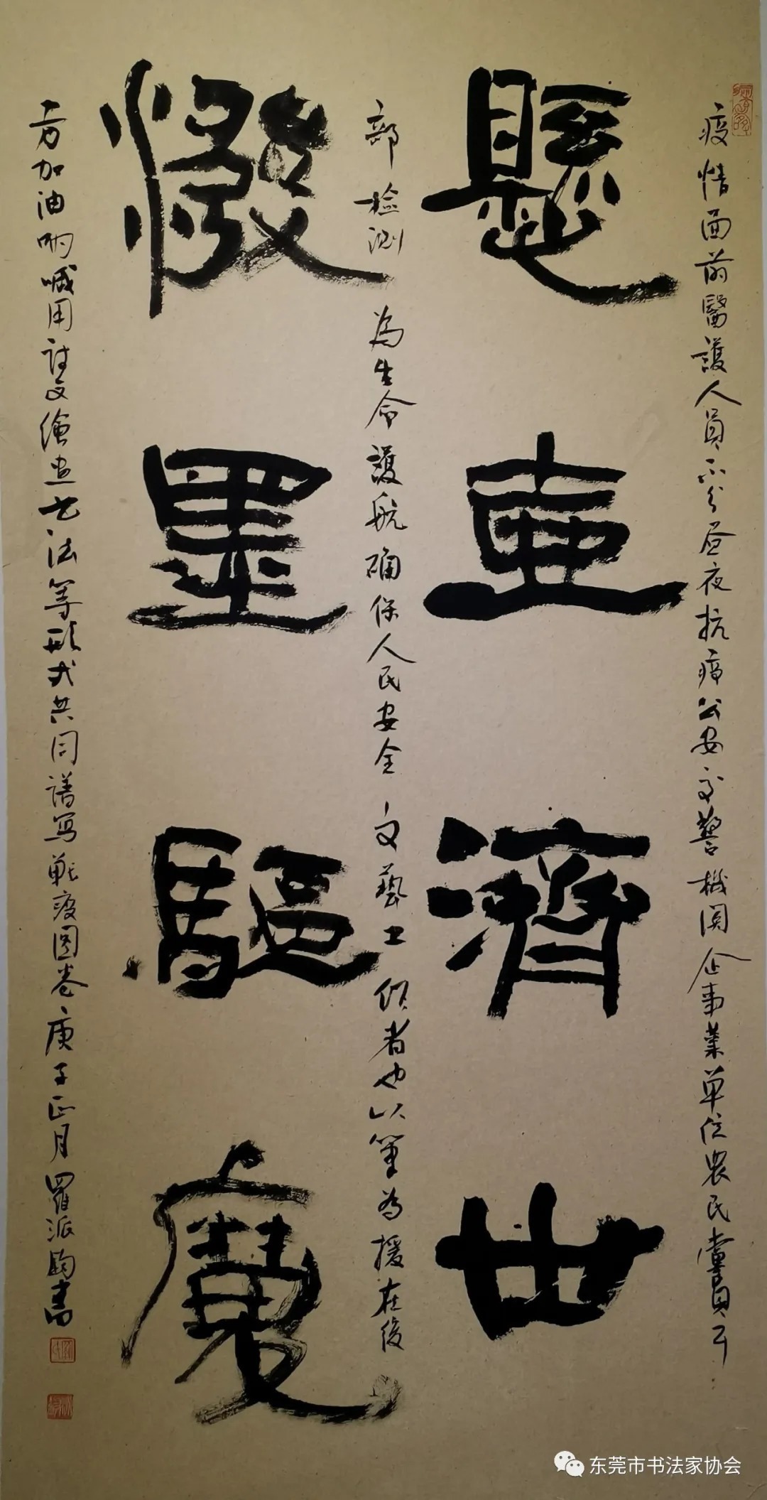 根据中国文联和广东省文联及东莞市文联的通知精神要求,东莞市书法家协会积极响应上级的号召,为配合做好疫情防控工作,东莞书法家和书法爱好者们众志成城、同舟共济,精心组织策划开展以艺“抗疫”活动。东莞市书法家协会于今年1月31日、2月11日分别联合东莞市文联、南方日报•东莞新闻、东莞报业传媒集团举办东莞市“防疫控情、风雨同舟、万众一心”主题书法创作征集(公益)活动、东莞市“莞艺•战疫”主题书画展等“抗疫”主题创作活动,汇集东莞书法家和书法工作者的创造力,号召广大书法作者深入挖掘抗击疫情实践中的感人形象和典型事件,讴歌奔赴在抗疫一线的医护人员和党员工作者,以东莞市书法家自作或东莞楹联家、诗人新创作的诗词、楹联为内容,精心创作出2000多幅书法篆刻作品,用书法艺术形式共同谱写“战疫”图卷,歌颂、致敬和鼓舞奋战在防控一线的广大党员干部和人民群众,并在南方+、东莞日报APP、文化参考报、广东省书协微信公众号、东莞市文联微信公众号、东莞市书协微信公众号等连续推出“抗疫”作品专题推介逾20多期(辑) ,人民号、今日头条、一点资讯、凤凰网、封面新闻、海客新闻、网易、中华文化旅游网、中国文化观察网、搜狐网、中国新视野网、国智网、企鹅号、发展观察网、新浪网、百度百家、uc头条、搜狗新闻等媒体予以纷纷报道。