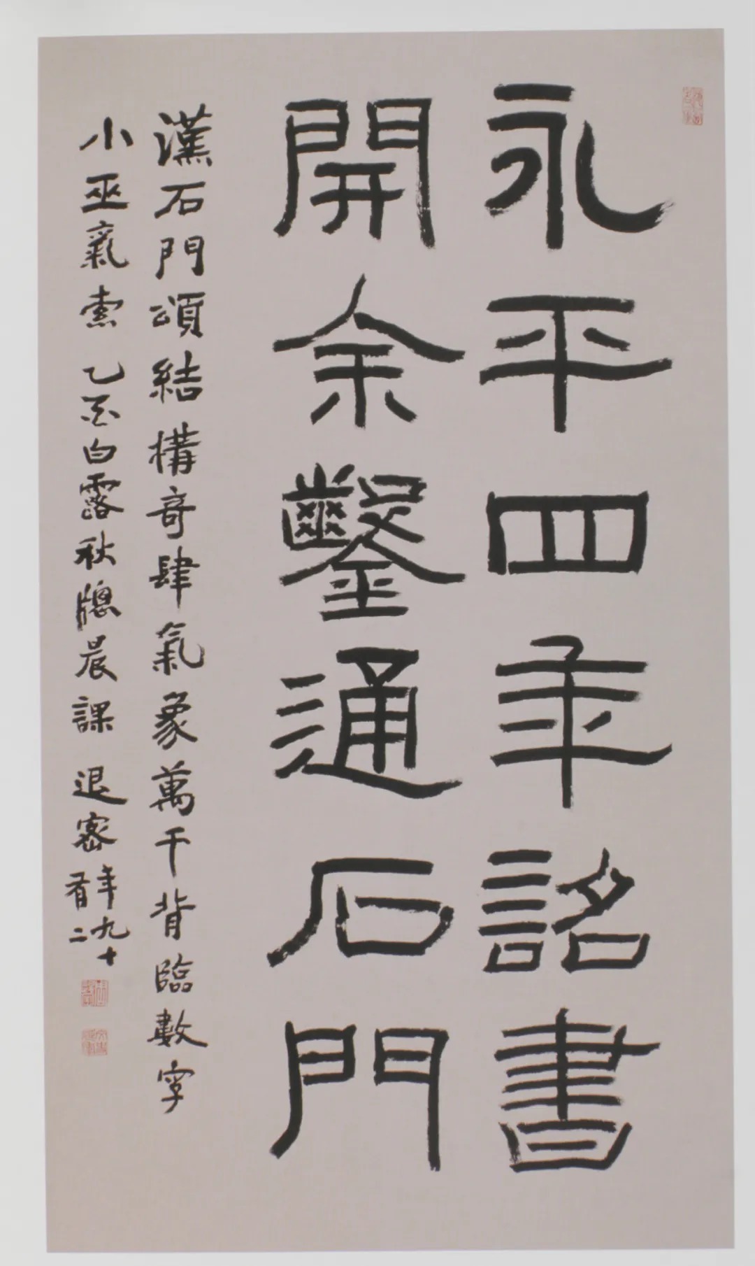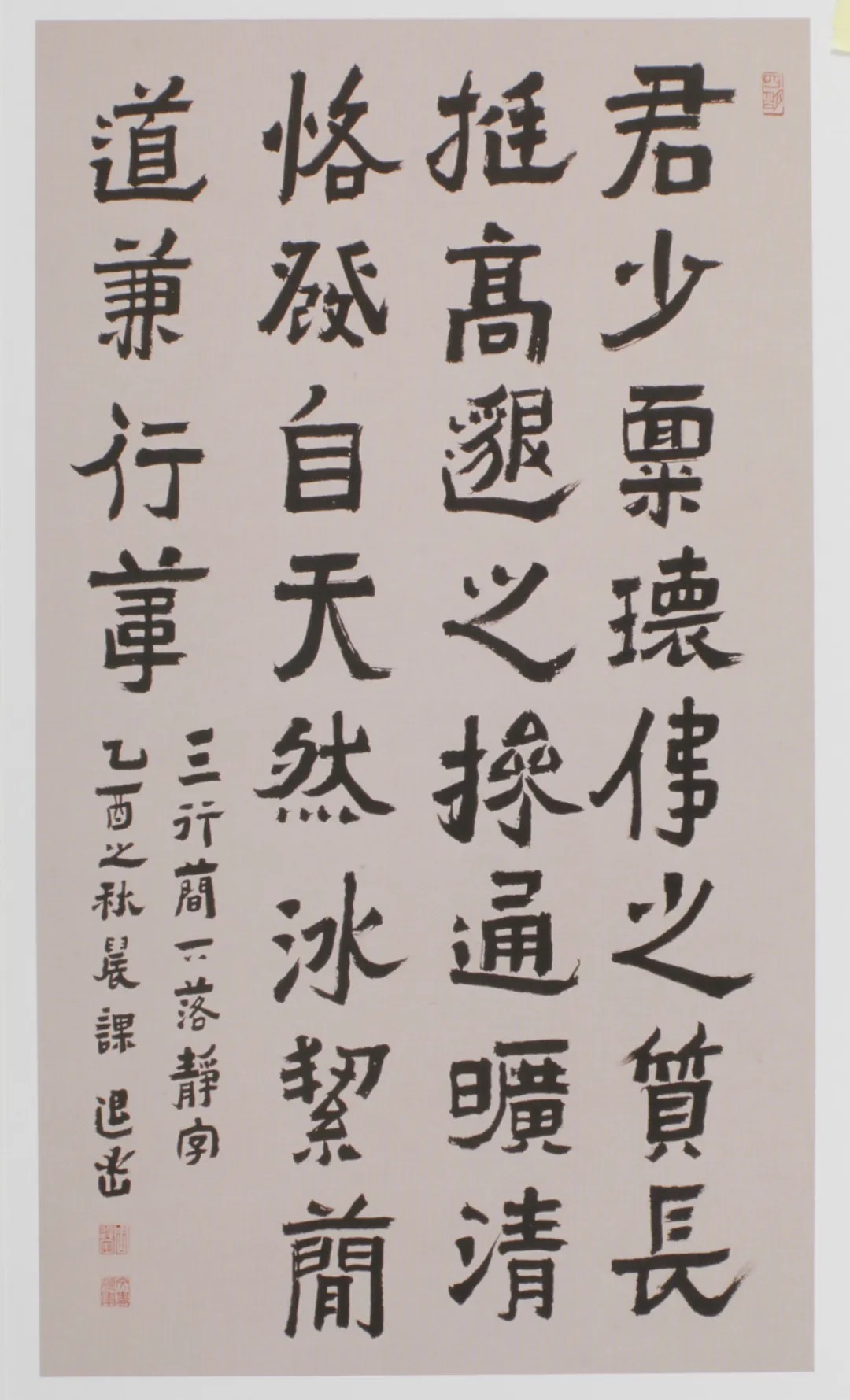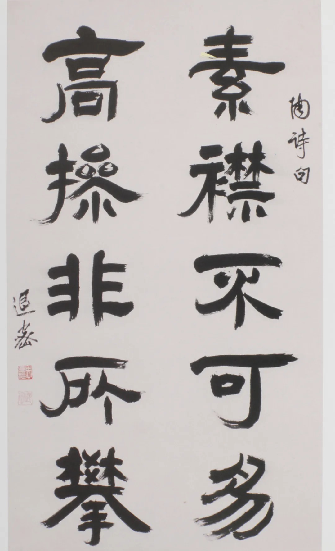 显然,周退密书法筑基深厚。我有幸听他谈学习书法过程:从欧阳询入手,上溯二王,临写《兰亭序》《圣教序》几成日课。隶书从《华山碑》起笔,转至《礼器碑》,后对清代篆隶发生兴趣,研习朱彝尊、郑谷口等人的作品,力求书法语言的凝练、书法风格的凝重。周退密对清代隶书的青睐,我的心为之一震。清代隶书是中国书法发展史重要的一环,艺术魅力不断被重新发现,周退密在清代隶书中看出了不凡,说明中国书法史在他的内心世界里头尾相承。当然,这也是周退密艺术理性精神的体现。