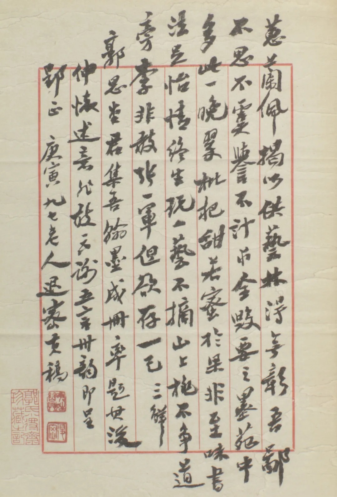 二〇〇七年,我和斯舜威担任策展人的“心迹·墨痕:当代作家、学者手札展”巡展在北京首展,展品系当代作家、学者的手札、诗札,甫一亮相,争鸣声不绝于耳。周退密是这个展览的特约作者,也是最年长的作者,他的手札和诗札同时展出,引起观众极大的欣赏兴趣。应该说,周退密的手札、诗札作品,是展览的亮点。手札形式契合古法,诗札的诗歌和书法同样典雅,从书法的角度看,无可挑剔,从文辞的方面欣赏,也会心满意足。“手札展”先后在北京、石家庄、烟台、东莞、杭州、深圳、大连、营口等地展出,我一路跟随,一是倾听观众的意见,一是感悟作家、学者们的墨迹。每一位作者的作品都有特点,不过,从手札、诗札的完整性上来看,周退密先生的作品无出其右者。如果评奖,一定是唯一一等奖的获得者。