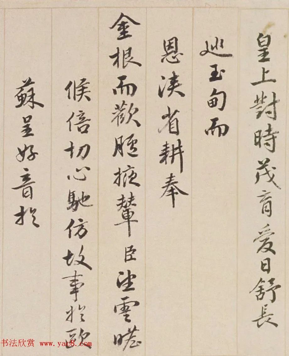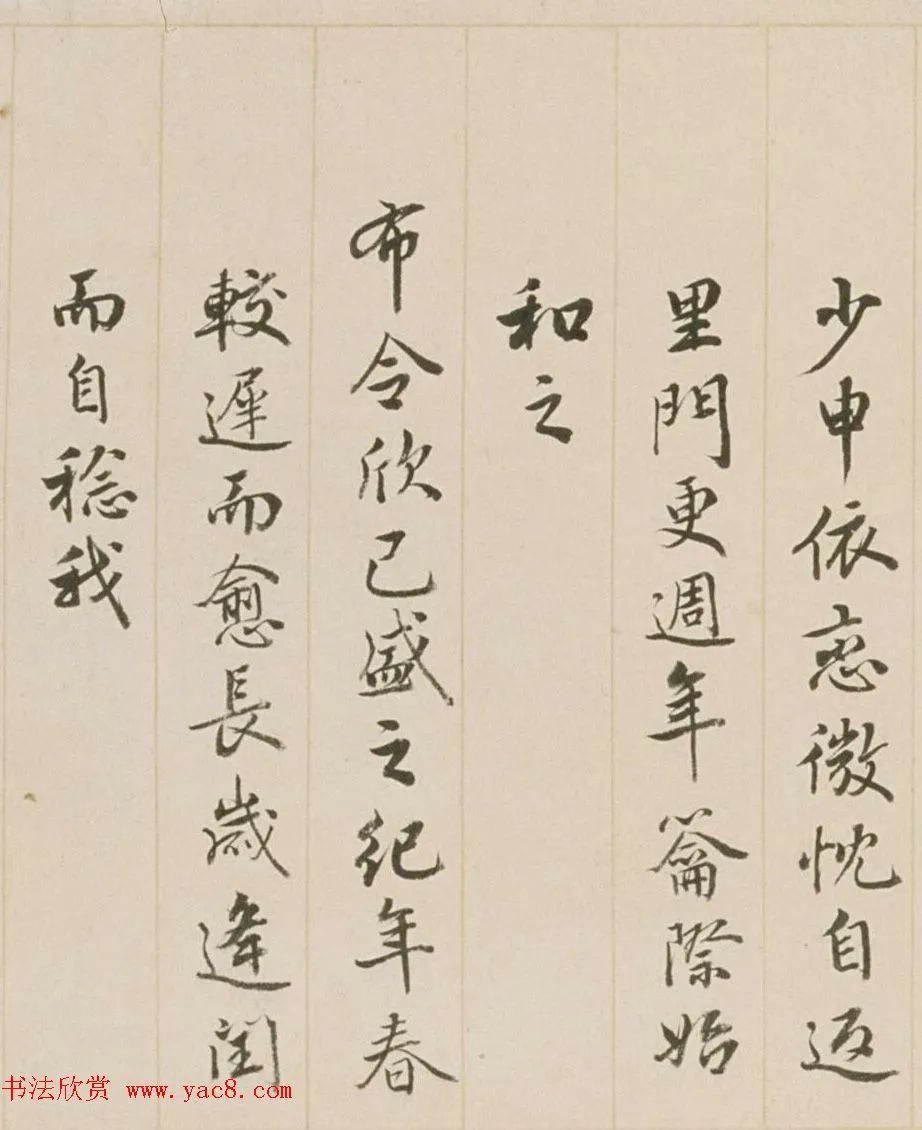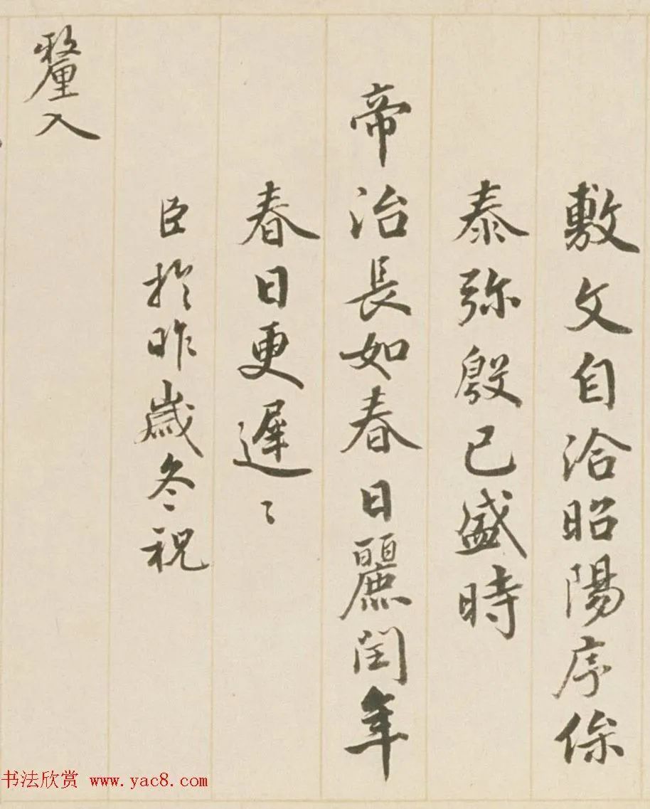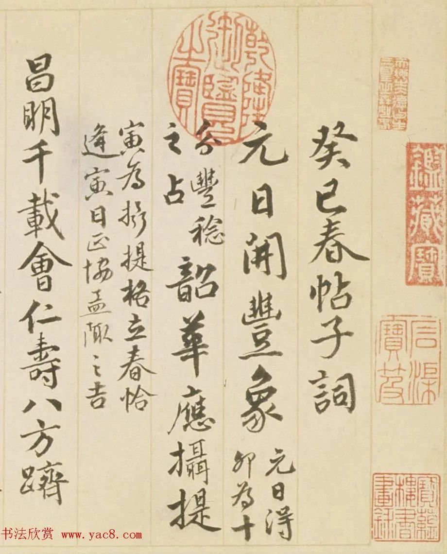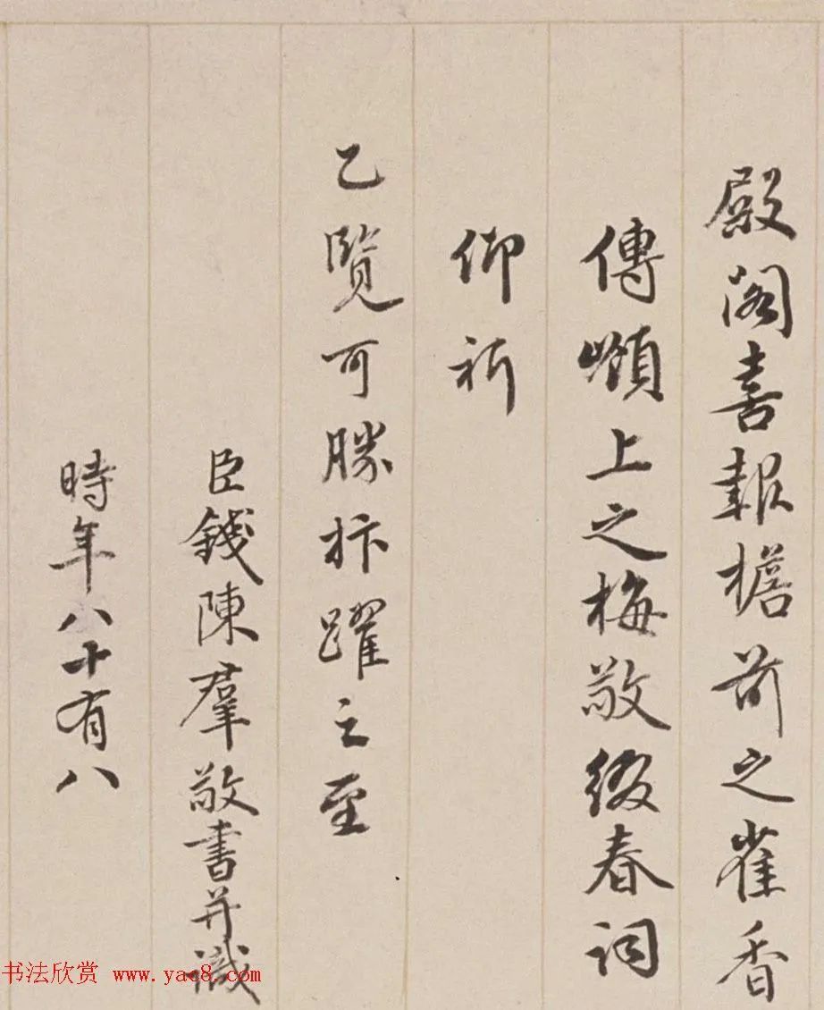 臣于昨岁冬祝釐入觐,礼成后陛辞出都。积十年而仰近天颜,才浃月而即违禁御。涂次将届元辰,恰迎令节,曾恭进帖子,少申依恋微忱。自返里门更周年,籥际始和之,布令欣己盛之纪年,春较迟而愈长,岁逢闰而自稔。我皇上对时茂育,爱日舒长,巡玉甸而恩浃省耕,奉金根而欢胪掖辇。臣望云瞻候,倍切心驰。仿故事于欧苏,呈好音于殿阁。喜报檐前之雀,香传岭上之梅。敬缀春词,仰祁乙览,可胜抃跃之至。臣钱陈群敬书并识。时年八十有八。
