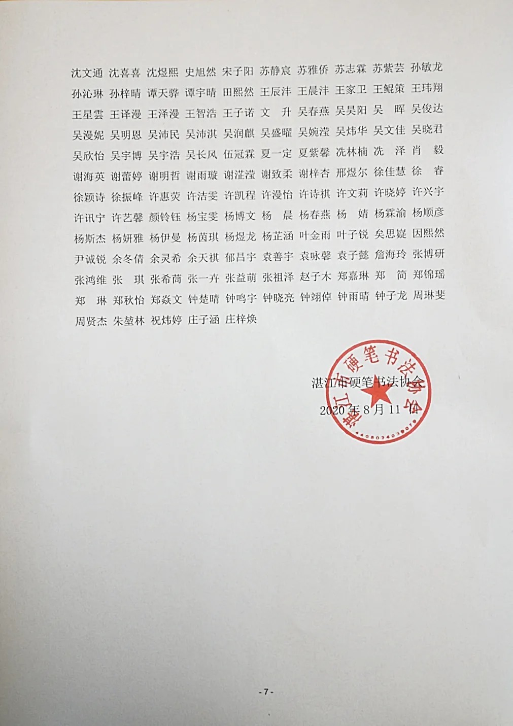 2020年8月9日, “传承·复兴”杯湛江市硬笔书法大赛评审工作在恒逸国际酒店举行,对前期线上初评和网络投票确定的1400余名入围选手作品进行复评。参加本次作品复评工作的评委分别为湛江市书法家协会主席周军,副主席林宏,徐宏成,庄晓东以及湛江市硬笔书法协会主席黄宗吉,副主席符碧福,梁进养,秘书长唐礼文,监事长梁学忠,规范字委员会主任郑吴区等。四个组别共评选出特等奖26名,一等奖47名,二等奖106名,三等奖222名以及优秀奖若干名。现将获奖结果公布如下: