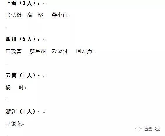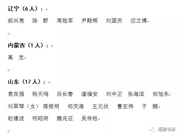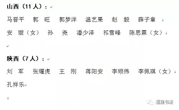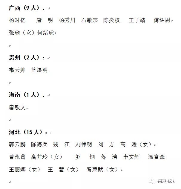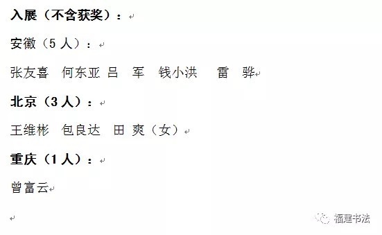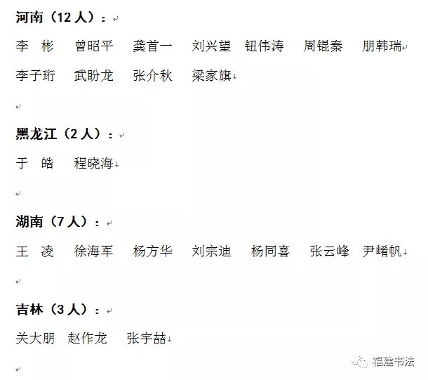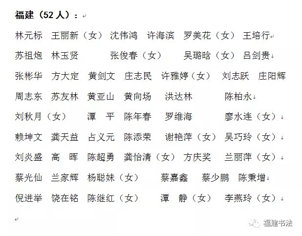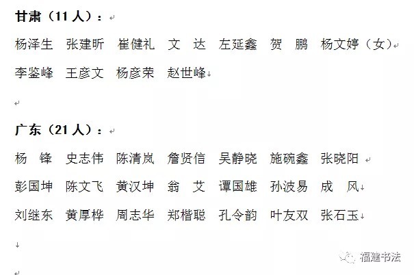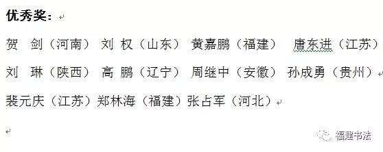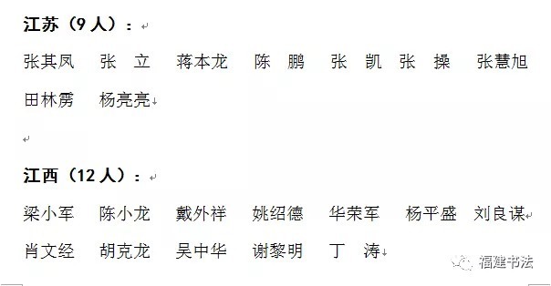 由福建省书法家协会、龙岩市文学艺术界联合会、长汀县人民政府等主办的“迎接世遗大会再现名城风采‘古韵汀州杯’书法作品展”,收到来自全国31个省市区、台湾地区及海外稿件共计3307件,其中来稿量较多的有福建1064件、山东225件、河南197件、广东168件、河北168件、江苏58件。为了保证评审公正公平,参照中国书法家协会的评审办法,分为初评和终评两个阶段进行评审。8月11日,由钟成、朱起明、郑权、贺炜炜、曾锦溪等评委组成的初评组在长汀县书法教育培训中心对所有应征作品进行初评,共评出768件入围作品。8月17日,由刘洪彪、张旭光、高庆春等评委组成的终评组在长汀一中篮球馆对所有入围作品进行评审,共评出入展作品239件,其中优秀作品11件,优秀提名作品11件。终评由余端照、方松峰、王永昌担任监审委员,王期红、曾锦溪为学术观察。现将名单公示如下:
